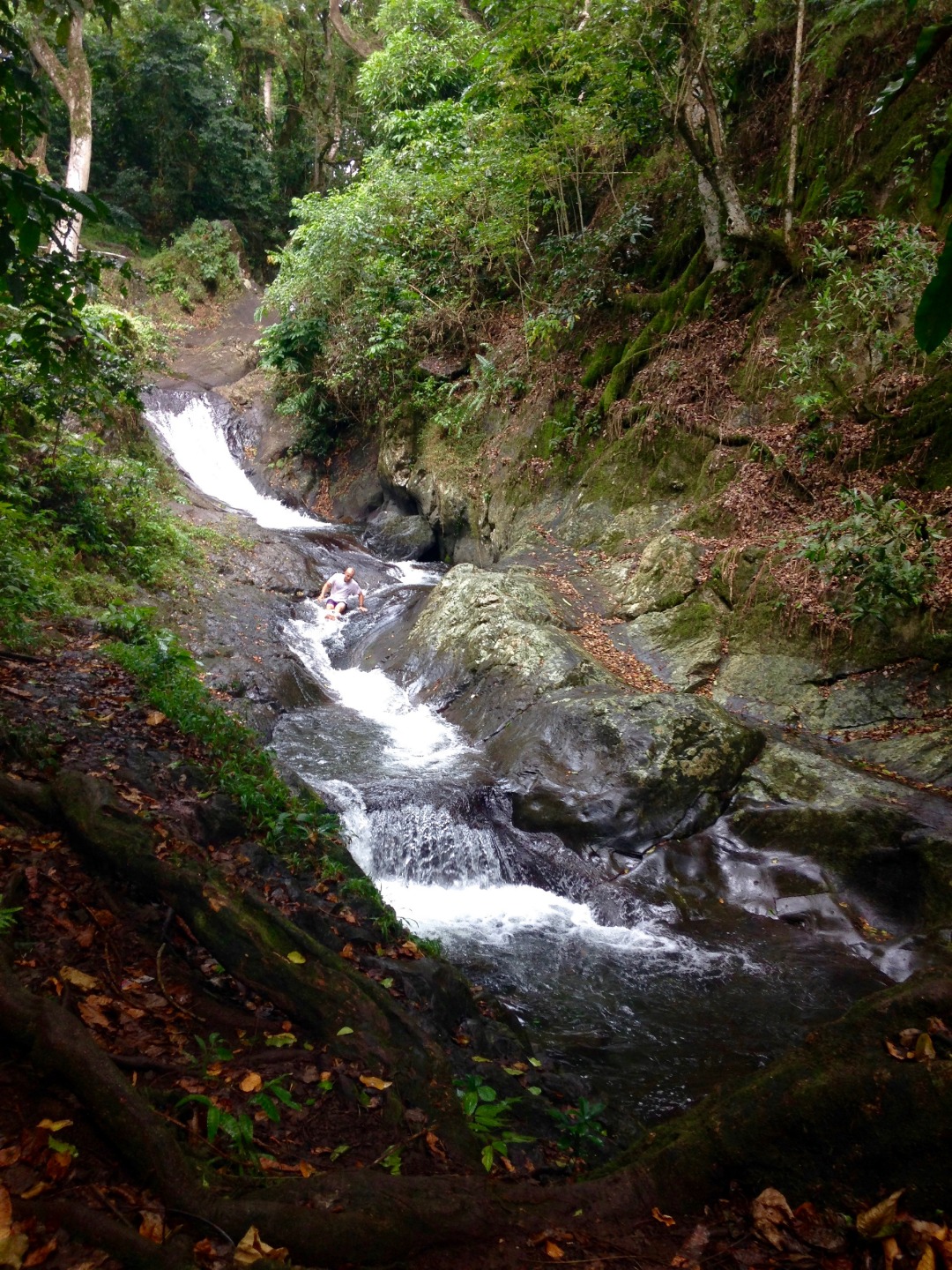 As the sunset blazed across the Pacific sky this morning, the crew of Argo was greeted with a new island, Taveuni. Known as the Garden Island, Taveuni is yet another green island oasis that we are lucky enough to explore! Most of the morning was spent finishing watches and preparing the boat for being at anchor. But the highlight of the day came in the afternoon, in the form of WATERSLIDES! These naturally formed waterslides were tucked into the interior of Taveuni, and the crew spent the afternoon slipping and sliding down the smooth rock faces. The crew was swept away by the fun, and everyone left feeling more energized than this morning. We were treated to chicken shawarma (or tofu shawarma) for dinner, which we can thank Simon, Zoe, and Garrett for. Tonight we have our midterm for Oceanography. Wish us luck!