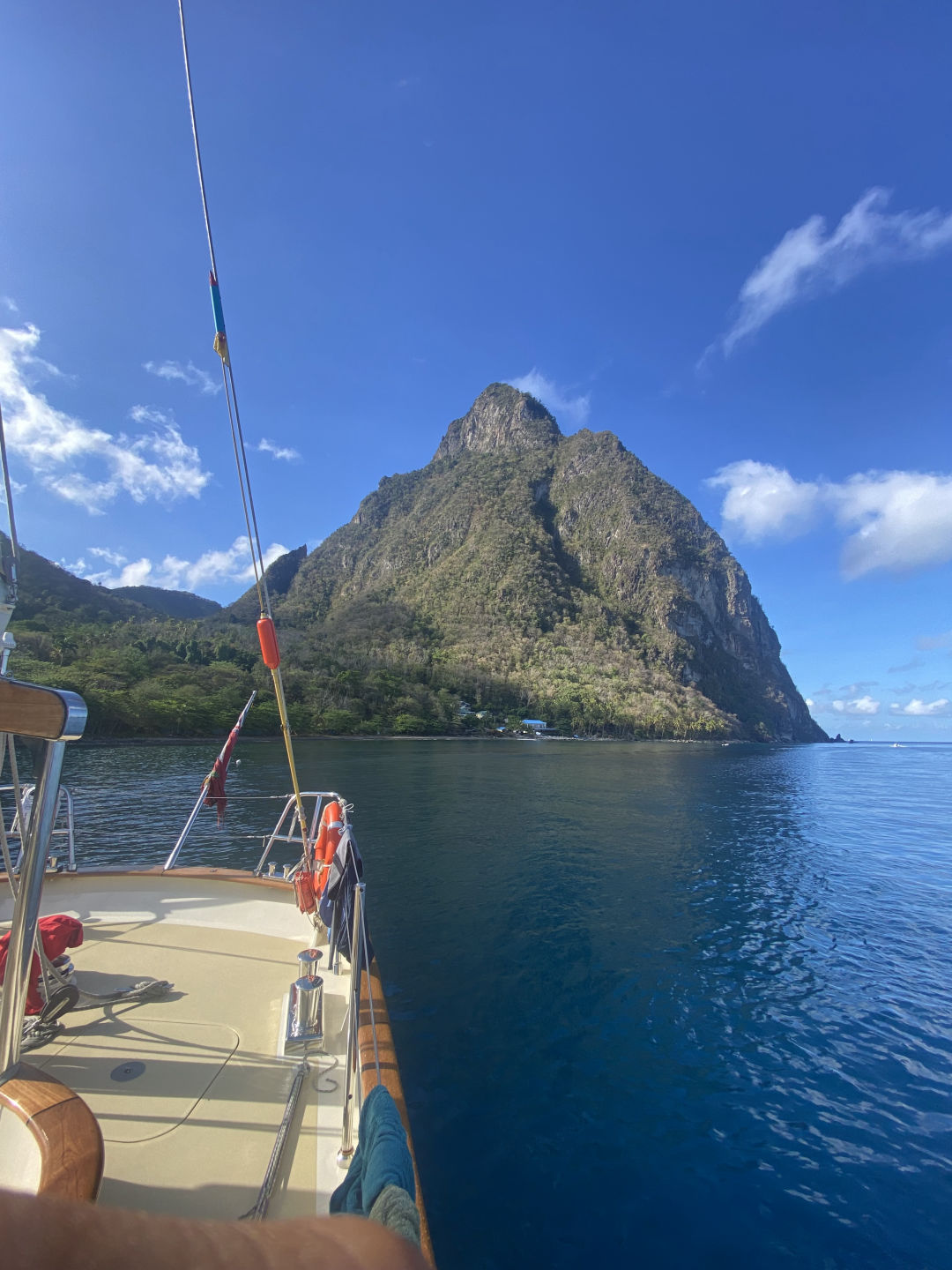 The trip over was quite uneventful, without much wind between the islands. As we approached the Pitons, two mountains (or hills, depending on which member of our team you ask) that will tower over us for our stay, the heavens opened. Watch Team 3 take a soaking as we searched for the right mooring buoy, some opting for oilskins, others just bare skin!
