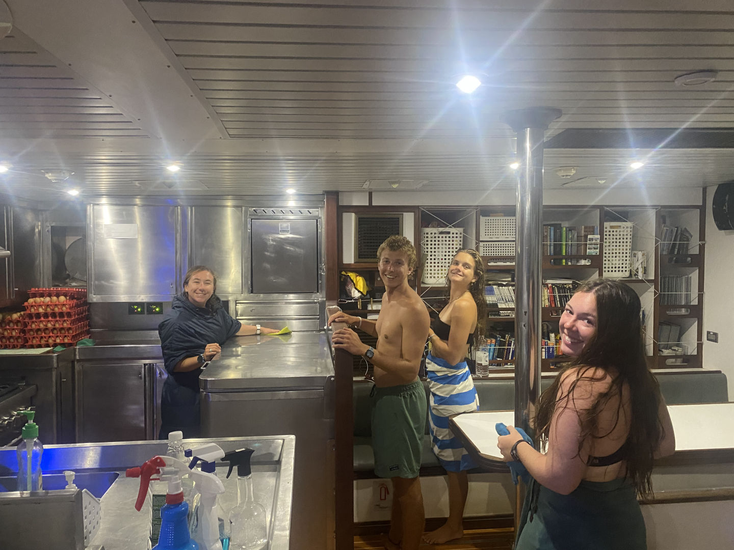The bulk of the day was taken up with a big clean of Argo, the second to last oceanography class (big sad), snorkeling around, and enjoying the supreme clarity of the water- but still not seeing the bottom 35m below. Nat and Claire worked on their divemaster skills with a deep dive to check out the mooring with Shu just before dinner. A very orange sunset (with something in it) was the background of our dinner and squeeze.
