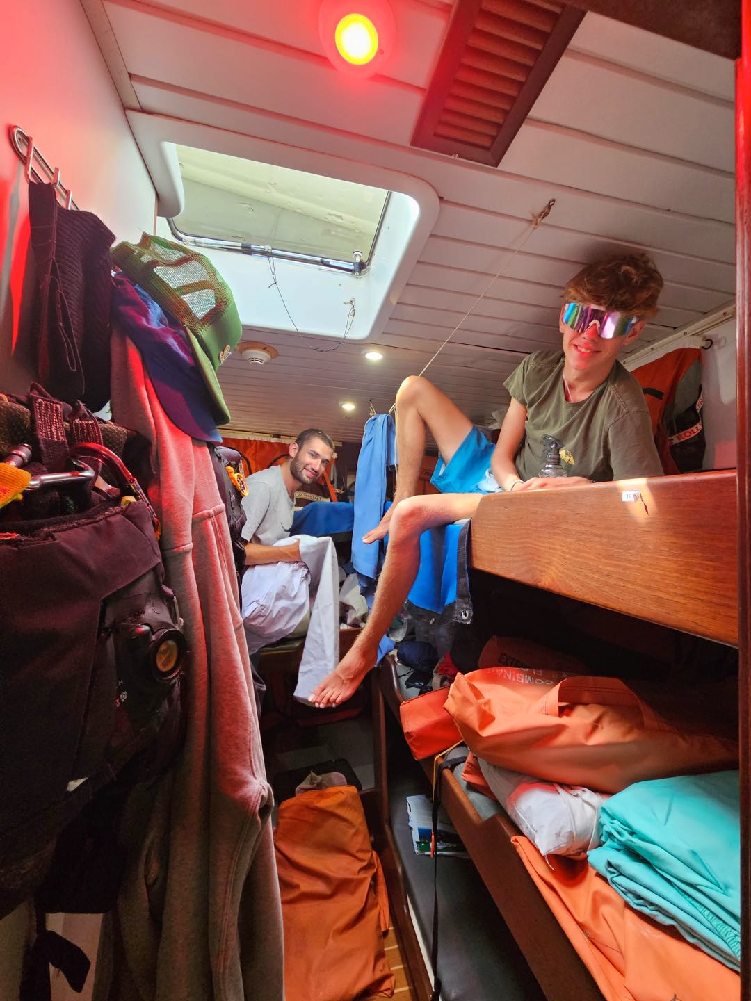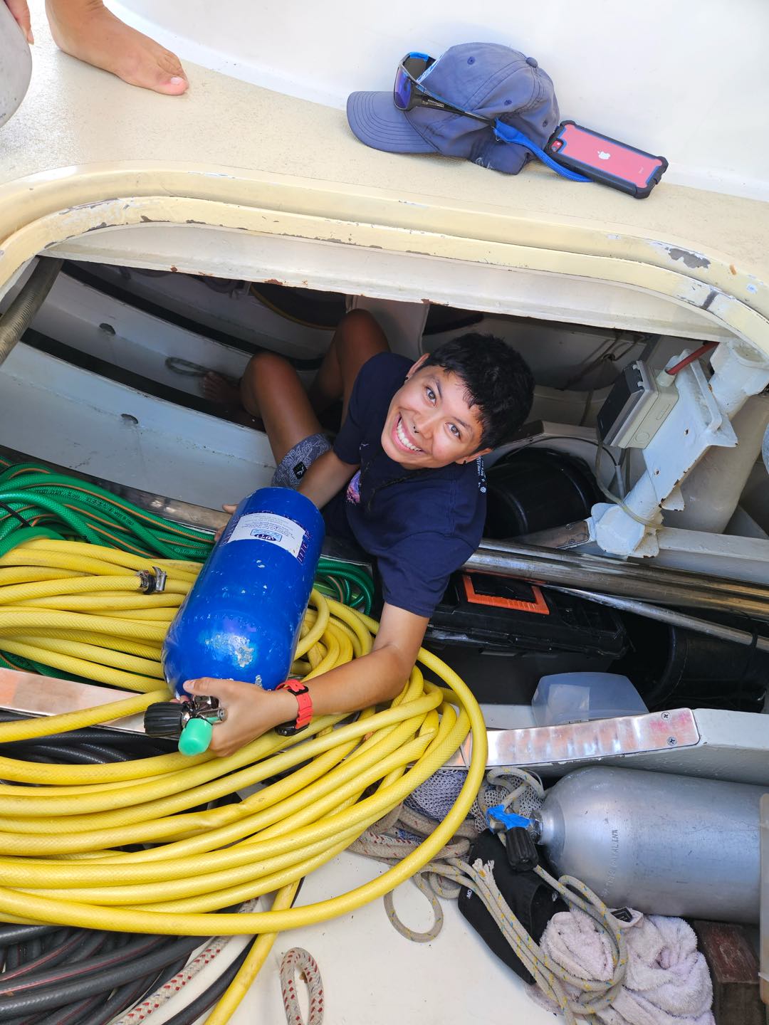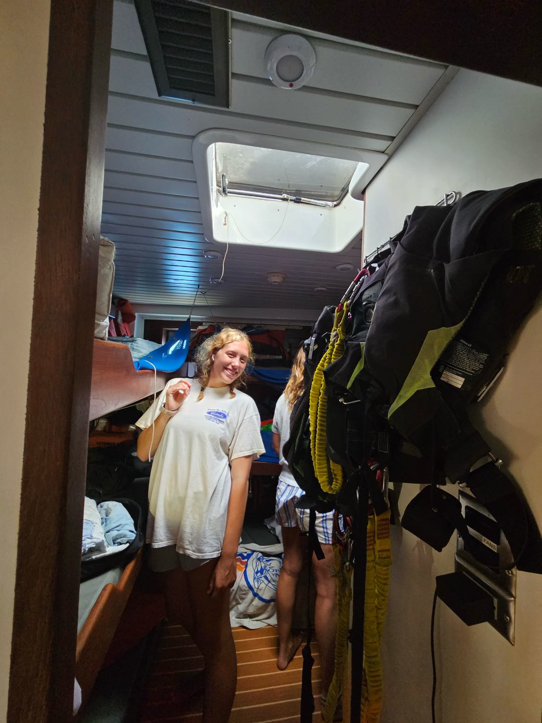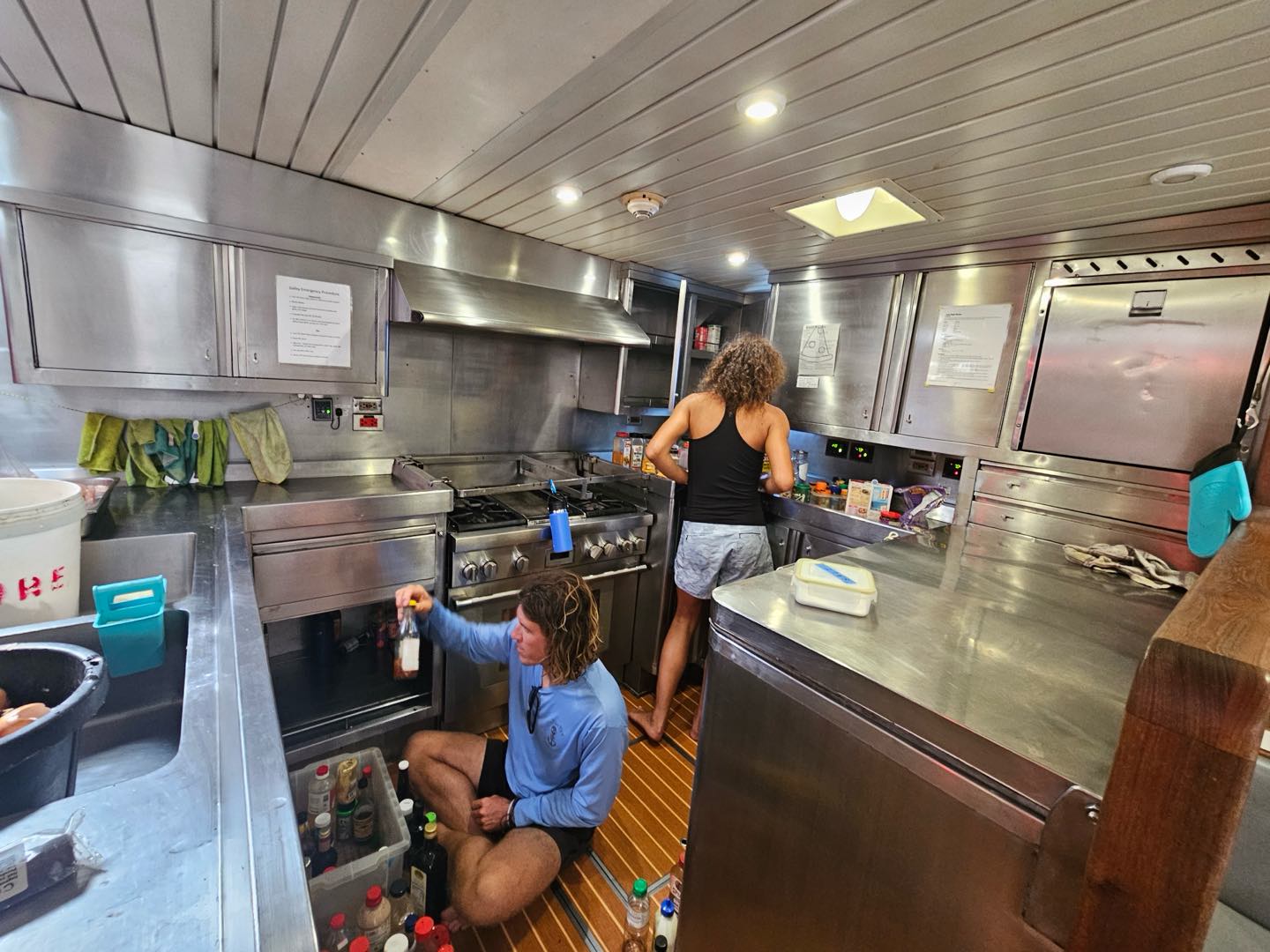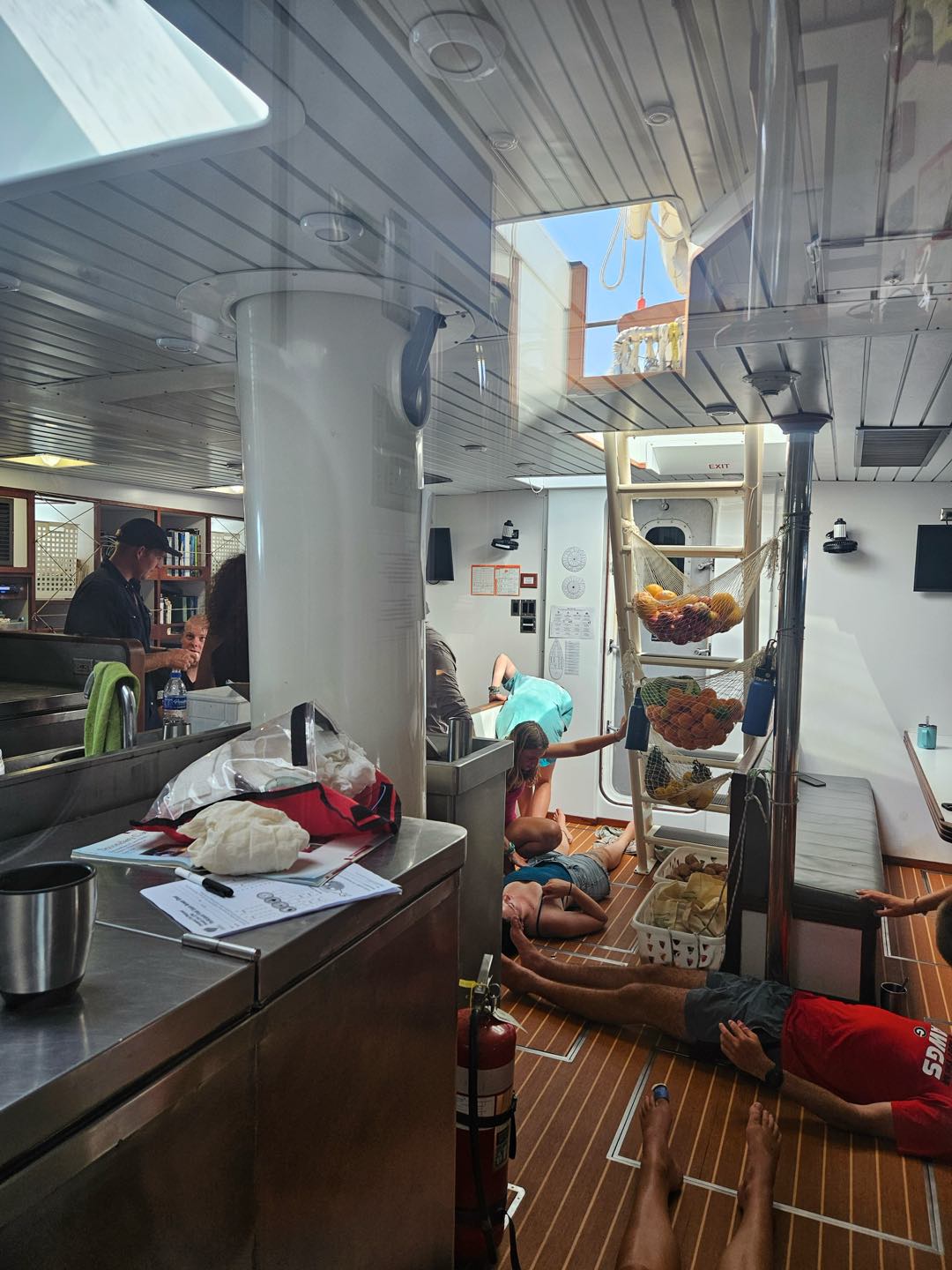 This morning started off with quiet wake-ups, with many people already out of bed reading or working on their upcoming assignments. As it came close to breakfast, Kara and her sous chefs, Eli and Darien, decided that people needed to be out of bed and set off the fire alarm to get everyone to muster in the cockpit. Breakfast consisted of pancakes and frozen fruit, which fueled everyone for a morning BA. Kackie led a team consisting of Talia, Isaac, Benny, Cecily, and Zac on deck getting dive gear away and rust stains removed. Eli spent some time in the engine room with Calum fulfilling his equator talent of oil and rust removing from the engine room bilges. Everyone else was down below with me getting everything organized and scrubbing the floors (which now feel super clean!).