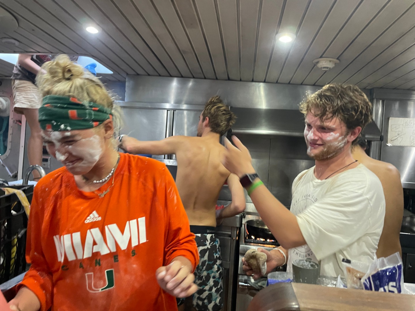 Today began in typical underway fashion with watch team rotations, but we all appreciated the surprise of a yogurt breakfast thanks to the clearing of the fridge for the rest of the trip. Lunch was a delicious meal of Onigiri courtesy of Chris and sous chefs. After lunch cleanup, we spent the afternoon in study hall finishing up some of our last assignments and projects. We were all busy completing our final leadership essay and group research projects while the chef squad worked tirelessly making boba for bubble tea. We also took advantage of smoother waters and clear weather to deck shower before dinner at Loco Moco. After dinner, we enjoyed a dessert of Sydnei’s signature chocolate chip cookies before going our separate ways for the evening.