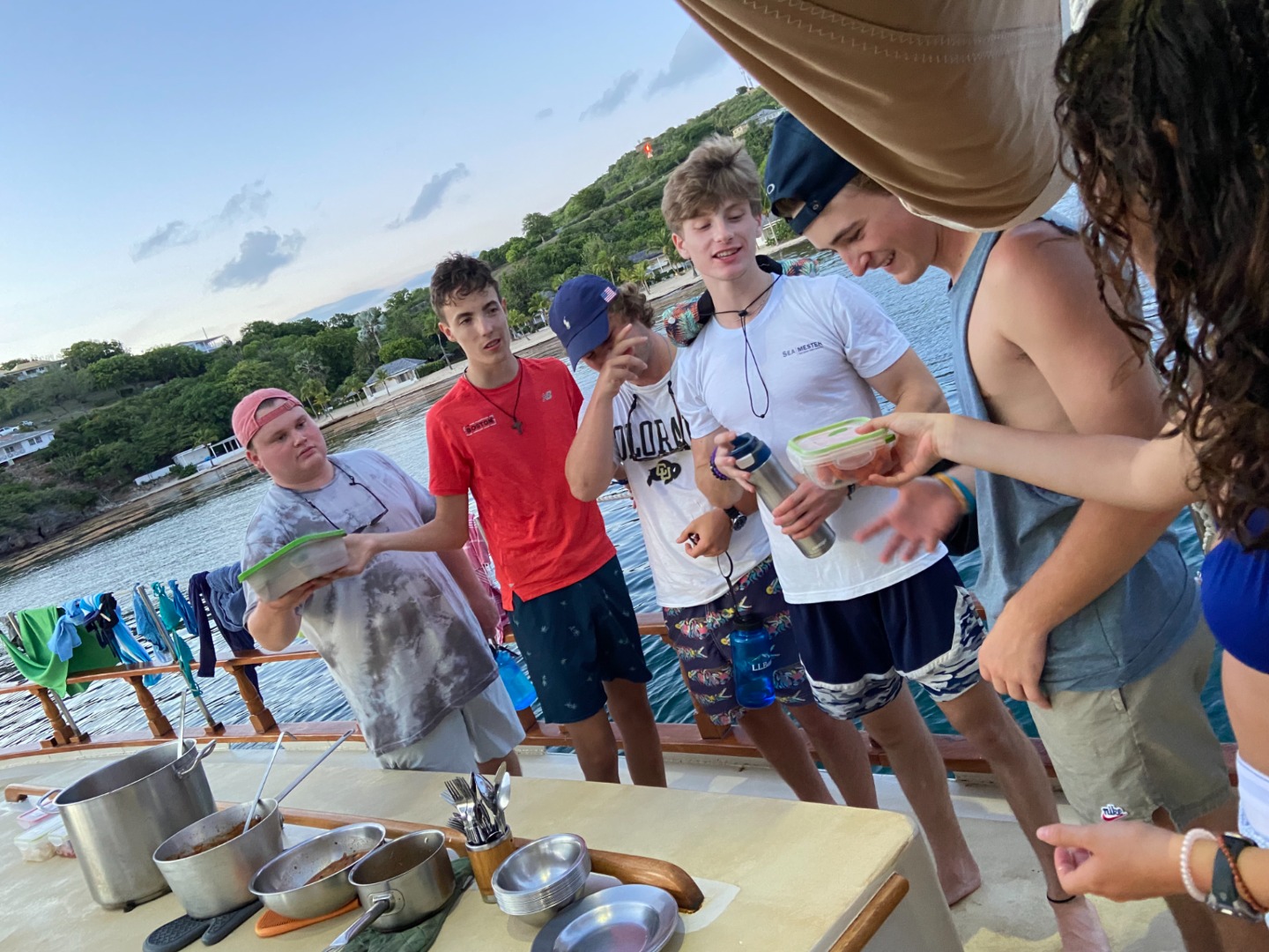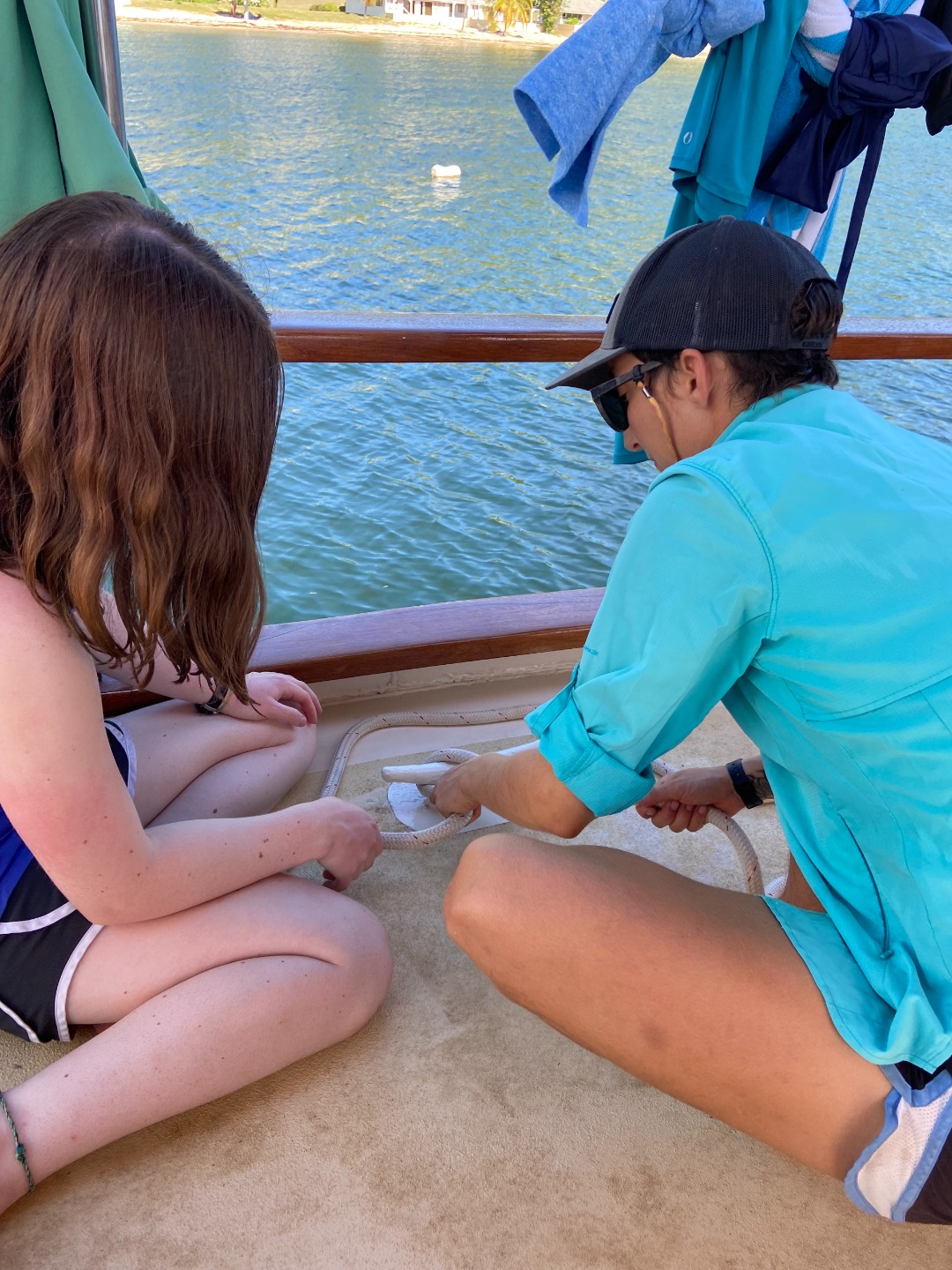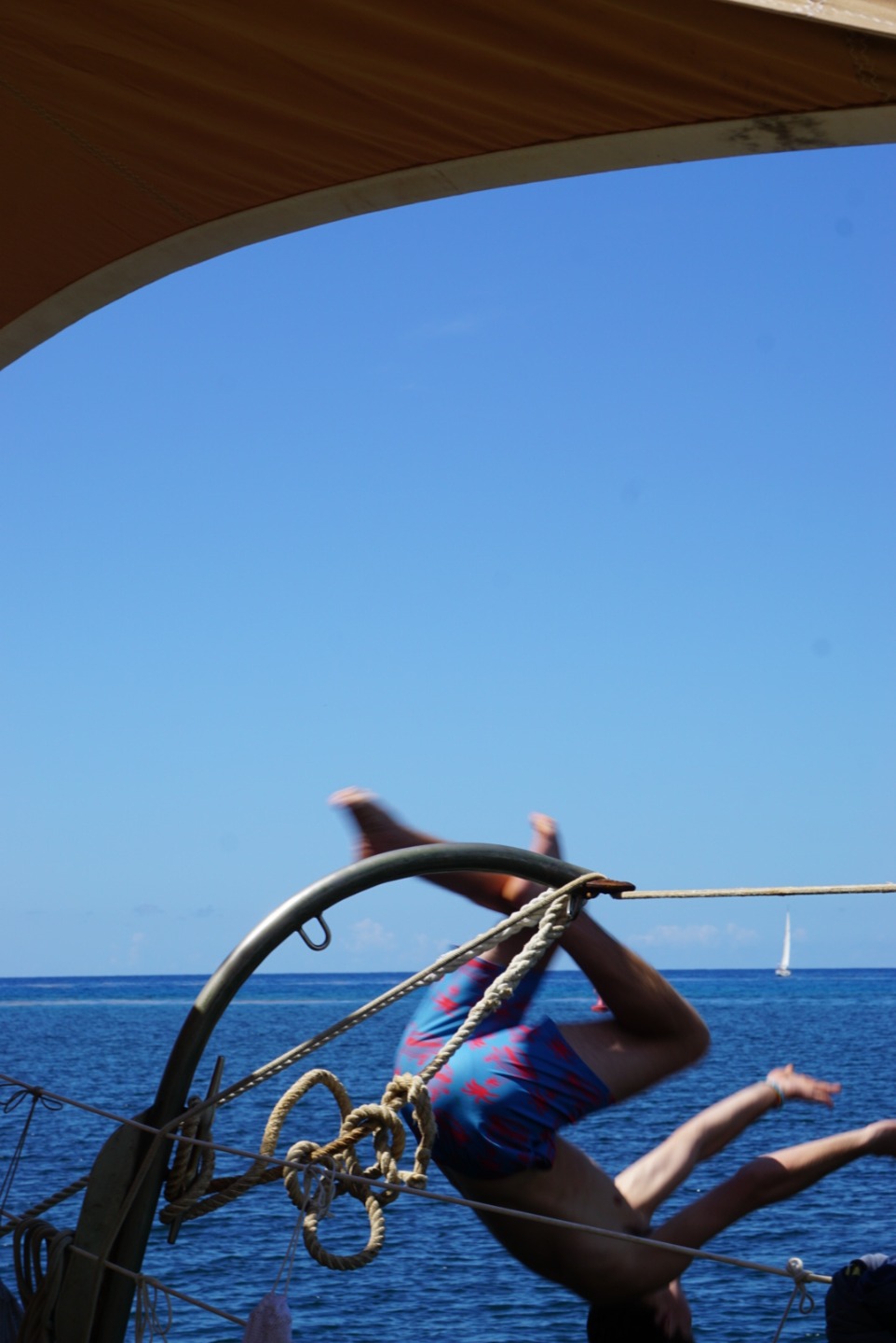 After only four days living in our epic vessel “Ocean Star,” I’m pretty sure that we all spent 90% of the day trying to process how lucky we are to be here 🙂 Today, we started off the morning with an introduction to our Marine Bio and Oceanography classes. After spending the rest of the morning going in and out of the ocean to get water samples and study many cool Bio things I don’t understand just yet, we had an epic deck rodeo where we learned about seamanship and safety (summary: lots of cool and complicated knots). So this morning sounds awesome, right? Wait to hear about the rest of the day. This afternoon will always be remembered among our crew as the afternoon that Stef became our most feared coach. Let me explain: after snorkeling (as the title truthfully says) without snorkels, Stef put her cool glasses and tough coach voice on and decided to design a workout circuit for us to be super fit for the next 76 days. From push-ups to some type of biceps workout she created with a bucket of water, most of us spent a chunk of our afternoon working out together, while whoever didn’t feel like working outset the hammocks for the night. Even though today was full of new experiences and lessons, we also had a lot of our everyday classics: lots of backflips and pictures, lots of hammocks and funny-not funny jokes, lots of Will running into the tiny metal things on deck, lots of Asta and I saying “oh captain my captain” every time we run into Kris, and (of course) lots of me singing “Scuba Sam, Scuba Sam” (to be sang like Spiderman’s theme song). To close up today’s trip log, I must say that today, like every day we’ve been here, felt like a very cool movie full of bad jokes and fun 🙂 Every day that we get to know each other a little better and become a little closer, we realize that we are actually living one of the most epic adventures of our lives and that everything we experience here will be with us forever and will take us exactly where we want to be 🙂