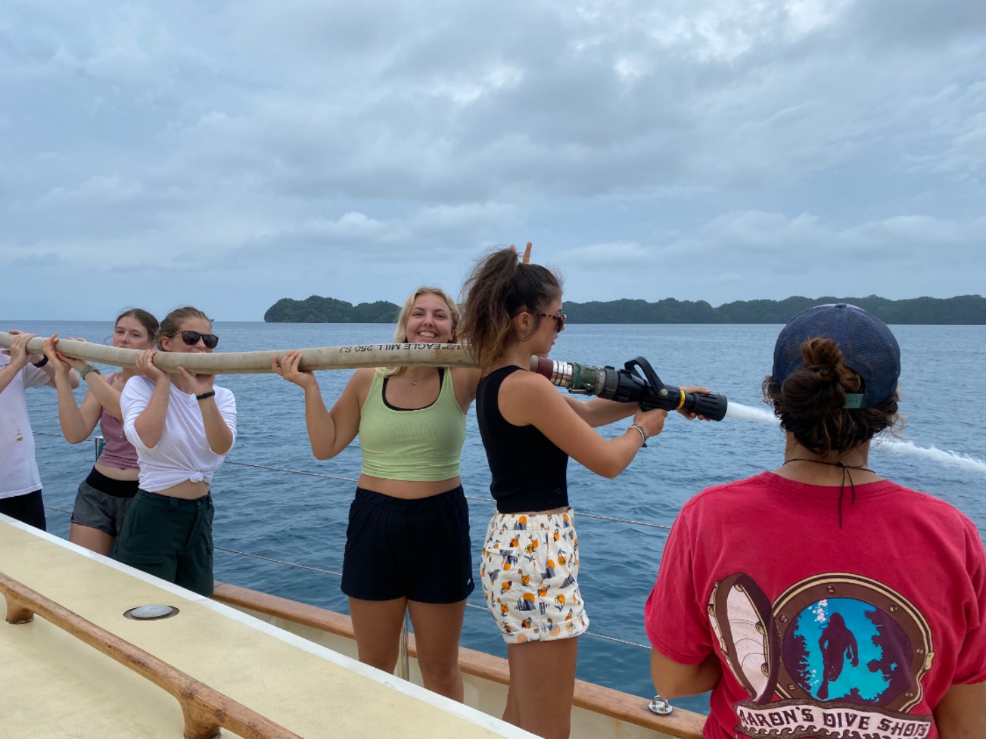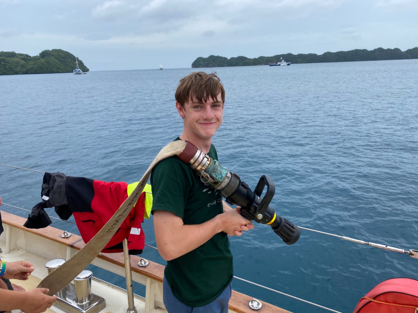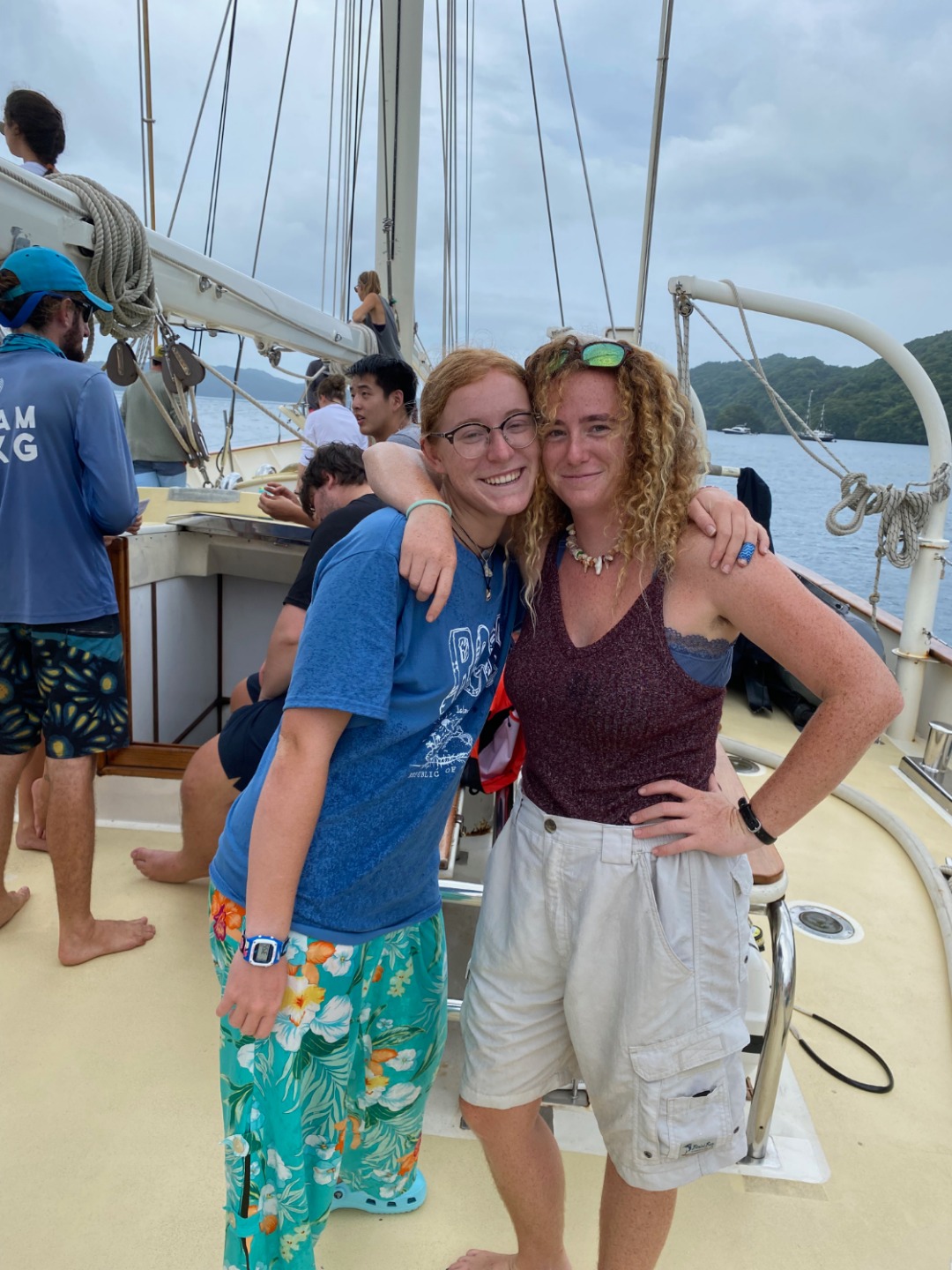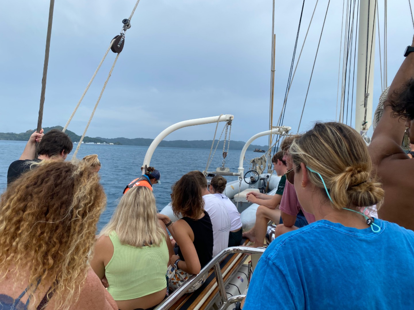 Howdy, y’all. This morning began with the smell of sizzlin’ bacon which became a delicious breakfast of eggs benedict cooked by Chris. After breakfast, we all took our International Competent Crew exam and had marine biology class. After a lunch of spam musubi, we split into our watch groups and went over emergency protocols, and prepared for passage. We had some pretty fun stations where we learned how to handle the sails, set up and use fire hoses, operate the trash pump, and so much more. We also enjoyed a dry dinner for the first time in three days. It was pretty nice to eat a meal that didn’t turn into a soggy soup. After dinner, we ended the night with another honorary dance party before heading our separate ways to finish some homework and go on watch.