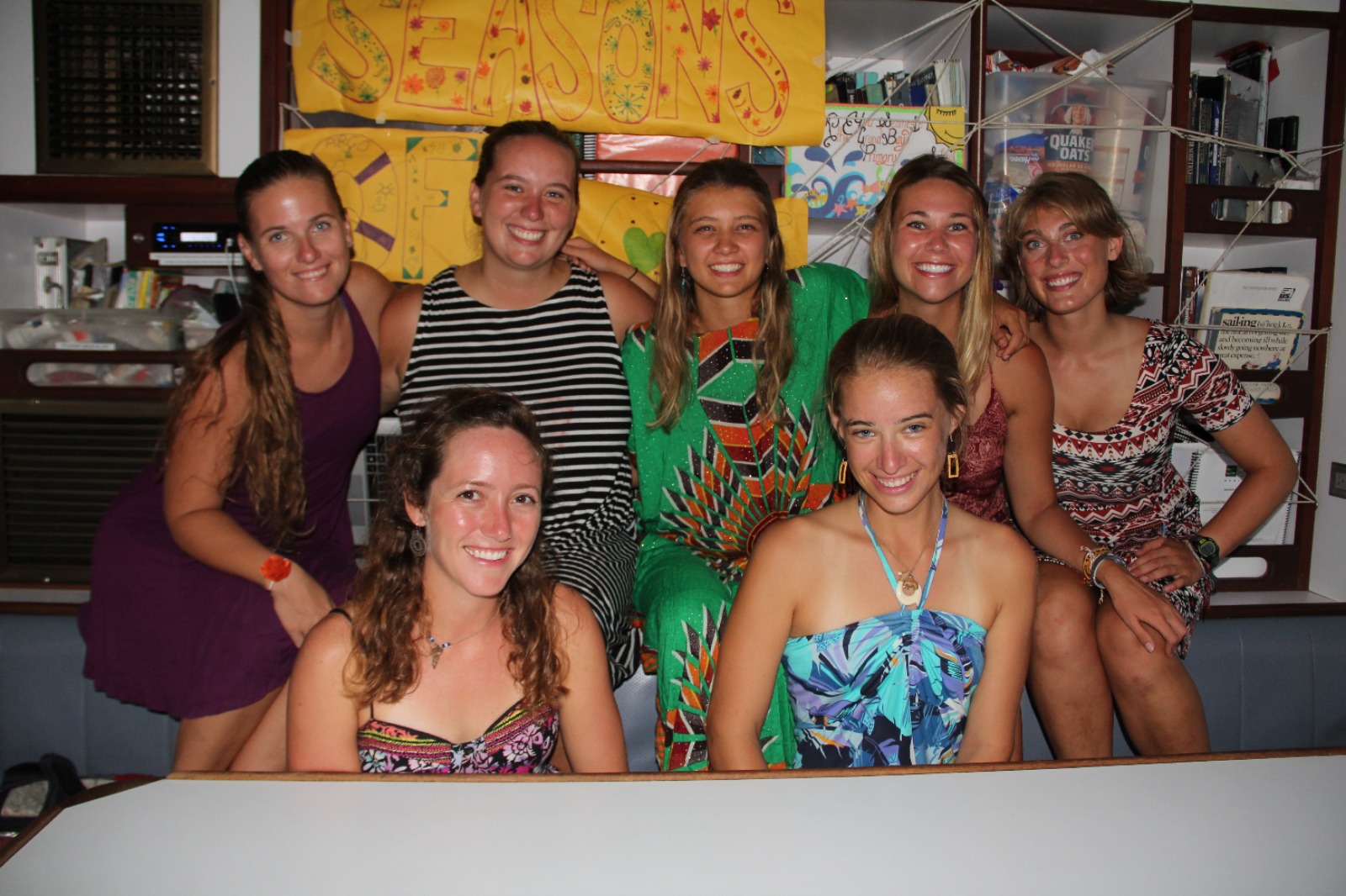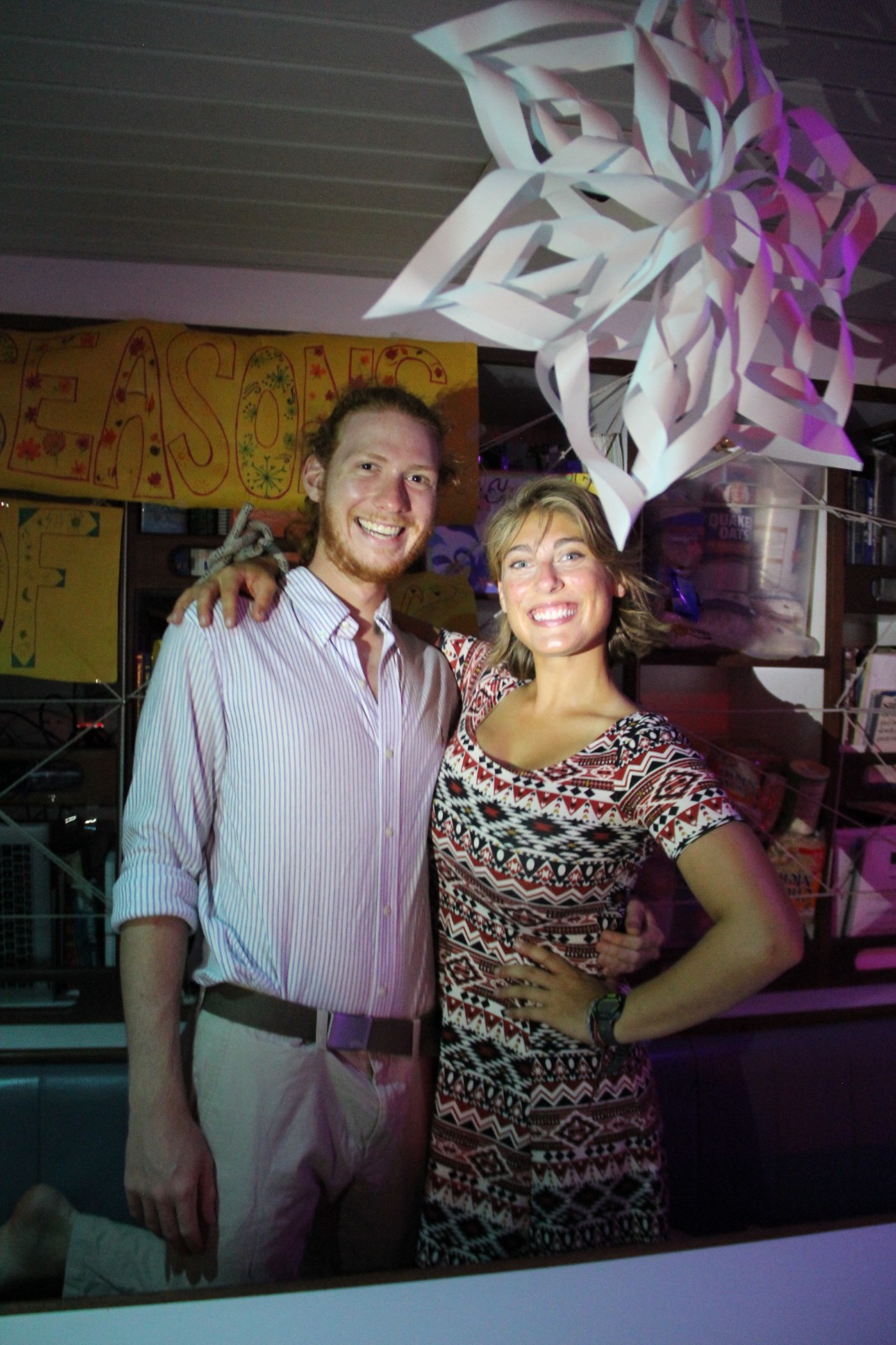 The theme for Prom was “Seasons of Love,” and the head of the decorations committee, Hannah, made some awesome giant snowflakes and flowers, and Audrey and I made a sign. We hung all of our creations in the saloon, as well as various headlamps and tissue paper, to make the regular boring lights look much more prom-worthy! By 8 o’clock, the Argo saloon had made a drastic transformation and looked extra prom-worthy!! All the shipmates arrived in our best clothes and danced the night (or half-hour, one and the same really) away!