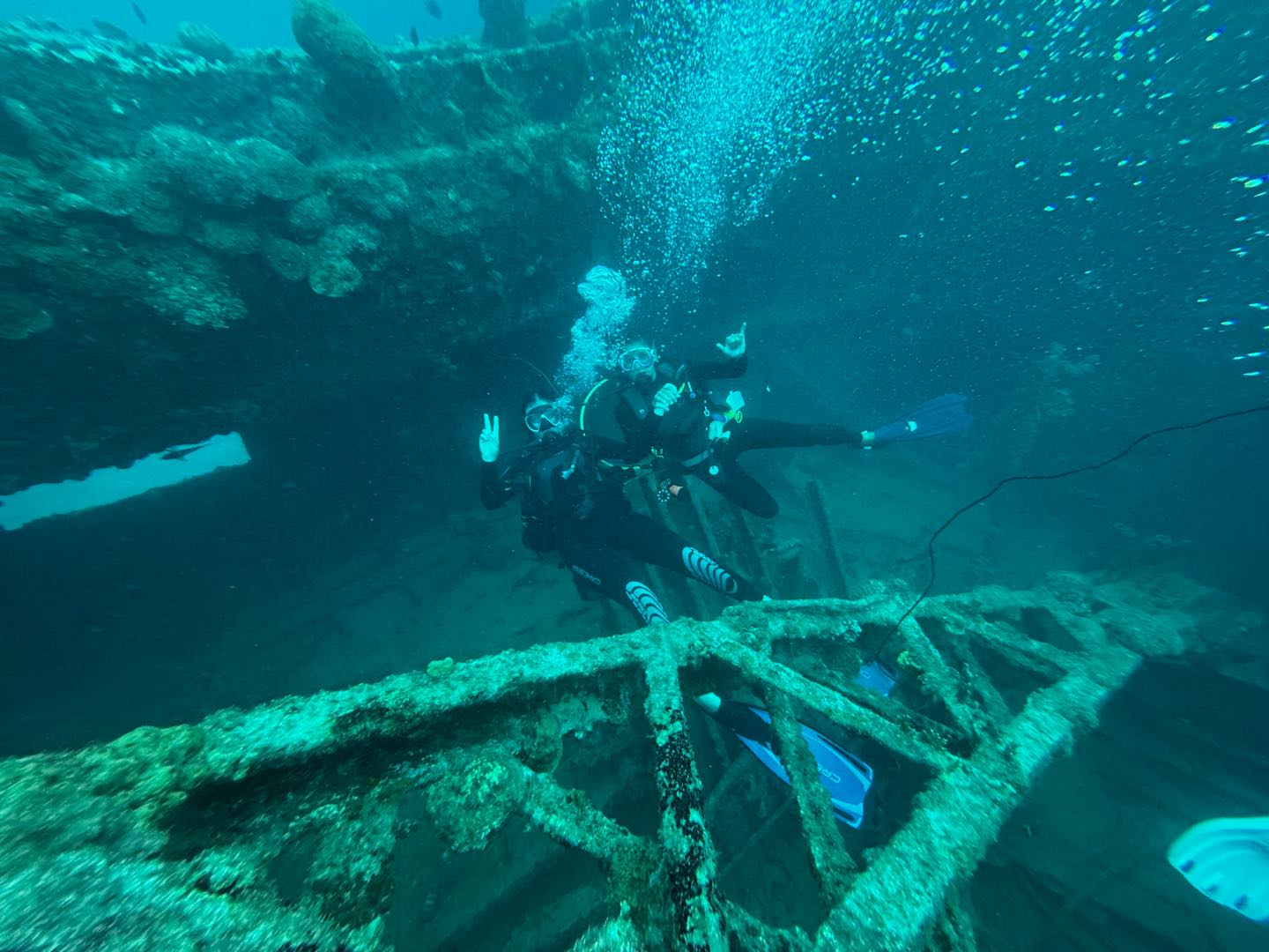 While the newer divers were getting some more dive time under their belts, the advanced divers had some free time on the boat to catch up on academics, go for a swim, catch up on sleep. or read a book (I am currently reading “The Denial of Death”). Once the morning dive group emerged from the depths and came back to the boat, we had a quick lunch before the advanced group did a giant stride off the boat, eager to get below the waves being brought on by a few storm clouds that had moved our way. The advanced diver’s first dive was also a navigation dive but with some more advanced skills. Whenever you dive, you need a buddy for two reasons. Reason 1 is for safety, and reason 2 is so you have someone to share a funny story with (this will make sense in a moment). The five advanced divers descended to the bottom with our staff member Meg, where we were instructed to swim the length of Argo’s hull while keeping count of our kicks, which is one way we can tell how far we have traveled. After this, Meg asked for my dive buddy Kara and me to swim 50ft, turn around, and navigate back. This is a relatively easy task; however, those storm clouds brought some lower visibility than what the morning dive group had. Needless to say, after we turned around and swam back to where we thought our boat would be, there was no boat to be seen. Now, do not panic because we did not panic. In fact, we were laughing under the water at our situation. Our diving instructors, as well as our training in general, prepare us for situations like this. Kara and I took a look around and started to use some of the coral structures that looked familiar and attempted to guide our way back using some clues that nature gave us. I, however, am not Nancy Drew and am not good at picking up on the clues of the ocean. After trying to swim a few different ways while having our compass guide us and not finding the boat, Kara and I decided to surface to avoid getting more lost. We surfaced and turned to see the bow of Argo rather far away, which caused Kara and I to erupt in laughter that neither of us had experienced in our lifetimes. While laughing and debriefing our underwater adventure, we swam back to the bow of the boat and descended to the bottom, where we rejoined the group and finished our navigation skills successfully.