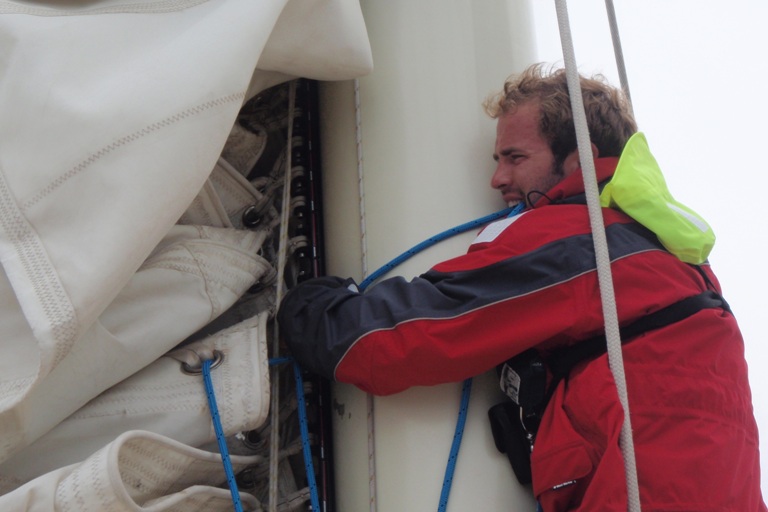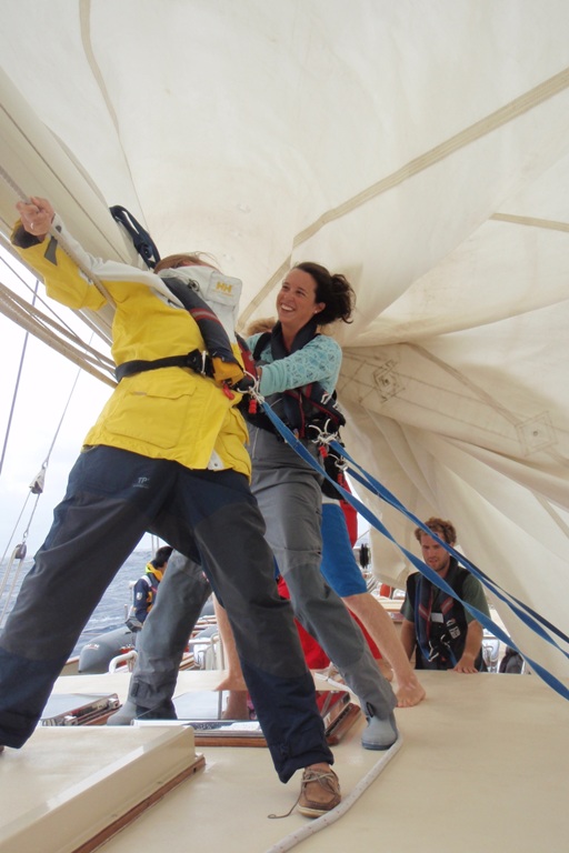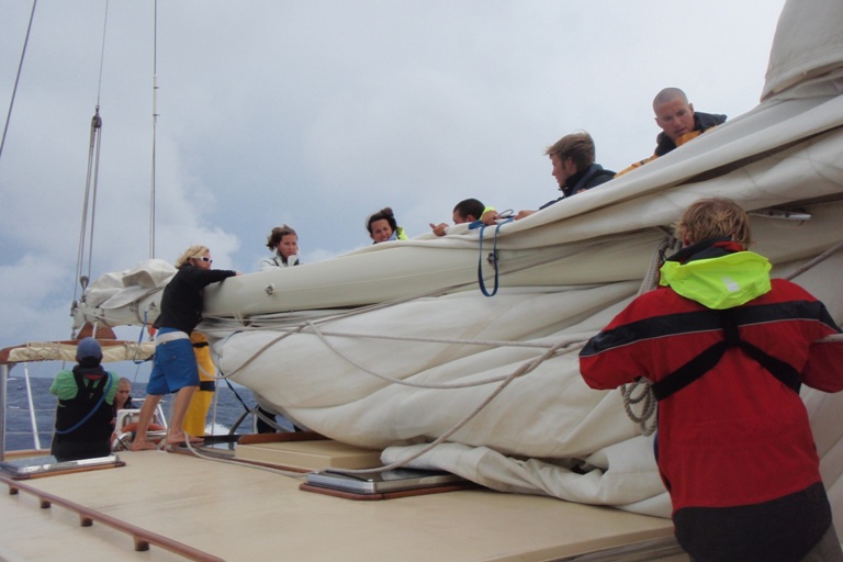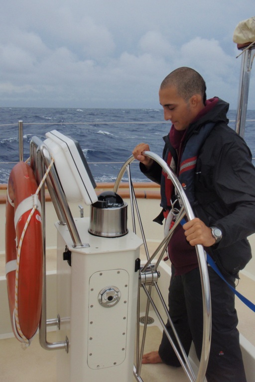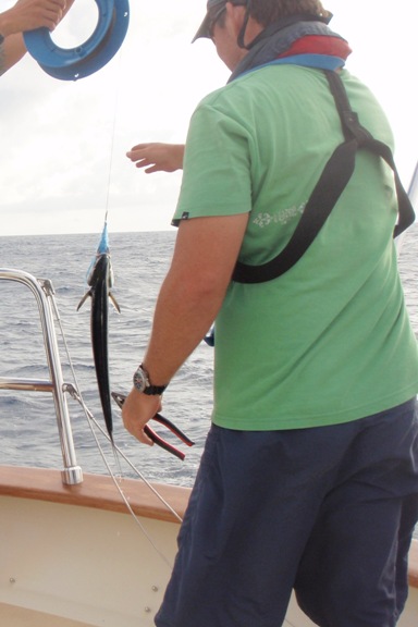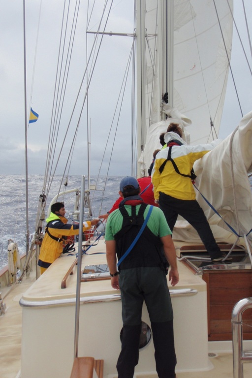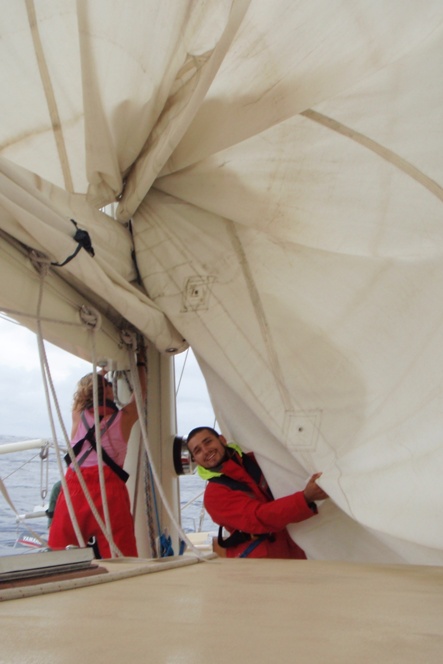 Argo and her Spring 2009 crew have sailed many miles, but Day 50 was a day for the books. The previous night came to a close with very little wind, the hum of the engine, and the striking of the mainsail, leaving the main staysail and forward staysail as our only set sails. As the clocks struck 0300, the wind and the rain began to make quite a show. The watch team on deck looked like a walking foul weather gear ad as the wind blew the rain horizontally across the stern. By 0600, the wind continued to fill the two staysails, but the rain was now just a gentle shower. As the engine was throttled back, the new on-deck watch team longed for Argo’s biggest sail, but the darkness of the early morning hours made it virtually impossible to set. Yet by some magical power, the two staysails enabled Argo to sail at 8 knots, under wind power alone. As the sun rose behind the dark storm clouds, she surfed the 8-foot swells, enjoying the downwind sailing. Soon after sunrise and another watch team change, the reefed main was readied and set. With three sails, Argo took full advantage of the wind as she sailed the “wrong way” across the Indian Ocean. For hours, her crew carefully walked on the windward of the boat, making sure the lunch of pancakes and scrambled eggs remained on the stove, attended SLD and OCE class, and continued to track her course on the charts. Just before dinner, the wind began to fade, and the reef in the main was shaken in order to optimize speed. But the excitement did not end there; another Mahi Mahi was expertly caught and filleted for the next day’s meal. As the evening skies parted and the swells calmed, Argo continued to sail east as her crew enjoyed a delicious dinner amidst the glow of the setting sun.