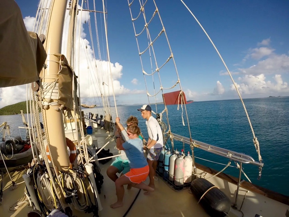 The day began early. The crew was awakened at nigh dawn to lift anchor for Mountain Point, our next destination. The sun rose to greet a cloudless sky and calm ocean. The brief, yet still thrilling, voyage to Mountain Point was smooth. The morning meal was eaten underway to allow maximum time for the day’s activities. We reached the destination and anchored for a day of scuba training.