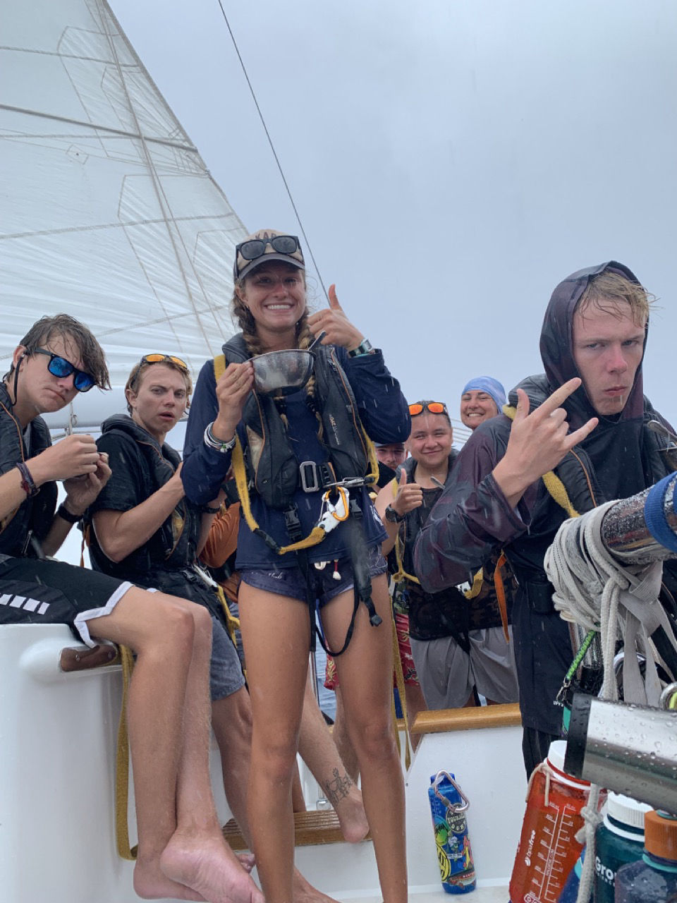 While the students were doing a marine biology exam, a few staff were left on deck. Unfortunately, the rain had sucked away all our favorable wind for sailing, so this meant some staff sail drops in the rain, which is always fun. After all the sails were dropped, I had a water party with Smash. This was pretty much where I would helm the boat and dance while Smash threw water over my head from the 32 water bottles which were on deck. Maybe this could be incorporated into a live music venue with a dance floor and a fire hose.