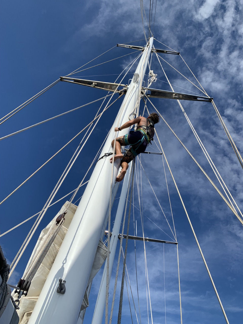 The second-afternoon class was seamanship. This was held on deck where all the students came on deck, and they pretty much instantly went down to fill their now empty water bottles… who knows where that went? Today’s seamanship challenge was to work in watch teams to raise and drop the main staysail. This was a challenge because the watch teams raced for time of the raise/drop and neatness of the infamous sail flaking skill. Working in watch teams of 8, you would assume, could put in some pretty competitive times, which is also what the students thought until Tom, the Captain, beat the best team’s score solo by 3 mins.