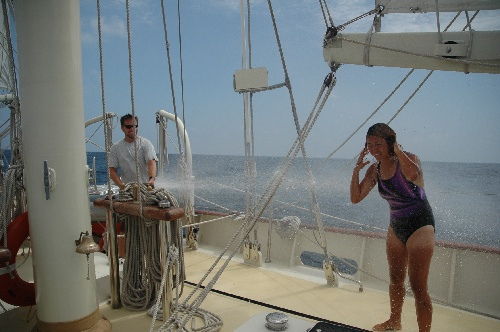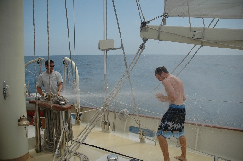 It’s a routine day, beautiful weather as usual. Not a lot of wind this afternoon, but we still seem to be making our way on a strong current at around nine knots. We’re only a couple of days out of the Maldives, and besides our yearning for some more fresh fruit and vegetables, it seems as though we could go on indefinitely. Our excitement for the day stemmed from the loss of our one remaining bucket. This meant fire hose showers on deck at 1500. But I think they were enjoyed by all. One sunset closer to Male.