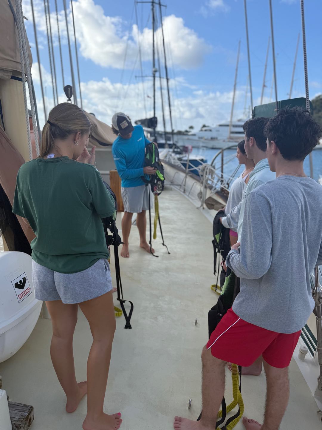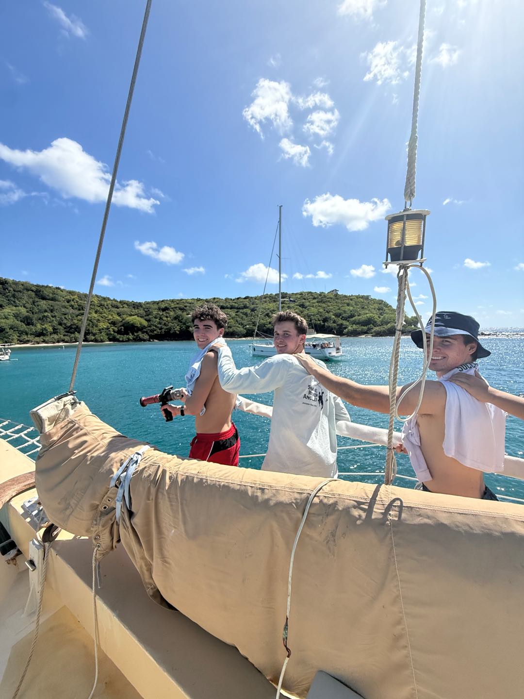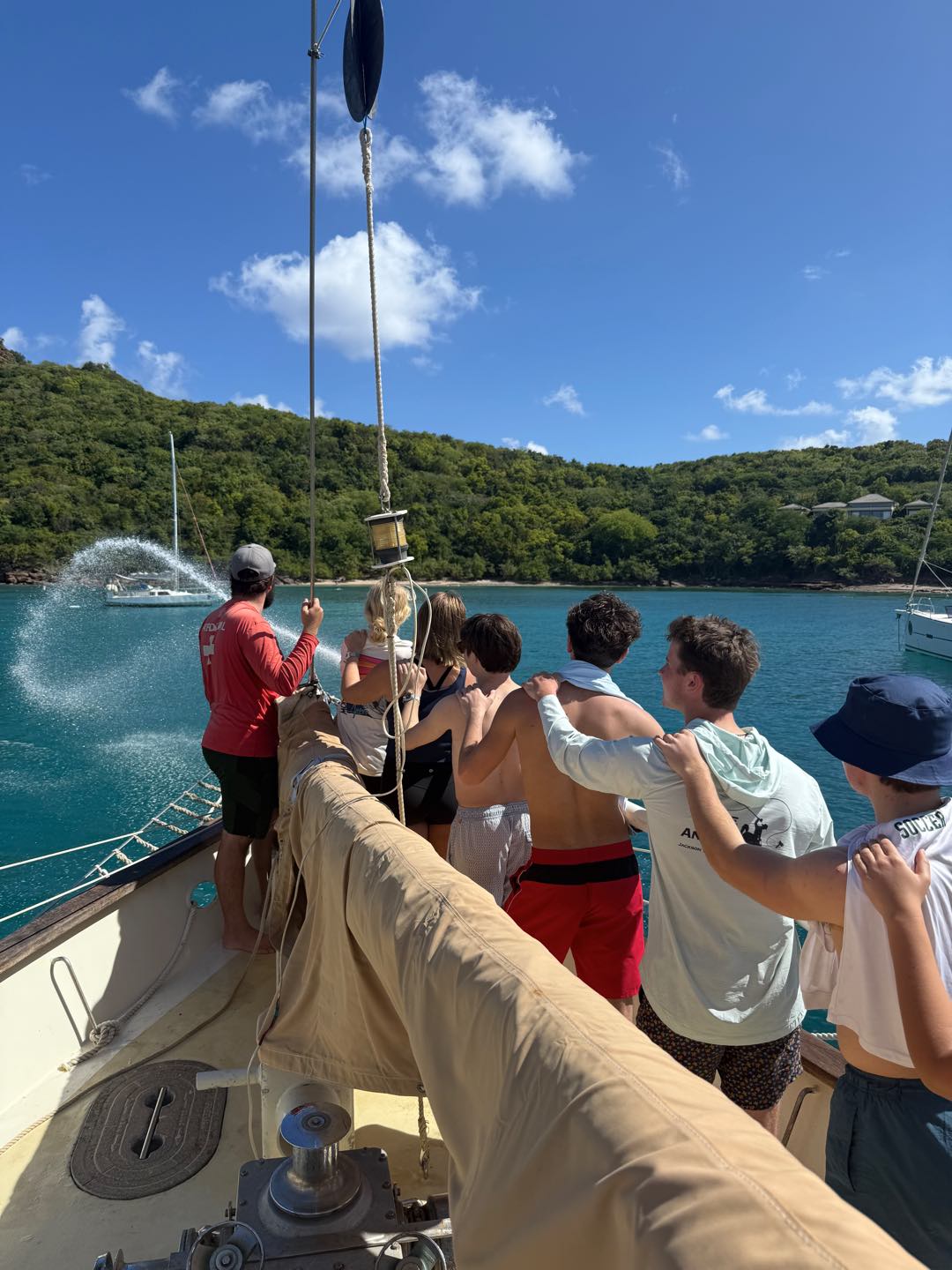 Right as we were going over some emergency protocols, we learned that a few of the boats in the bay next to where we boarded Ocean Star had moved and that we should secure a spot ASAP. So in true Seamester style, we switched plans and got the two boats ready to motor over. We learned how to coil a line and drop the anchor. As soon as we were done, we got ready to jump in the water for the first time and do our swim tests. It was so nice to cool off and have some fun. We even saw a turtle! After drying off, we had pasta salad for lunch as well as some leftovers from yesterday. Then we finished learning about the rest of the safety protocols (fire and evacuation), and we all practiced using the fire hose off the front(bow) of the boat.