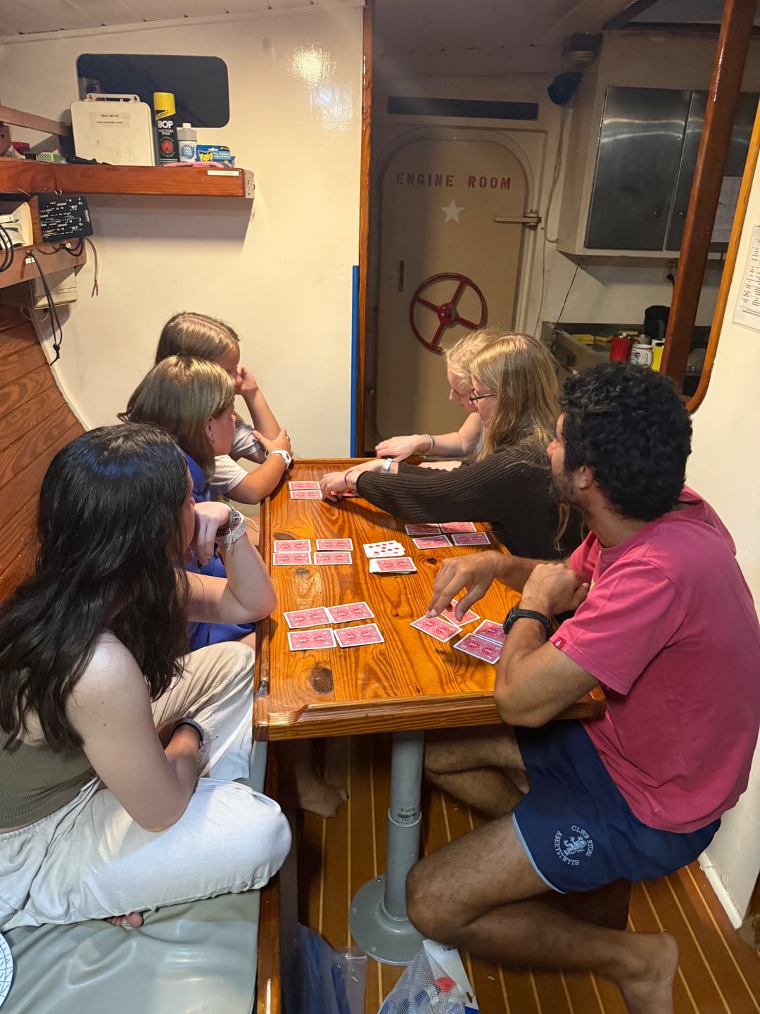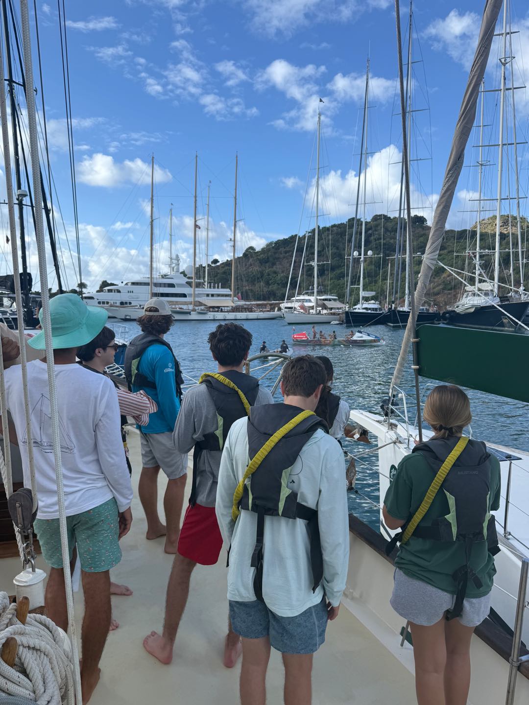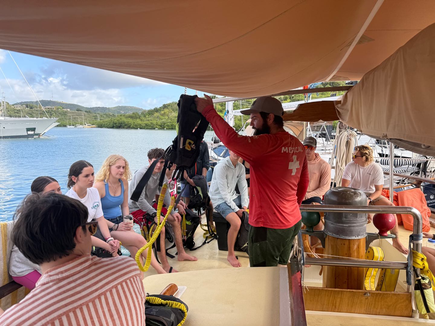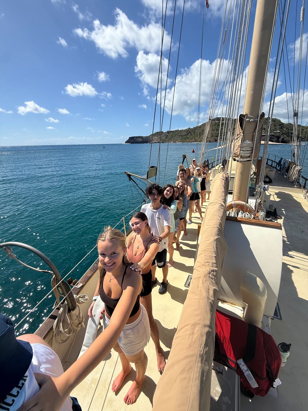 Right as we were going over some emergency protocols, we learned that a few of the boats in the bay next to where we boarded Ocean Star had moved and that we should secure a spot ASAP. So in true Seamester style, we switched plans and got the two boats ready to motor over. We learned how to coil a line and drop the anchor. As soon as we were done, we got ready to jump in the water for the first time and do our swim tests. It was so nice to cool off and have some fun. We even saw a turtle! After drying off, we had pasta salad for lunch as well as some leftovers from yesterday. Then we finished learning about the rest of the safety protocols (fire and evacuation), and we all practiced using the fire hose off the front(bow) of the boat.
