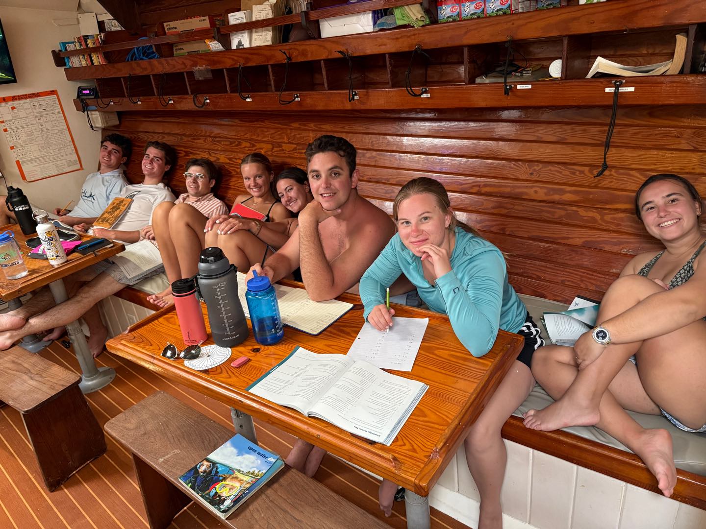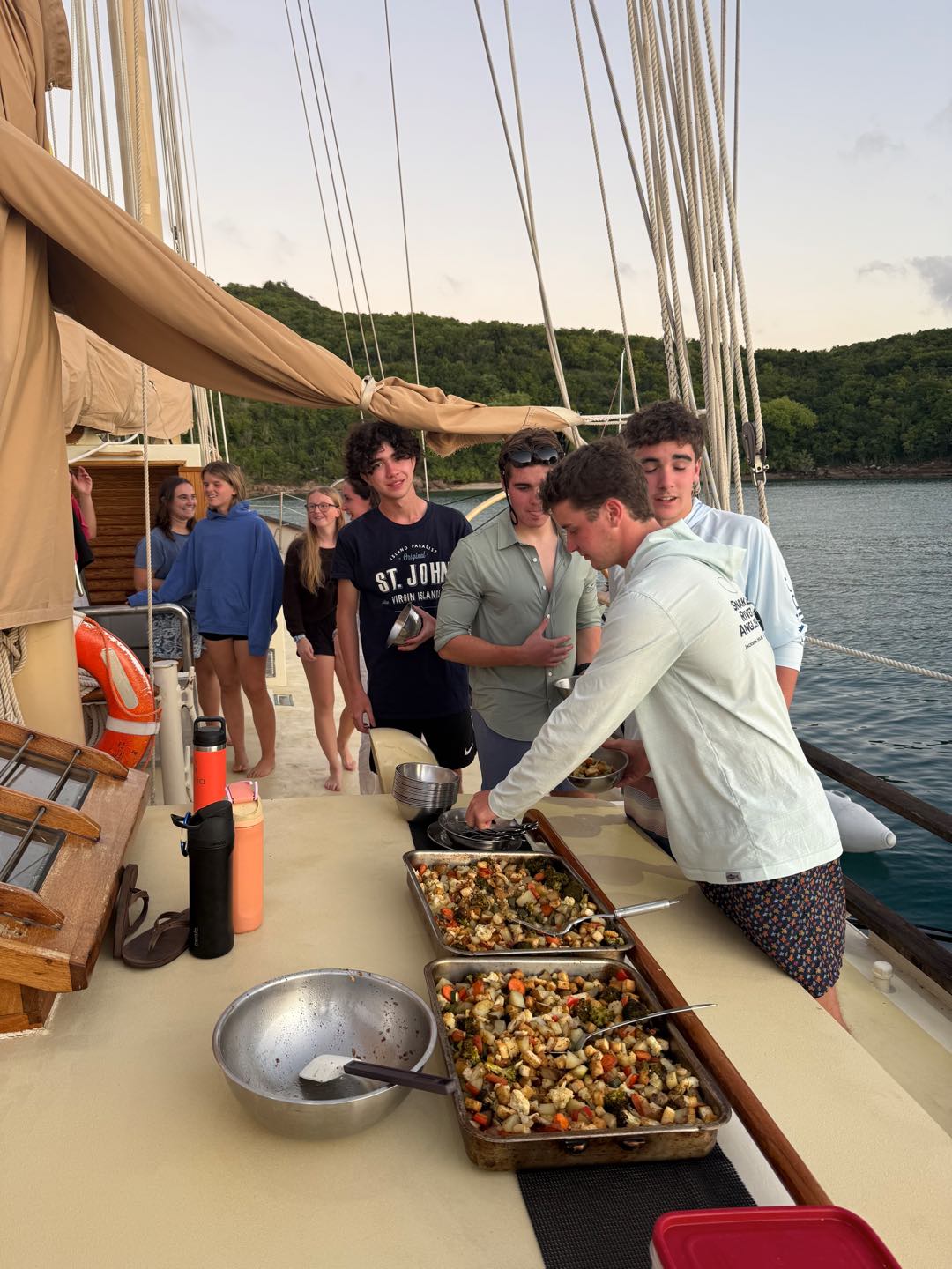 After everyone finished up their lessons, we took our first ocean shower! Some of us also went onto the dinghy to cheer on another team finishing the row race! We saw a gorgeous sunset at dinner and cleaned the boat up to get ready for tomorrow.