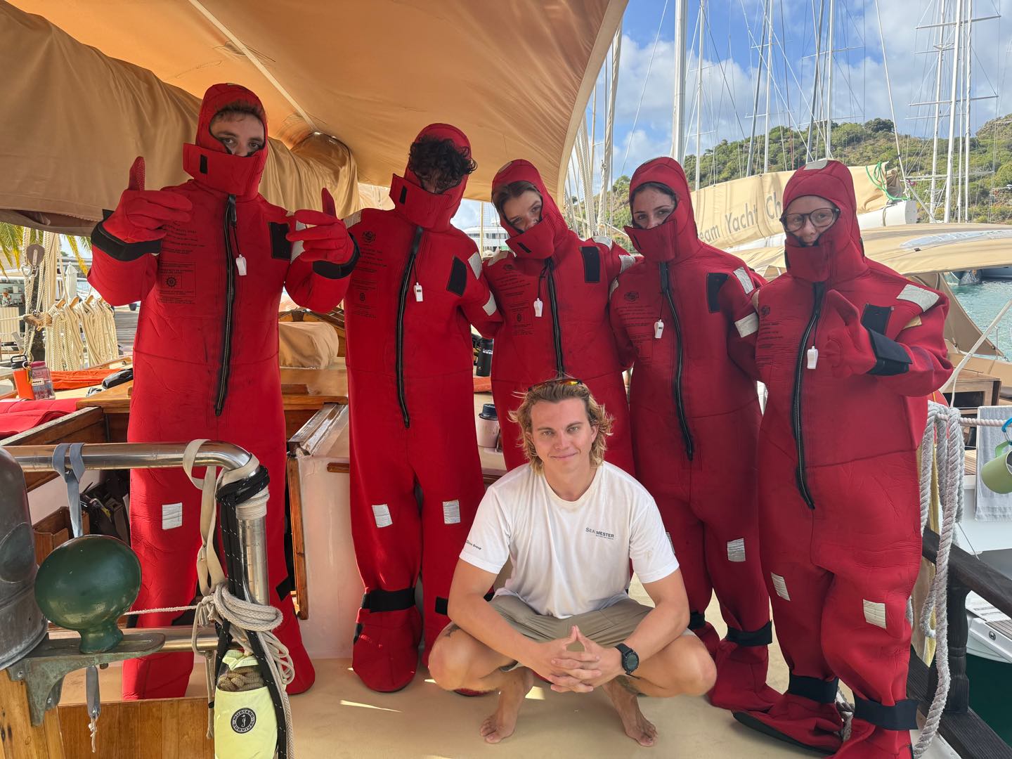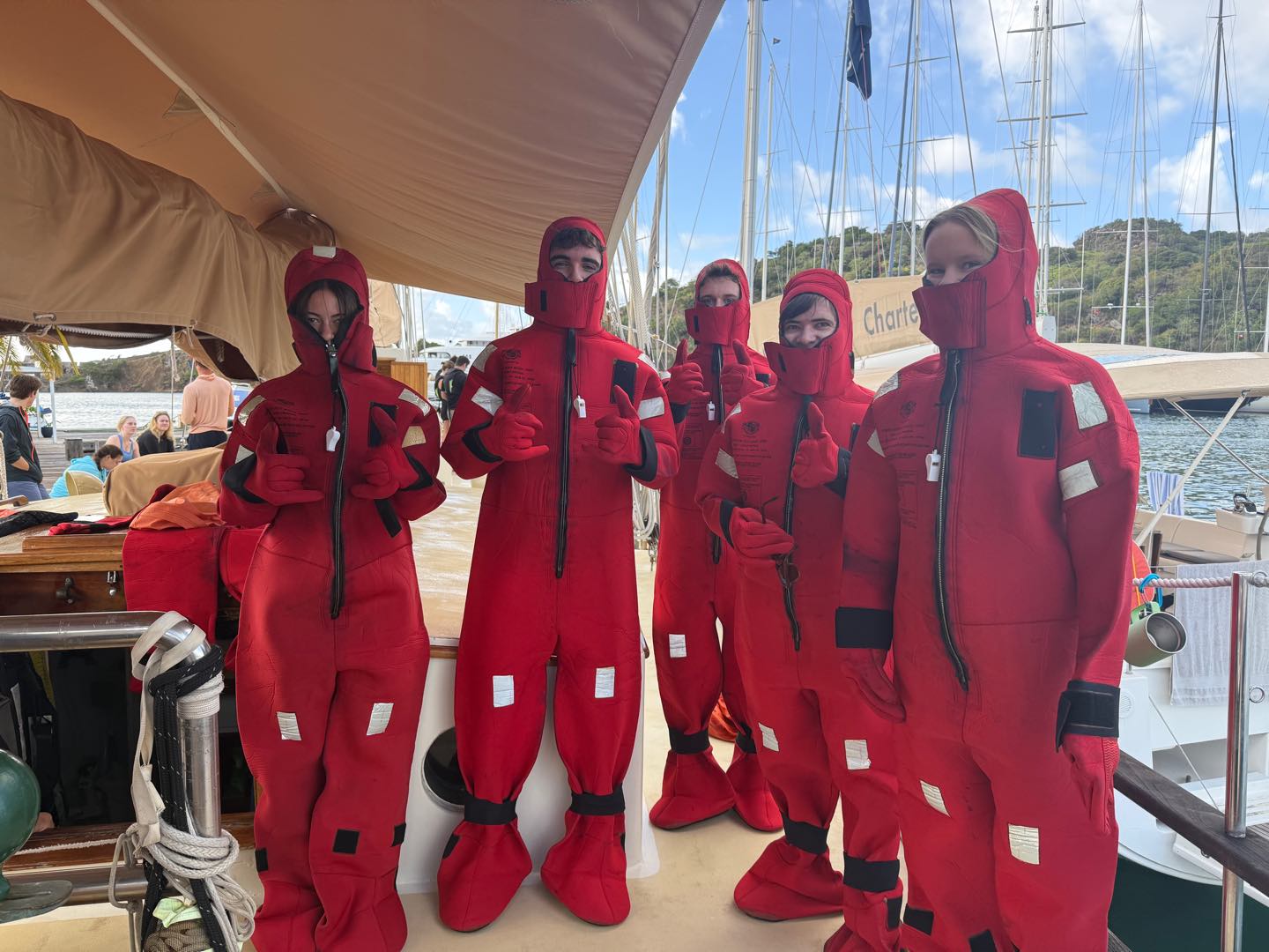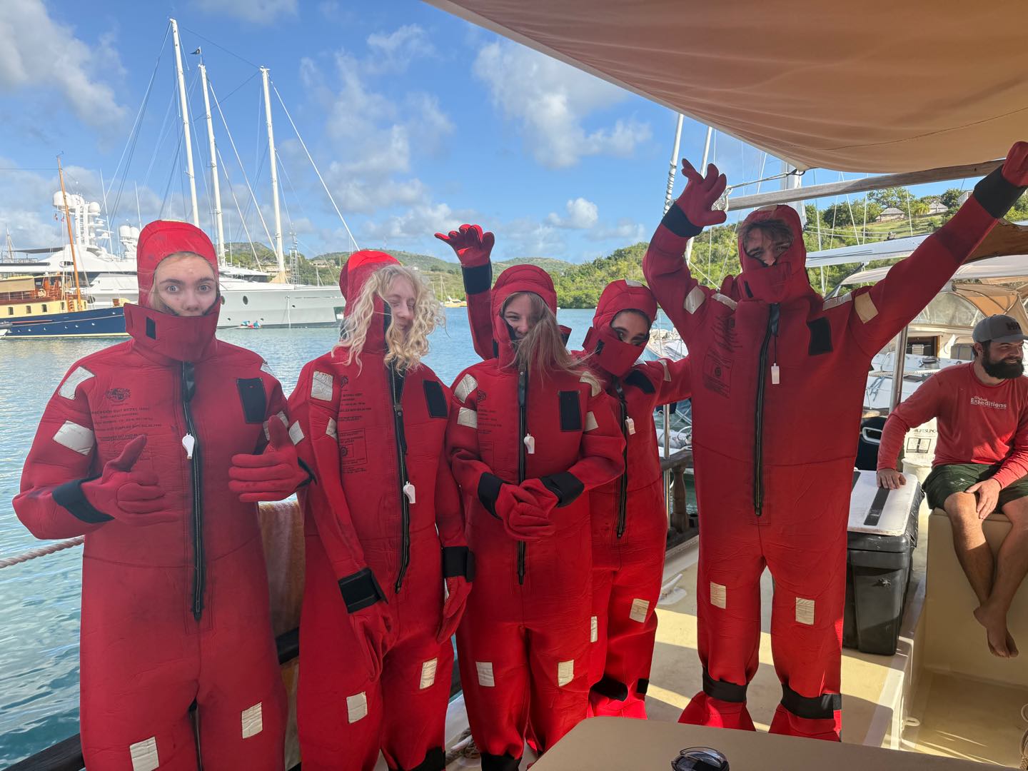 While we were learning the differences of our life vests, an all-girls team from Mexico finished their row from Spain to Antigua, it’s called World’s Toughest Row. It was super fun to cheer them on to the finish line and see their warm welcome (hopefully we’ll get just as good a welcome in Tahiti, ahah). The hardest part of the morning was putting our immersion suits on, otherwise known as a Gumby suit. I made the rookie mistake of not putting my hair back in a ponytail, so it got stuck in front of the hood, and I couldn’t see, so I technically didn’t finish the test and had to do it again.