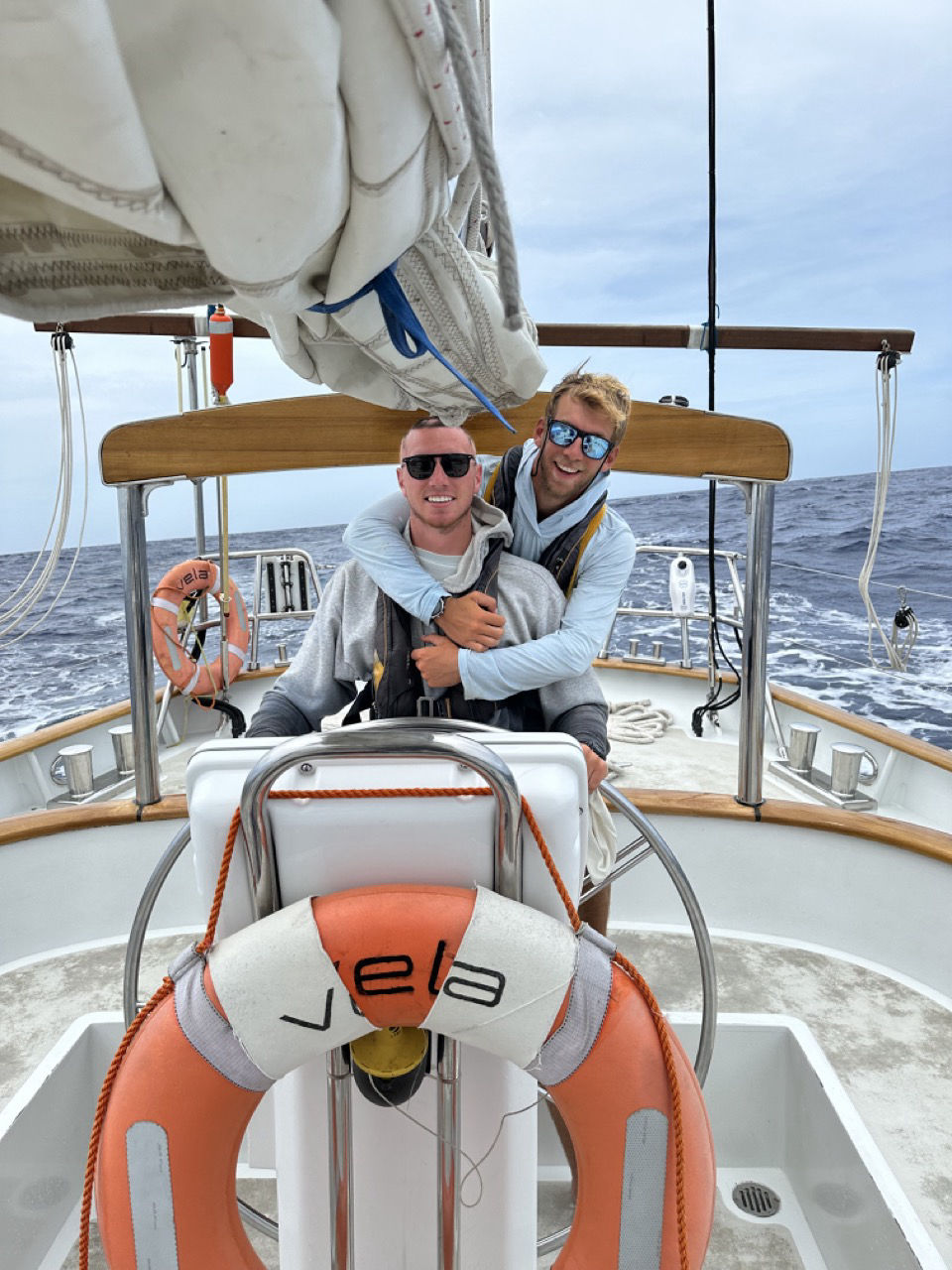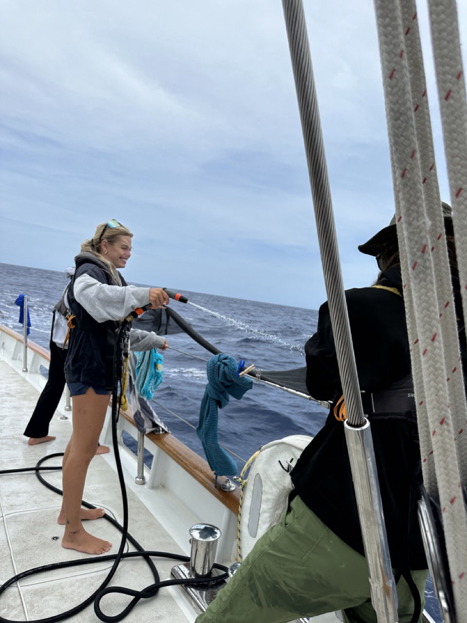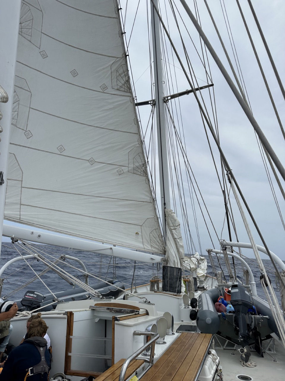Hi families! Today has been an amazing day! I woke up this morning for the 4 am to 8 am watch, which may sound grueling, but it is actually my favorite time. You get to watch the sun come up over the ocean, and the sky is streaked with yellow and pink; it’s really beautiful. Today, we woke up to rough seas and dark clouds that blocked out Orion, which we can always see overhead. We all geared up in our full foulies, bib, and jacket and headed up on deck. The winds were chilling, and we lasted about 30 minutes before the rain started coming down. Sadly, Griffin was on coolant watch for two hours (our engine’s coolant temp was high, so we needed someone to ensure it stayed low), and he missed the entire squall, which he had been most enthusiastic about being a part of. As we exited the storm, the winds hit around 40 knots as we dropped the main staysail. As we were flaking the sail, Lucia, Ruby, and Ayden got their legs swept out from underneath them and went tumbling down onto the deck. Luckily, they were all completely fine, but the laughter made it difficult to finish the task at hand. By the time the next watch team came up for duty, we all felt pretty weathered and a bit like real sailors. Today, we had a quiz on oceanography, and we spent time preparing for our marine bio exam tomorrow. During class, we had around three spillages, two of them involving sugar and sprinkles. The boat has been extremely rocky today, so we’ve spent a lot of time tumbling into one another. I love you all! Also, Lucia says shoutout to her family 🙂