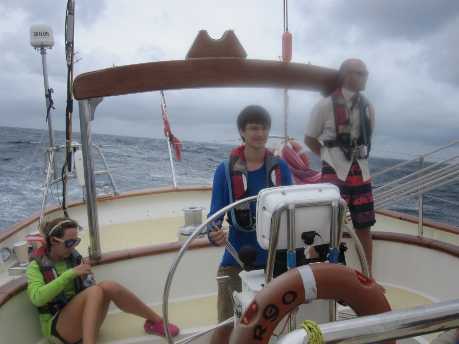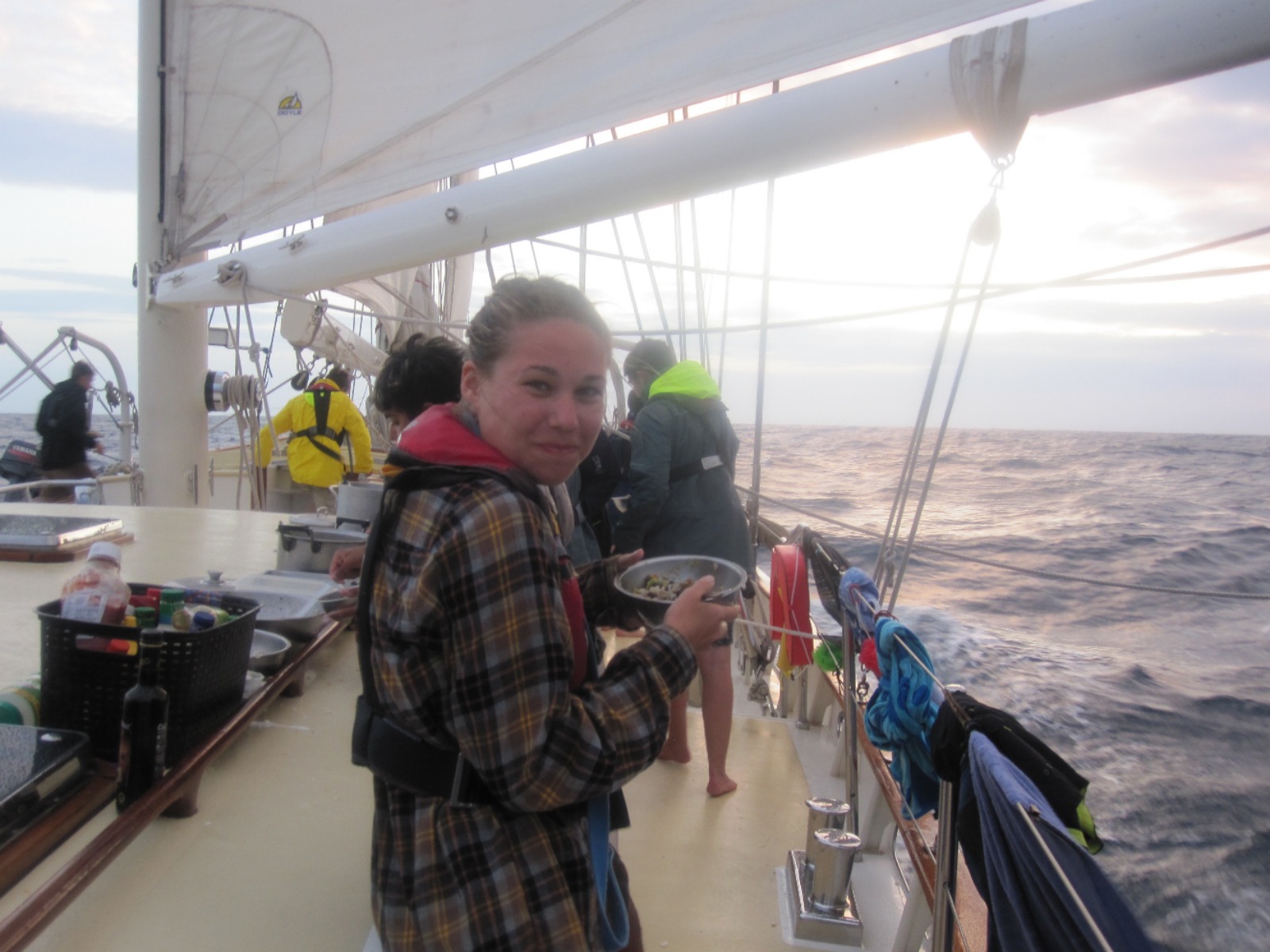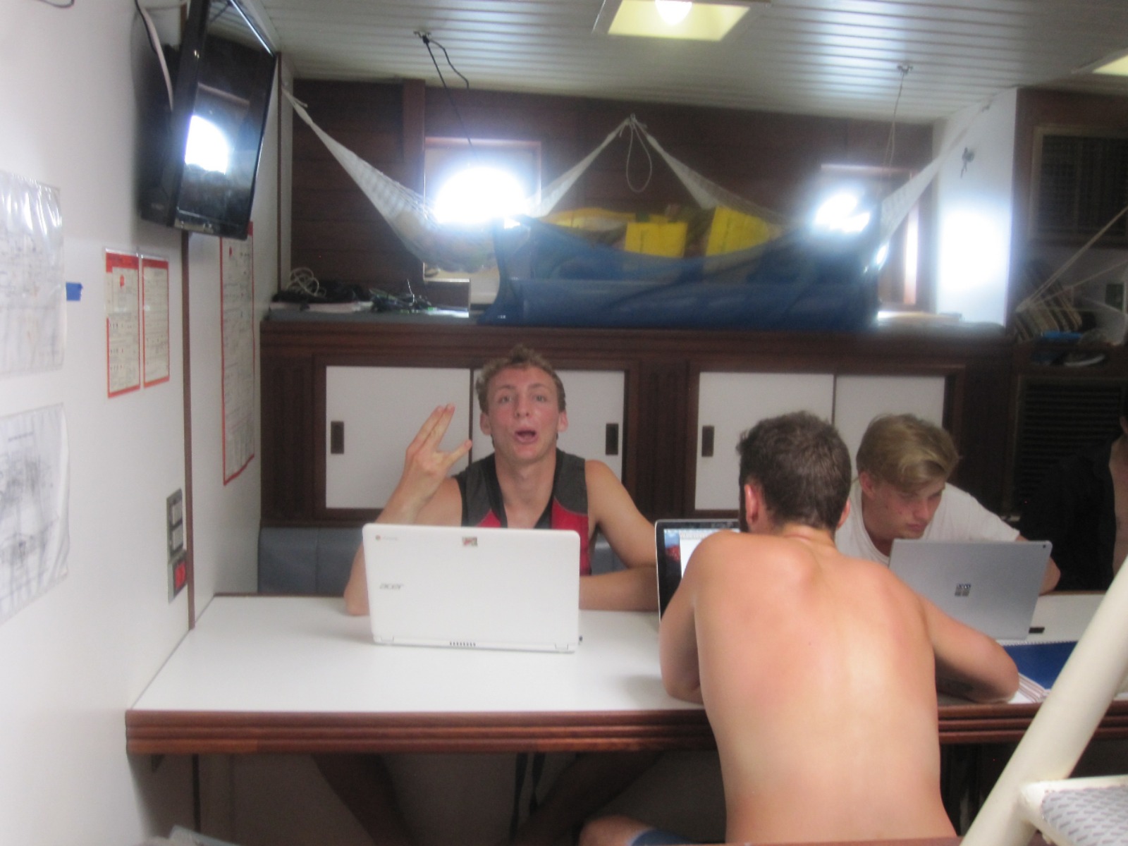 It’s day 19 here on Argo, and it has been a pretty busy one! It was a fairly calm morning, but a small storm started brewing when lunch came around. That didn’t keep us from enjoying our homemade hummus and pita bread, though. Cleaning up after that meal was slightly more difficult than usual because of the larger swells throwing us off balance, but that didn’t stop us from getting Argo in ship shape! After lunch, we started our classes out with our second fish ID quiz in marine biology. Next, we had MTE, where we discussed how we would signal for help in the case of an emergency. Simon and Ian lightened up the mood with a round of Argo Simon Says. We took turns racing around the boat, trying to be the first one to identify the part of the ship that our instructors had just shouted out. For dinner, Captain Ben prepared the freshly caught wahoo from yesterday. Our skilled chefs made both fish tacos and passion fruit ceviche. The day ended with an incredible sunset that we were all very appreciative of!
