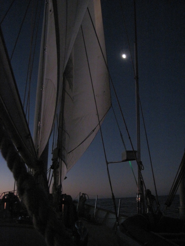 It is impossible for me to describe how incredible night watch at 3 a.m. can be. For three hours, you share the deck with the seven or so members of your watch team, and if the sky is clear of clouds, as it has been these past evenings, the stars above are a true marvel to behold. In no place on terra firma have I seen a sky as full of dazzling points of light as on the open ocean; it is over-brimming with them, and the Milky Way truly does look like a galaxy spilled across the sky. But being on night watch has something to offer below as well as above, for as the bow of the Argo dips and crashes into the sea; bioluminescent organisms are stirred from sleep and glow greenish-blue in protest. With each dip of the bow, one witness a fireworks display of sparkling, flying lights. If any fish happen to be nearby, their sudden scurrying away disturbs the bioluminescent organisms still more. You’ll then see the fish’s path through the water as glowing lines darting erratically away from the ship. At night, the sea responds intimately to our vessel. To see so many stars above is a sight to behold. However, to see them above and below in the deep hours of the night is majestic.