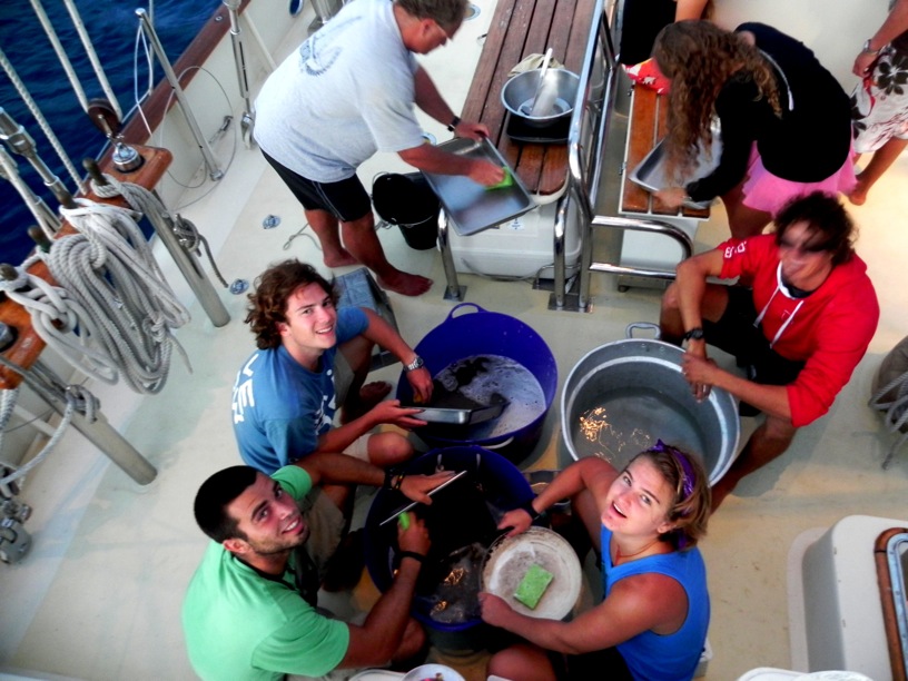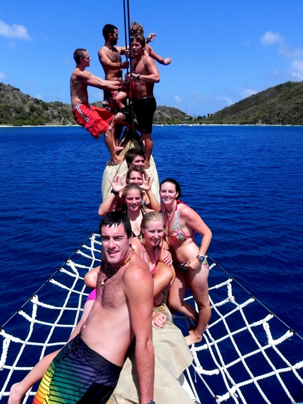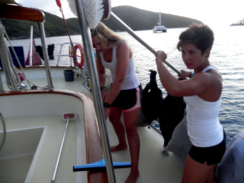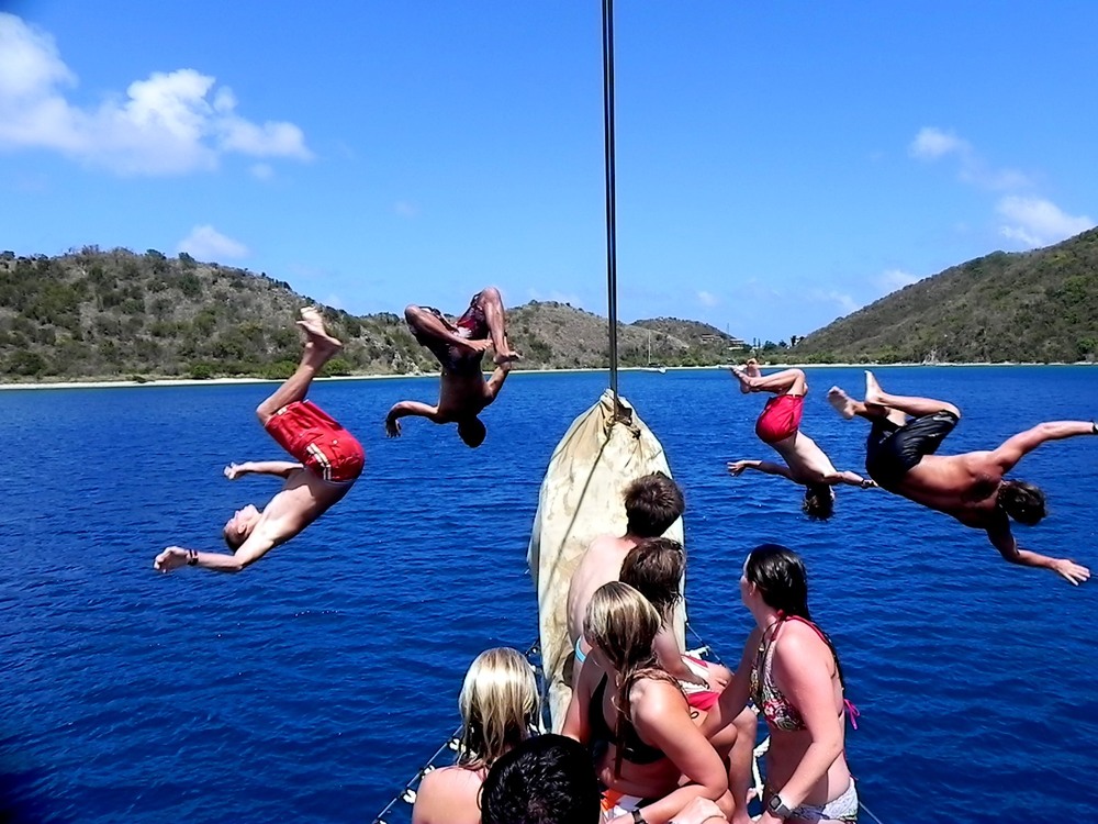 The morning brought the crew of Argo something no one anticipated: Sticky Buns. Thrust from our slumber, we ascended onto the deck to devour the delicious delicacies, but Mother Nature had something else in mind. Simultaneously, as we snagged the buns, aerographic rain ramped off the nearby mountain and showered us with its condescending condensation. We buried ourselves inside Argo, and after we finished, we made our way to our next stop in the BVIs, Peter Island. The plan was to do a wreck dive at an old wooden ship about 80 feet down, but plans once again changed when the air compressor went on the fritz. Eight of us got a dinghy ride to some shallow reefs for some snorkeling action, and, my, what a great plan B it was. Close to shore, the reef was buzzing with schools of minnows. Every step you swam, these avalanches of fish would pour over from side to side in what looked almost like confetti, dropping at the end of the Super Bowl. Besides these little guys, the reef was teeming with other specimens: Blue Hamlets, yellow-tailed damselfish, 4-eyed butterflyfish, and parrotfish peppered the shoreline. Upon our arrival back to the boat, some of us did backflips off of the bowsprit (sick) while others napped it up. By 6, we were stuffing our faces with pans upon pans of delicious pizza made from scratch. Now, the PSCTers are preparing for our 4-hour maritime law oral exam, speaking of which I need to get to so until next time. Goodbye, my friends.