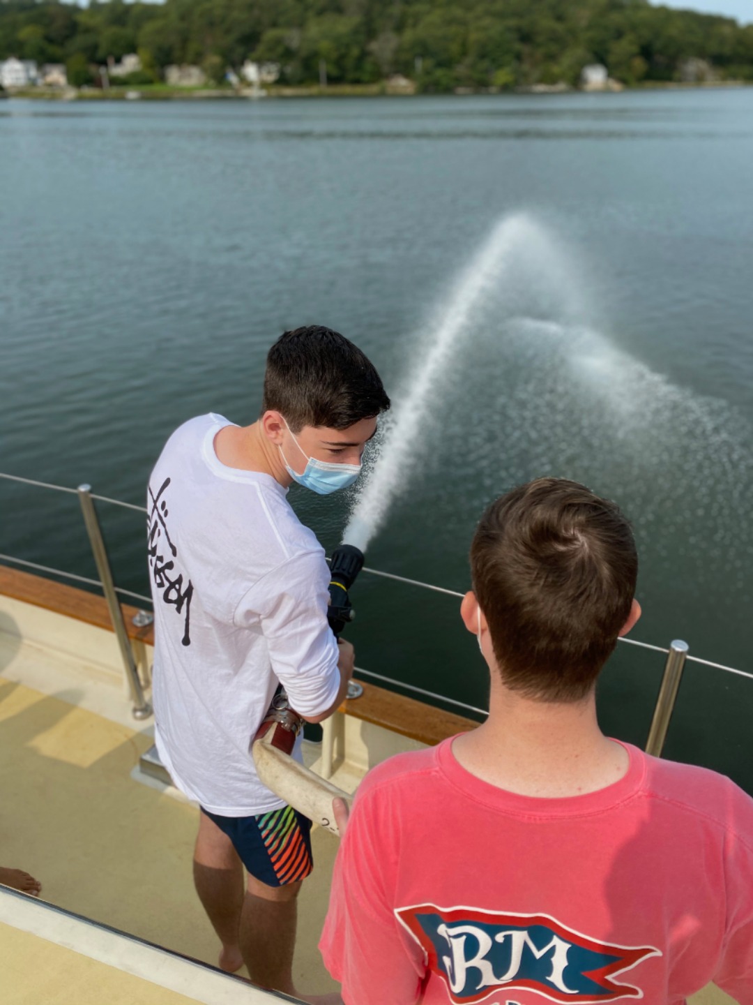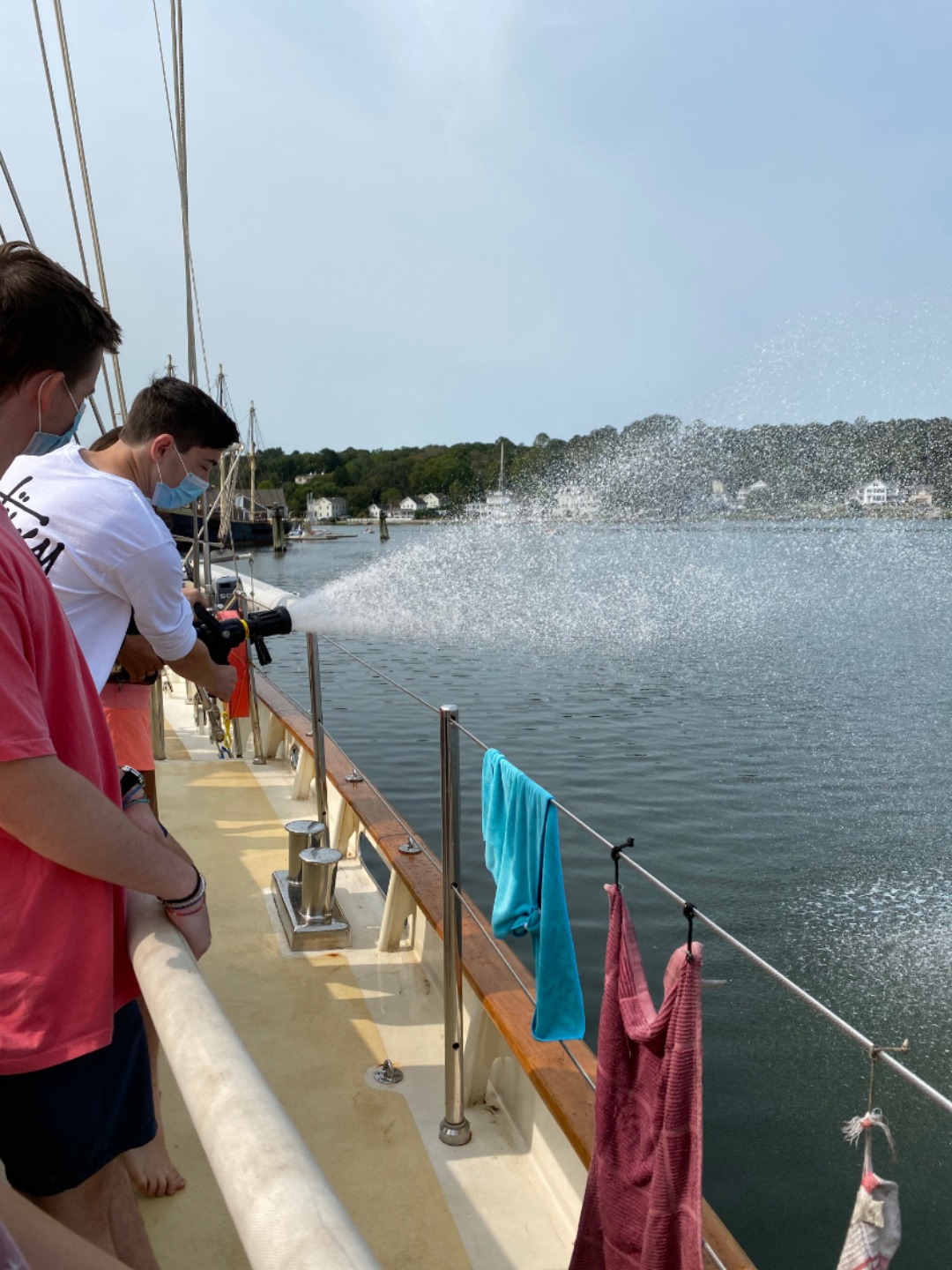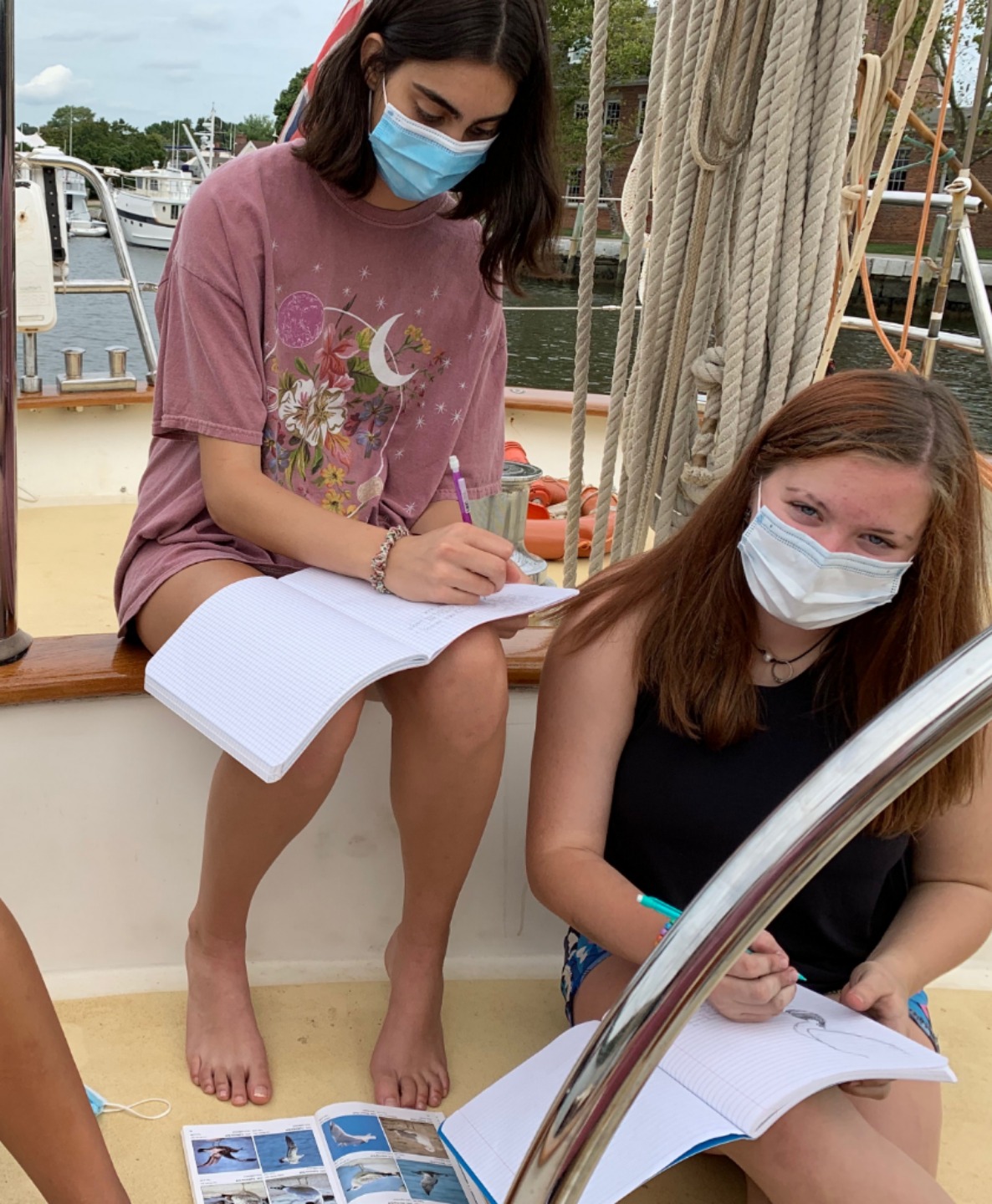 Pictured: crew practicing man-overboard drills with Smash and Sam; Michael using the on-board fire hose; our new classroom set-up; and Bella, Anna, and Mo working on ID books.