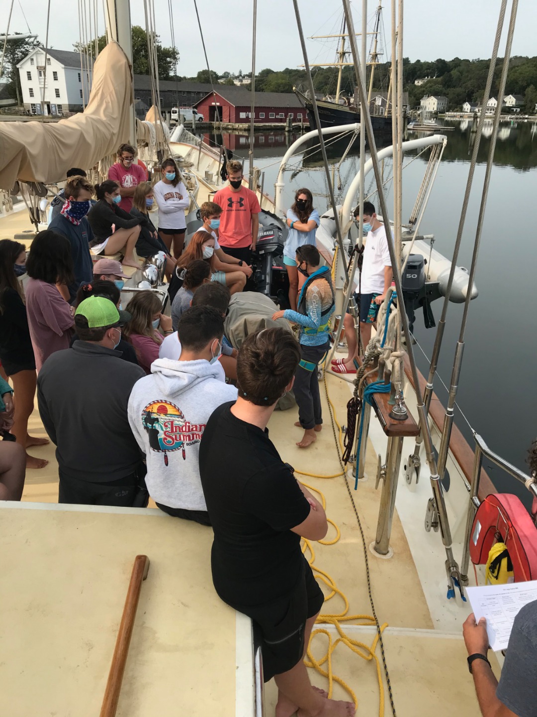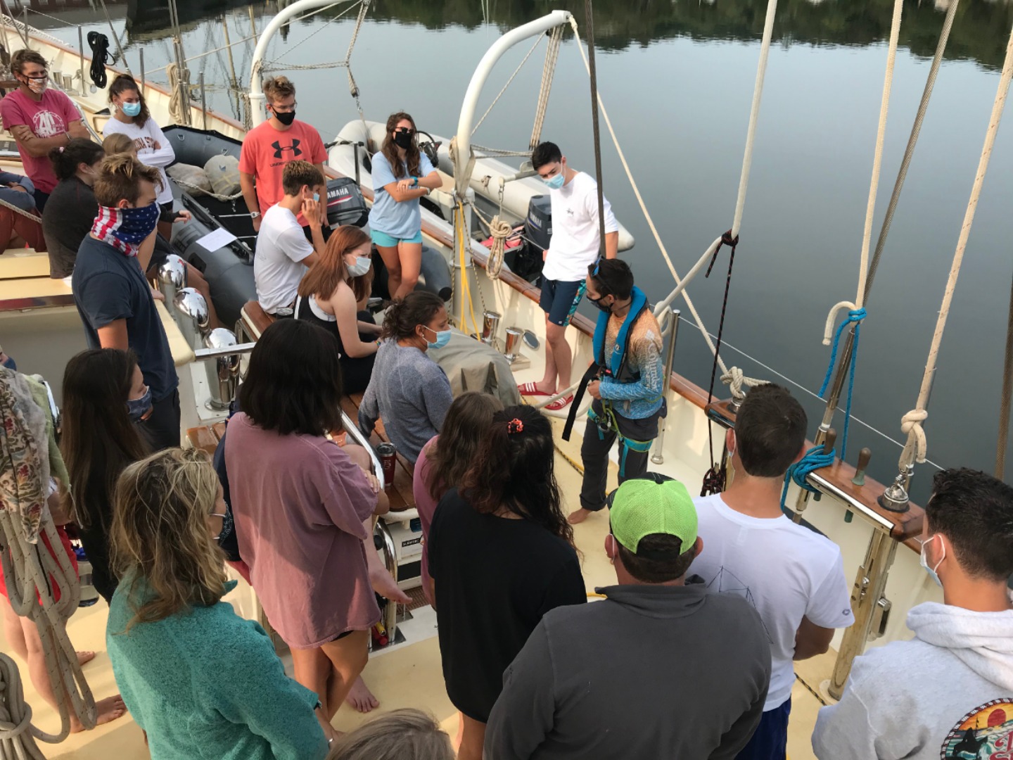 After the initial shock of our 7am wake up call we are all slowly getting adjusted to our new sleep schedule. However, my job of waking up the crew was made easy by an early morning fire drill getting everyone up and on deck. After a big breakfast, we spent the day going through safety drills with our new watch teams. We learned how to attach the fire hoses to the water source and what to do in case of a man-overboard situation. After a delicious stir-fry lunch, we had our first class introductions in marine biology and seamanship. I know I’m not alone in saying I’m super stoked to be back to in-person classes as opposed to zoom lectures. Later a group of us headed up to the cockpit to get started on our marine bio ID log books and get in a quick workout/yoga session before dinner.