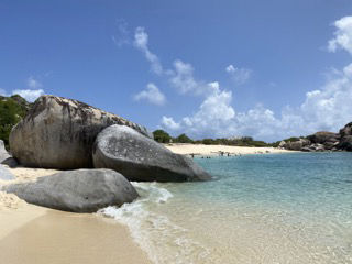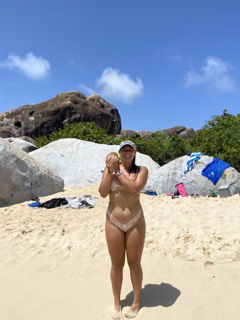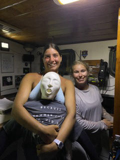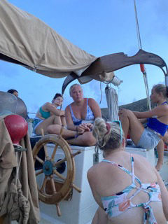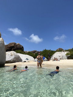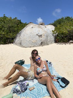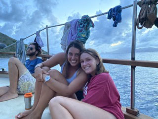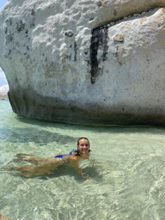 Today was a crazy day full of belly flops, handstand rolley polleys, and chicken fighting in the water surrounded by huge giant boulders. We started our day by waking up by me yelling, wake up! After that, it was oatmeal breakfast time with a side of apples and stewed berries, and maple syrup. Presentations of our group research project were next on the agenda. Personally, I think everyone did amazing, but the sponge bob presentation by myself, Meg, Ginny, Maris, and Sissy was the best. For the rest of our afternoon, we went to Devel Bay, a beach with crystal blue water and giant boulders like something from Jurassic Park. We got dropped off in dinghies, where we were excited to do a wet entry and swim to shore with our bags over our heads which was a challenge as my bag was full of heavy snacks and phones. Thank goodness Aj came and rescued me (thanks, AJ), or I would not be here to write this blog. When we got to shore, half the group went off exploring throughout the boulders to another beach; Maris, Ginny, Sissy, Meg, Ari, Lauren, and AJ stayed and practiced our belly flops, played Ninja and chicken, and also practiced our aqua gymnastics. Through the boulders, there were lots of cool rock pools and caves which we attempted to climb and swim in. After a long afternoon at the beach, we all headed back to the boat and moved anchor spots to our dive site for later on, where the divers are doing their night dive. Waiting for dinner (chef Hannah today) was spent with Sam helping everyone study for our oceanography exam tomorrow (last one, woohoo). The End 🙂
