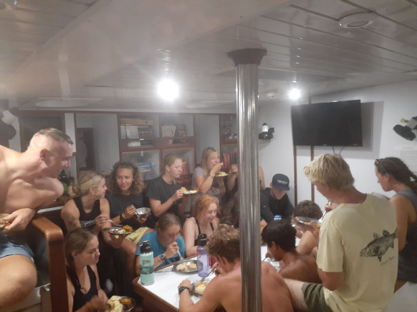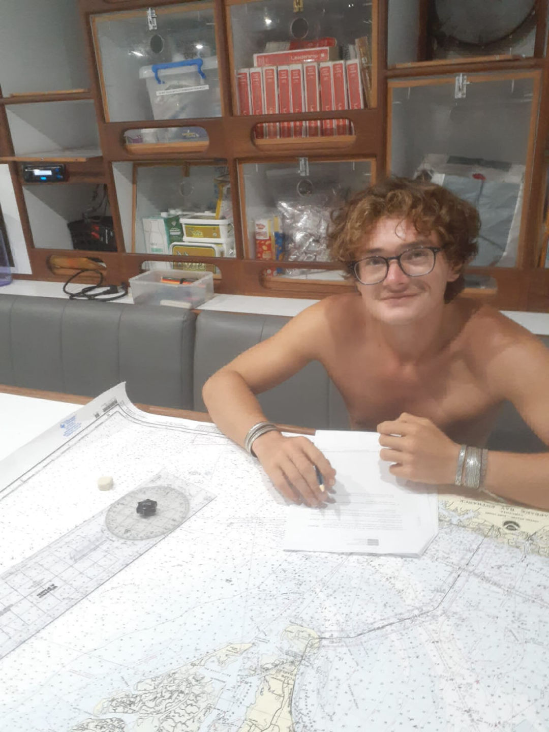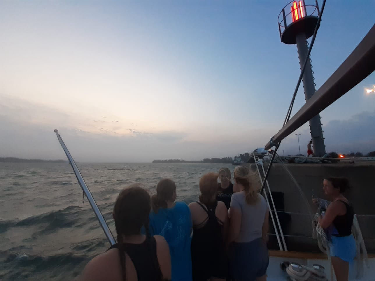 Today was pretty chill unless you had the navmaster exam, so for me, it wasn’t chill. NavMaster is a long exam approx 4 hours for most, that felt like it took forever, especially number 11. After that long, tedious triple course to steer with drift and leeway problems, it was time to relax. After we were able to go get some ice cream runs, not the best ice cream out there (a nice half seafood shop half ice cream shop the girls have become loyal customers of or its competitor Roberto’s across the road), but any ice cream will do. We then cut to dinner which was great setting up until we were hit with large winds. Everyone moved the food downstairs as others yelled at the wind to try to scare it away. Others just stood there with arms wide to feel the cool winds, which felt amazing. Today was the first day eating in the salon which was very fun. It consisted of all of us squeezing together to try and all sit at only one table which was packed and fun too. It was like being in a snow day or power outage at home, everyone was laughing and having fun packed in together at one table. My squeeze question was “What is the most litty moment of your life?” with answers ranging from dueling your karate sensei to a first kiss to trips with friends and state championships won. We then a capella sang Waka Flocka to end squeeze. Slow, chill day until dinner hit, but it was super fun, which made up for the painful navmaster exam.