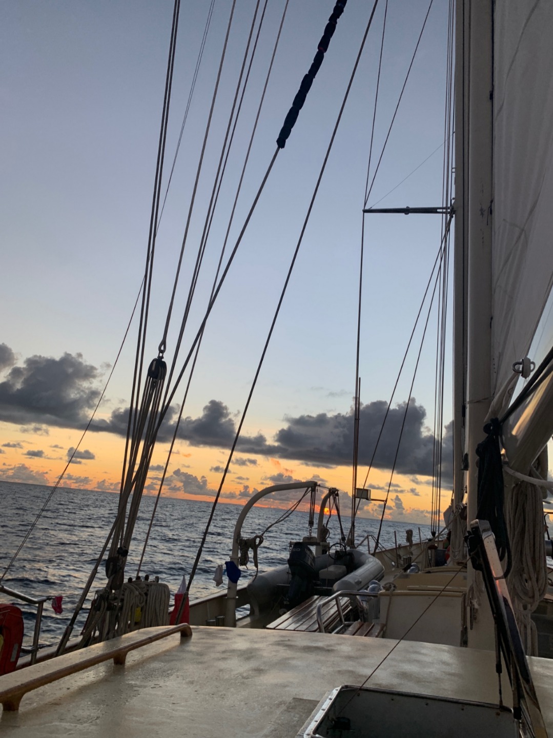 My day started with the 8-12 watch last night. You might think that that is not the current day, but you are mistaken because the entire passage is one long, extended day. Watch went by quickly last night because Tim joined us and played a game called “Contact,” which ended with everyone choosing words that no one else could guess. I went on bow watch with Cole, and we talked about weird Argoisms that we would bring home. For example: After you make your bed, you say “MADE!!!” You might think that joke would only last 5 minutes, but we stretched it out to last an hour. I then had the 8-12 morning shift, which was fun… and HOT. It is not an enjoyable feeling when you wake up and immediately feel sweaty and sticky. I got woken up by Max in a funny way, and we almost woke the rest of the crew up with our laughter. We had as pleasant of a watch as possible. We continued the game of Contact for about 2.5 hours this morning. The rest of the day was just as enjoyable, we took our Oceanography final exam today, and it seems like everyone did well. We have our final exam for marine biology tomorrow, so wish us luck! I am going to bed because I have to be up for the 4-8 tomorrow and have a long day of cooking and writing my final papers.