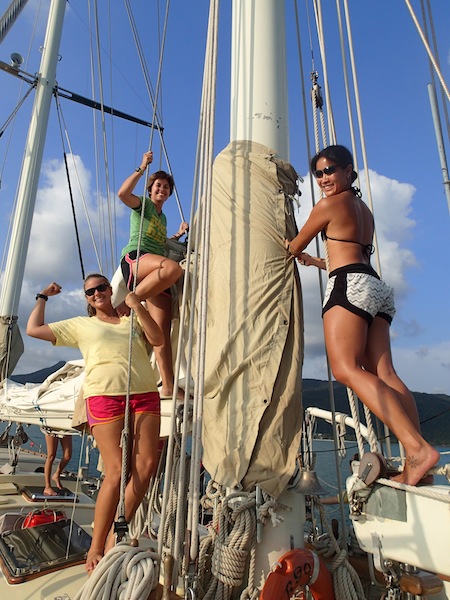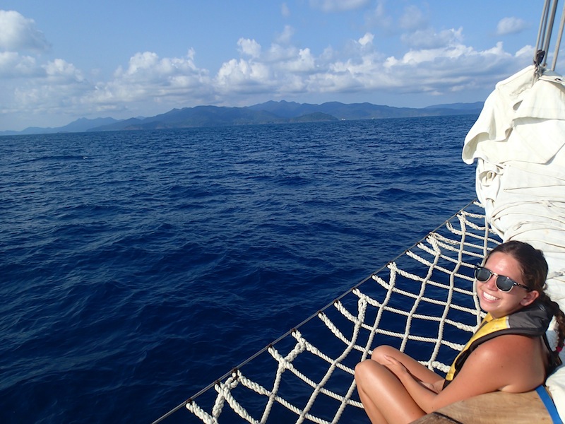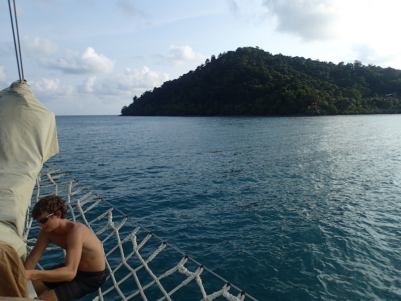 Today, Argo and her crew arrived in Koh Chang after weaving our way past fishing buoys and the lights of the ocean liner Queen Mary 2 across the Gulf of Thailand. After a lunch of chicken pesto pasta, we headed down below for MTE Navigation Master practice. With the exam looming near, everyone wants to get in as much class time as possible in order to get the certification. We poured over the practice charts of the Chesapeake Bay with our dividers and Breton plotters, hoping to master every skill that may be asked on tomorrow’s exam. We have even scheduled a study session for after dinner. After MTE, we had a few hours of rest before we turned into Ao Bangbao, searching for a place to drop anchor. Once we had sail covers on and had given the hull a soapy wash, we were able to cool off by jumping into the calm waters. After dinner, we were given a wonderful surprise. After making a strong recovery at home, Caroline has returned to Argo! Everyone is excited to have our full crew back on board and in good health to finish the trip.