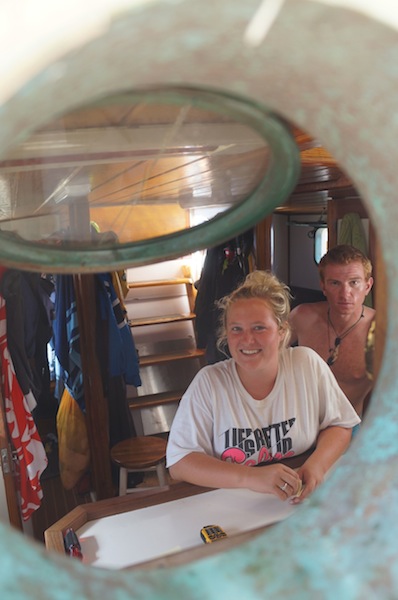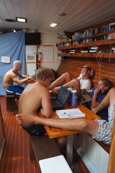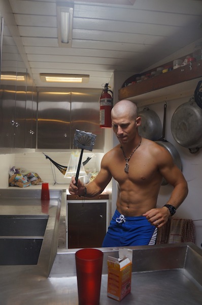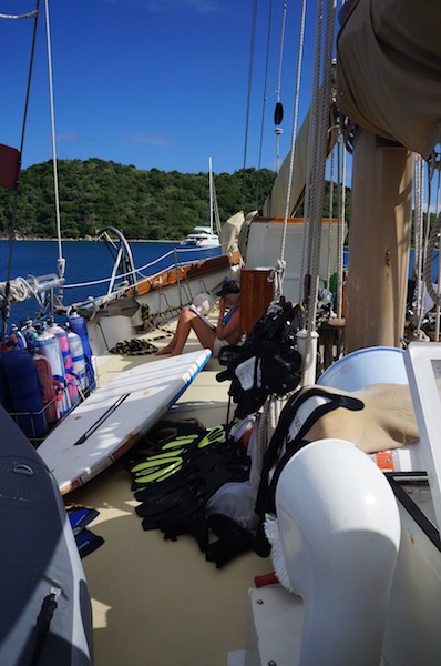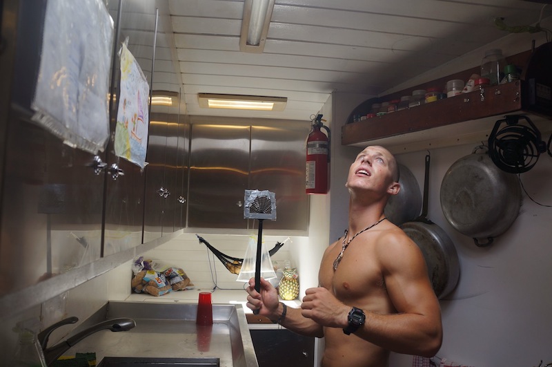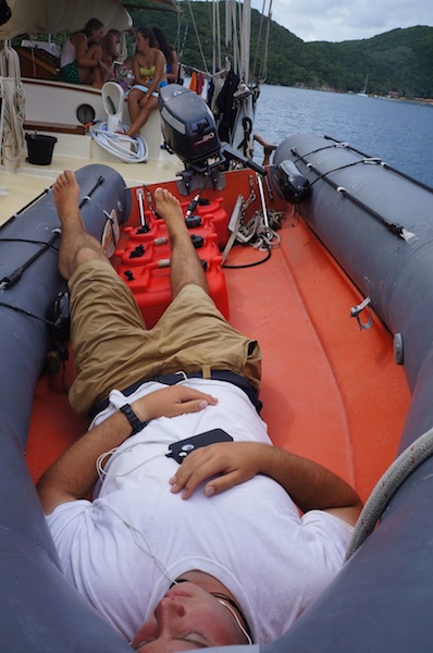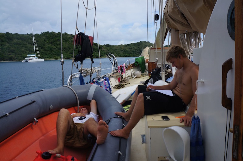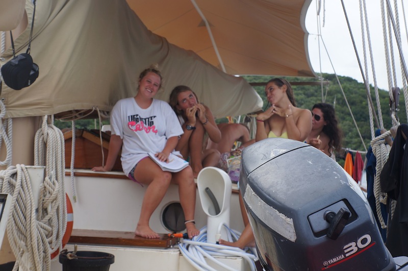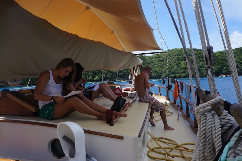 Warning! The fire alarm has been activated. Report on deck immediately. Our wake-up came early this morning thanks to our lovely chefs, Bret and Will. Dom made it on deck with her PFD (put on correctly this time) in seconds flat. Best response time EVER. After setting off the fire alarm, the fruity pebble pancakes survived, only to be devoured minutes later. After breakfast, we prepared ourselves for a day of intense studying and our first round of finals. The morning was spent studying or finding reasons not to study. Since we moored at Peter Island, we have had a relentless onslaught of flies infiltrating every part of the boat. The fly infestation prompted some creative studying diversions as we tried to see who could fashion the best fly-catching and swatting devices. Ben took the competition very seriously. As I write this, he continues assassinating flies in the galley. Seriously, he only stopped swatting to take Nick’s exam.