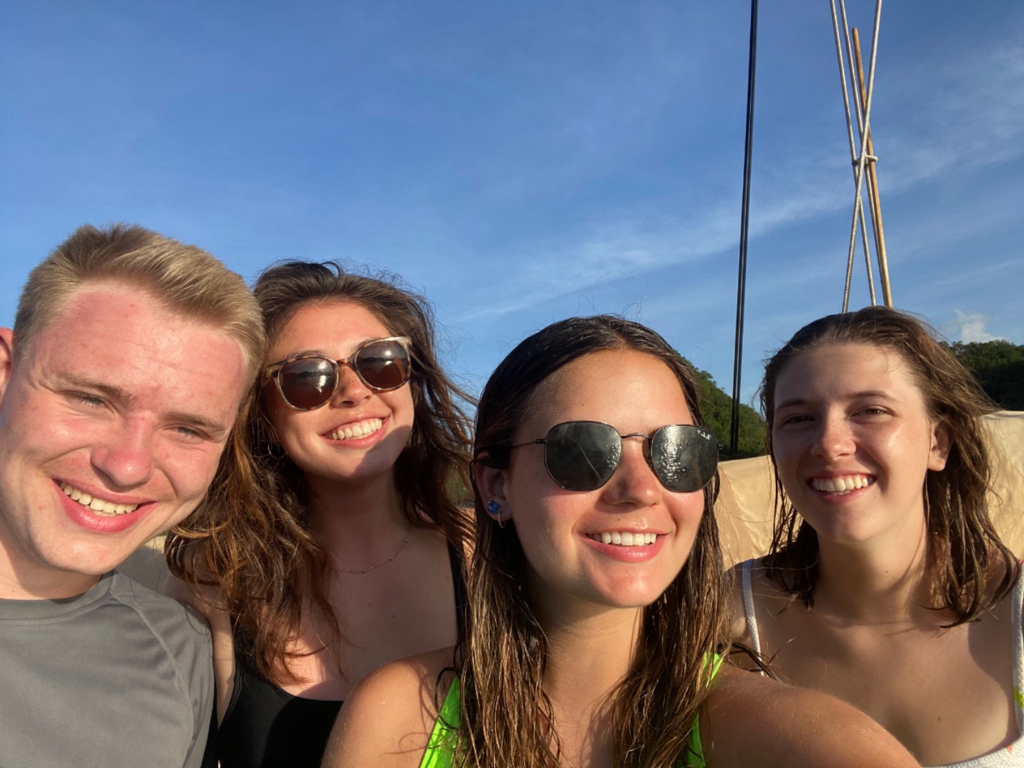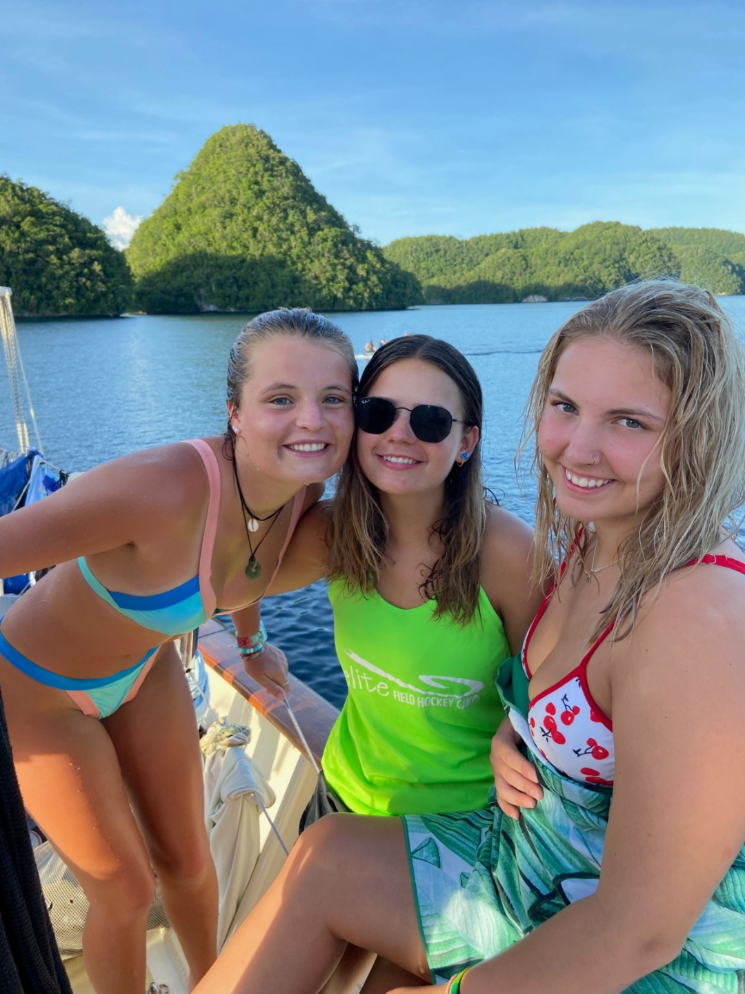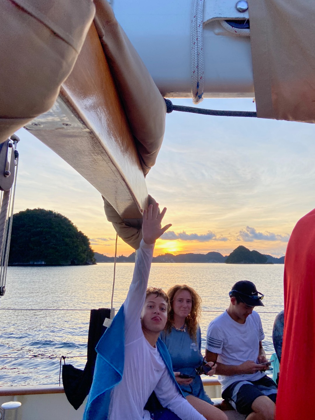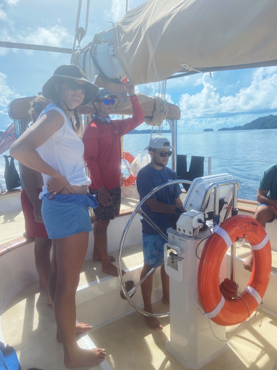 Greetings from your skipper for the day, Grace! My morning started by waking a majority of the crew up from their slumber in their hammocks. The deck was covered with them last night. Everyone woke up to a heavenly smell. We had a delicious breakfast of cinnamon rolls with yummy frosting. Next thing I knew, we were off to a new location which was very exciting. The breeze saved us on this extremely hot day, but not from the UV rays (hence sunburn city). Will played captain for the day and steered the boat, which was pretty cool (It’s a miracle he didn’t crash, though). Once we got to our destination, groups quickly started to hop in the dingy to go diving. The ride to our dive spot was incredible. The water looked fake–it was so blue and clear. Divers getting their advanced certifications right now went for a fish identification dive, and there were so many fish!! The dive was amazing; I was in awe of the underwater world. We even saw sharks, actual real-life sharks! How much cooler can you get? We also drew the different fish we saw on slates underwater.