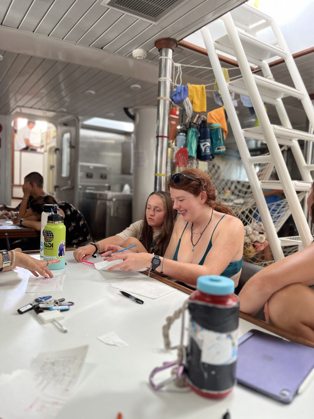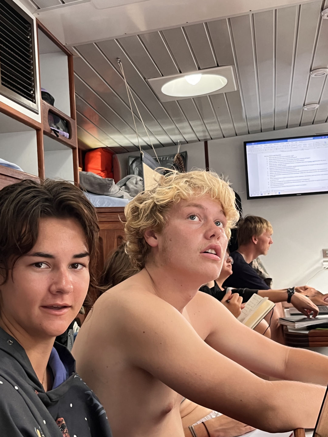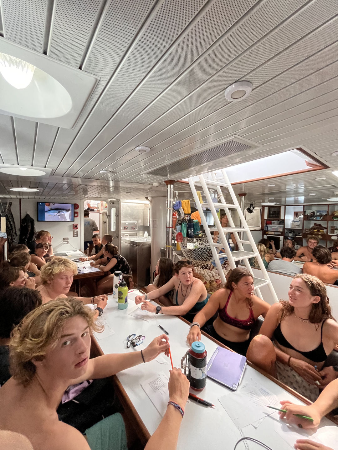 Breakfast was a delicious hotel pan full of chocolate chip muffins prepared by Jimmy. To complement the chocolate muffins were a fruit cocktail that comes from large cans, but despite it being canned, it is delicious. Then after breakfast, we had a marine bio ID quiz which was extra fun because it included species we saw on the last passage, like flying fish, yellowfin tuna, and a wild Bonsey. After the quiz, we reviewed for the final marine bio exam, so I decided to take pictures of the class time we were having, but it turned into me taking really zoomed-in pictures of people on my phone. Then we had study time which I didn’t utilize because Maya took like 2 hours to hype herself up to do a backflip which used up the whole study time. It was still really fun because some of us would occasionally just huck one while Maya took her sweet old time. It was worth the wicked sunburn I got because Julia did her first backie as well, and I attempted a gainer, which spectacularly failed because I landed on my neck, my second attempt went slightly better but not by much.