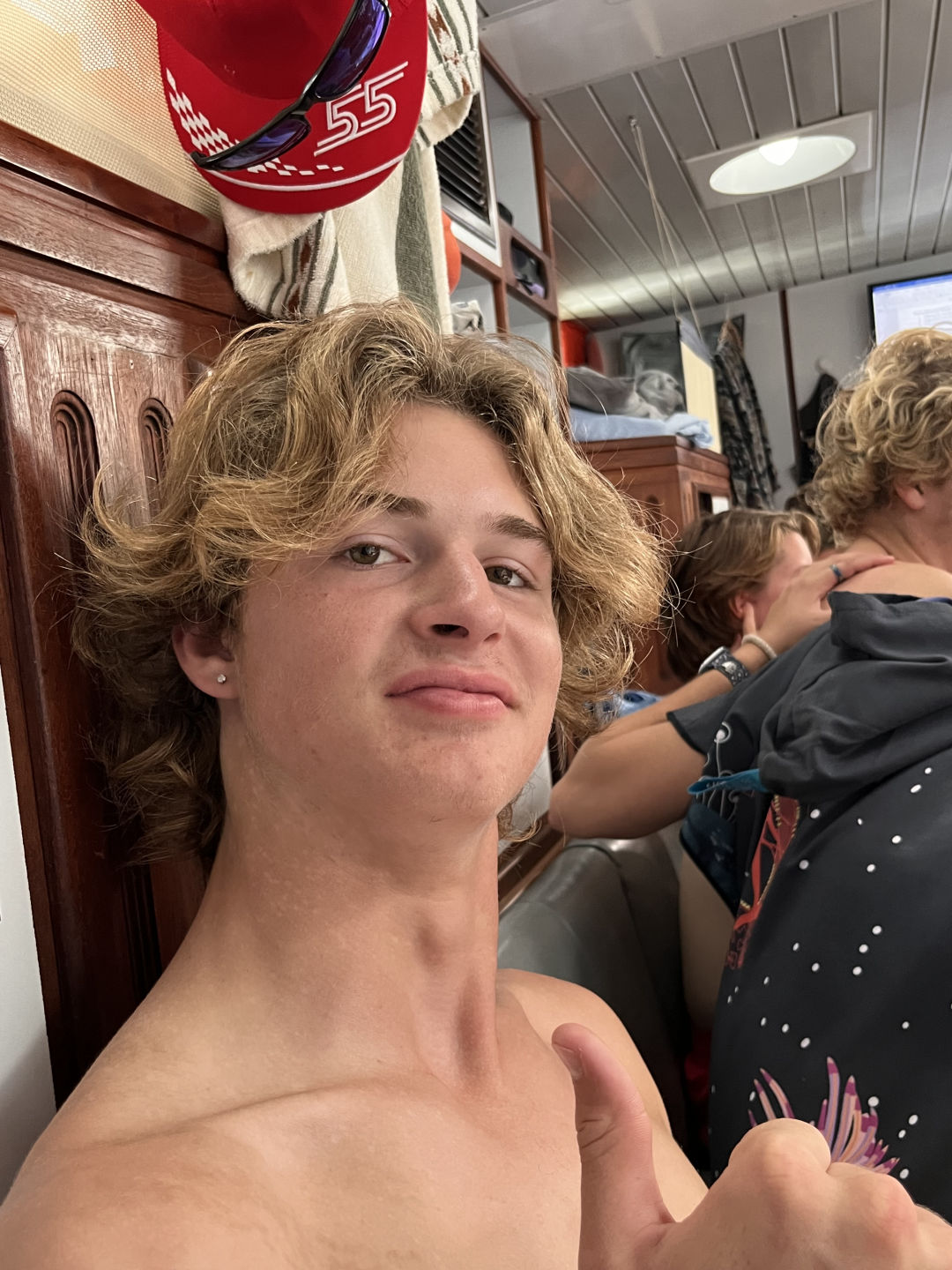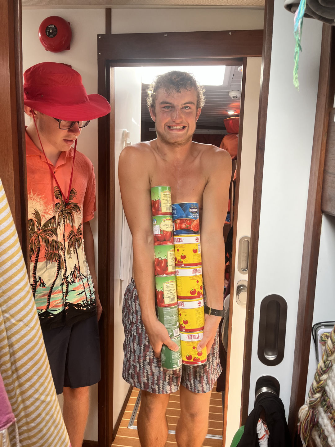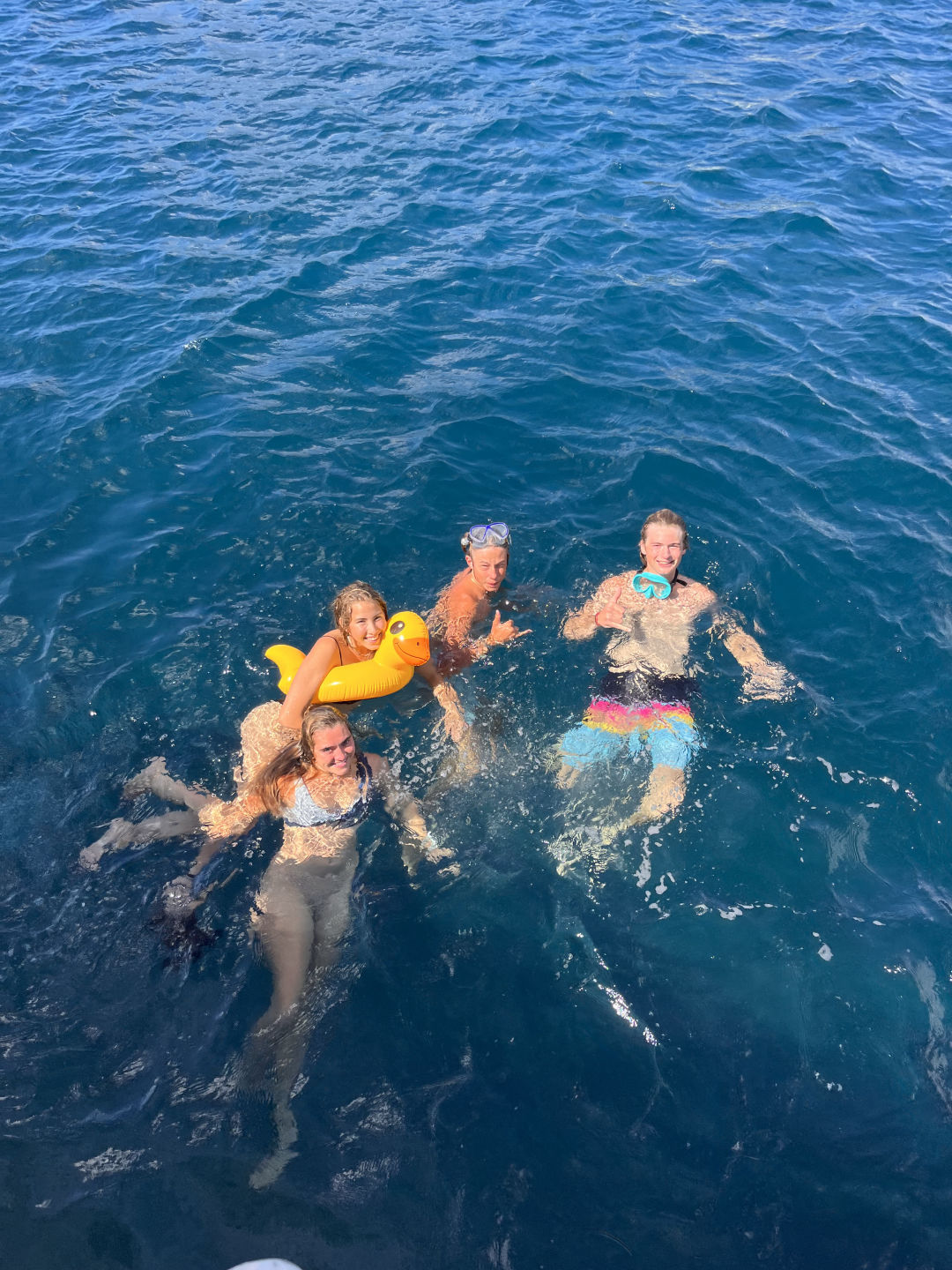 Breakfast was a delicious hotel pan full of chocolate chip muffins prepared by Jimmy. To complement the chocolate muffins were a fruit cocktail that comes from large cans, but despite it being canned, it is delicious. Then after breakfast, we had a marine bio ID quiz which was extra fun because it included species we saw on the last passage, like flying fish, yellowfin tuna, and a wild Bonsey. After the quiz, we reviewed for the final marine bio exam, so I decided to take pictures of the class time we were having, but it turned into me taking really zoomed-in pictures of people on my phone. Then we had study time which I didn’t utilize because Maya took like 2 hours to hype herself up to do a backflip which used up the whole study time. It was still really fun because some of us would occasionally just huck one while Maya took her sweet old time. It was worth the wicked sunburn I got because Julia did her first backie as well, and I attempted a gainer, which spectacularly failed because I landed on my neck, my second attempt went slightly better but not by much.