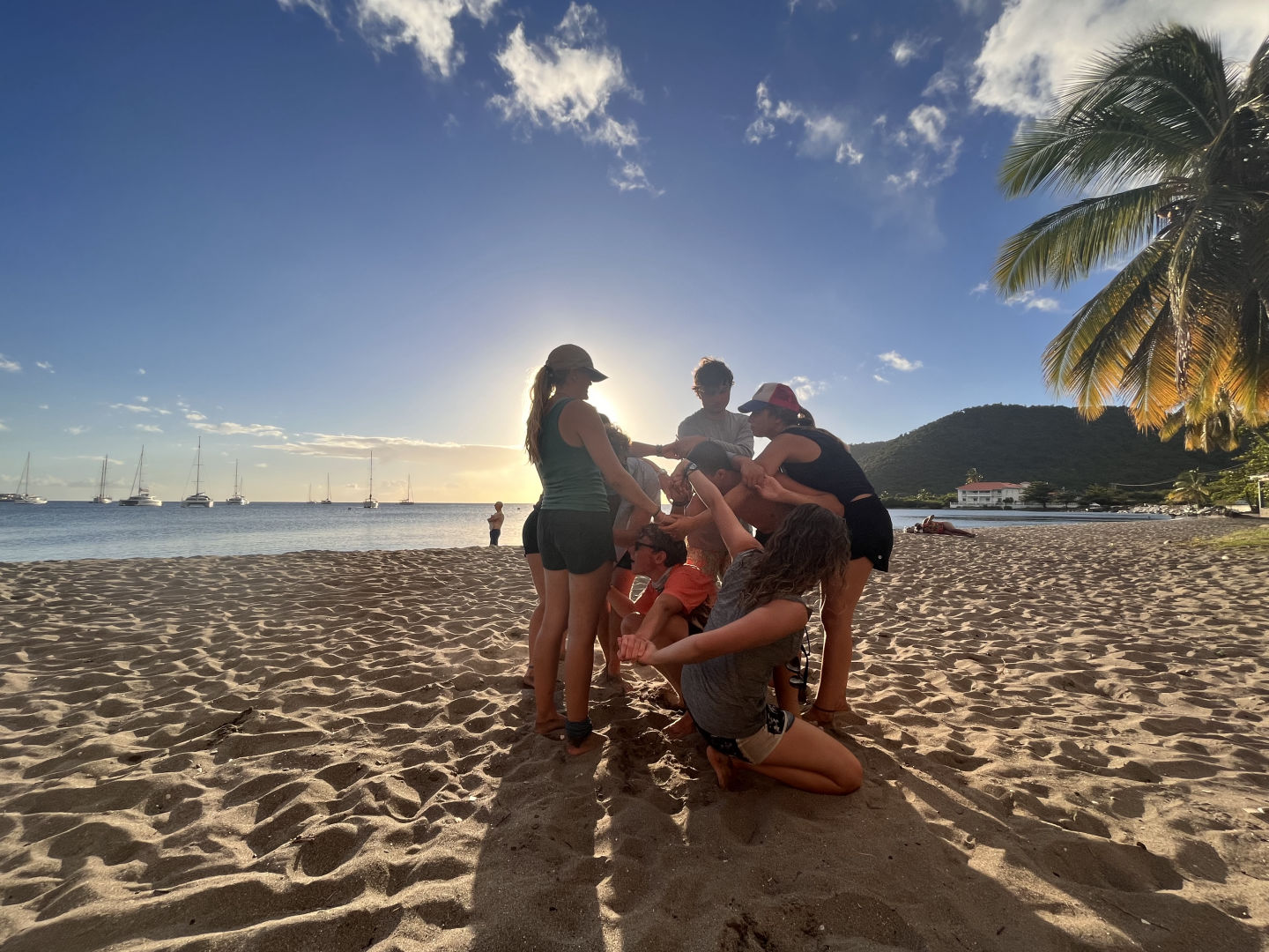 Then we had lunch which was a full English breakfast which was good but not as good as the breakfast, but it was still very good, which is a trait about almost every meal. When we were doing cleanup, our leadership teacher, Calum, was prepping our leadership challenge course. The leadership challenge course is kind of like a scavenger hunt but on a larger scale, and you have to complete specific tasks like raising the forward staysail, paddling one of the dinghies to shore, finding half-buried “treasure,” finding a bay on the other side of a spit of land to the north of us than picking up some trash and giving it to another instructor to get our next task which was flipping over a towel while our whole group was standing on it than we went back to where we started onshore and did a human knot than we had to swim back to the boat and to finish we took a picture on the bowsprit. My group was the last to go, so we had around 2 hours, so we started watching the fourth Pirates of the Caribbean movie. While we were raising the forward staysail, we believed that our group was sabotaged by a previous group or by the instructor supervising that task because the mermaid line was fully pulled out, which is not how it’s supposed to be but other than that, it went fairly smoothly. Then we paddled on one of the dinghies to shore with anything we had or was already in the dinghy, which was fairly difficult, but we handled it well. After that, we were to find half-buried treasure, which was 60 paces to the south of the dock we ended up at. Flipping over a towel while our whole group was standing on it was very difficult for my group. We failed two times because it was hard to balance on the uneven ground within a very small ground space with eight or nine people. The human knot task was easy enough; then, after that, we answered a question about oceanography which we answered correctly. After answering the question, we got our next clue which required us to swim back to the boat and find something on the anchor chain, which was the next clue that told us to get up on the bowsprit for a picture. After the picture, we had another backie sesh where Emy did her first backflipfollowed by a dinner of delicious chilly(Owen’s mom’s recipe) and some scrumptious white bread rolls. Before the squeeze, we had a little conversation about the challenge we faced during the afternoon. Then it was time for the squeeze. The question I asked was what is the first thing people would eat when they got home. Some answers were snack food, some were local restaurants or fast food places, and a few were their own cooking.
