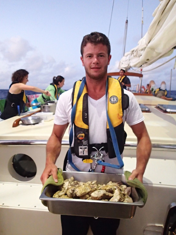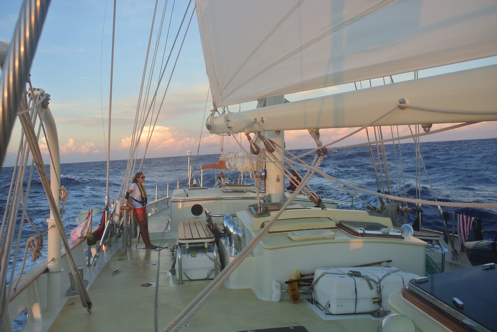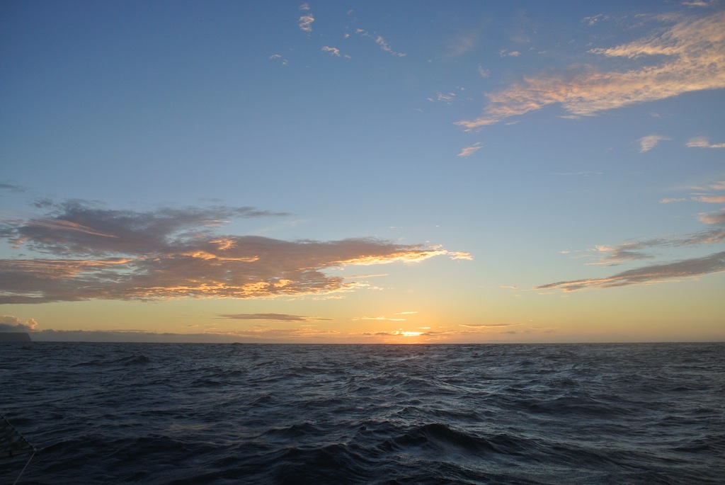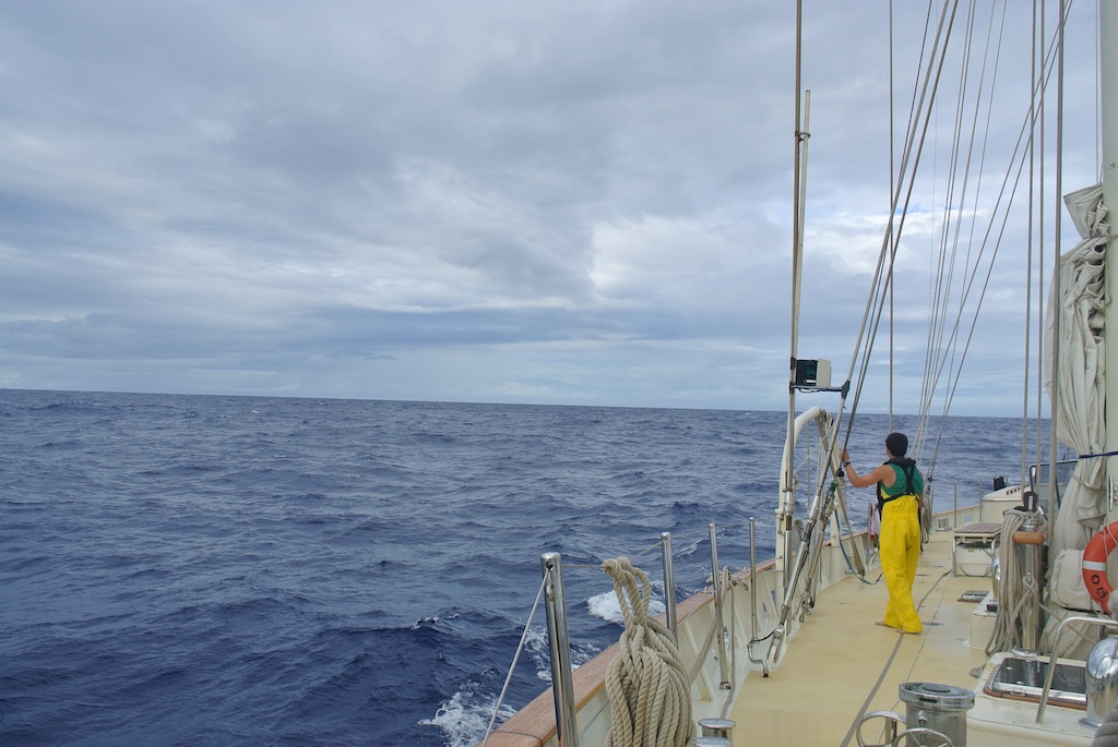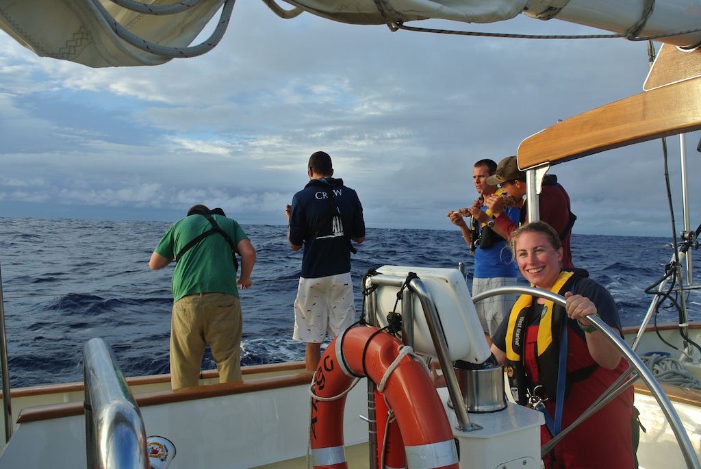 Another beautiful day at sea! The sun came out today, the wind and the waves died down a little bit, and it’s actually been incredibly pleasant. We passed the island of Nui, the first land any of us have seen in days. It didn’t look very interesting, to be honest. Very flat, and apparently, there’s not a whole lot there. It’s Captain Sam’s birthday today! Alex made some awesome BLTs for lunch, and then Sam took over the galley to whip up some phenomenal legs of lamb with roasted broccoli, sweet potatoes, cauliflower, onions, parsnips, and pumpkin. Probably the best underway dinner we’ve had yet. For squeeze, I asked everybody what they thought Sam would be doing today if he had never started sailing. Most everybody agreed he would be some kind of mountain climber or kite surfing instructor. To top off dinner, Girl Sam and RJ put together a double-decker monster of a cake that gave everyone the biggest sugar rush of their lives, which was good because pretty much every dish on the boat had to be cleaned. Spirits were high, and the weather was good, so my team’s eight to midnight watch was a pretty good time. We had DJ Dead Girl live in the cockpit for throwback hour, playing all of your favorite nineties jams late into the night. Dancing was done; a blast was had. Tomorrow we’ll cross the second deepest trench in the world, the international dateline, and we should arrive in Tonga.