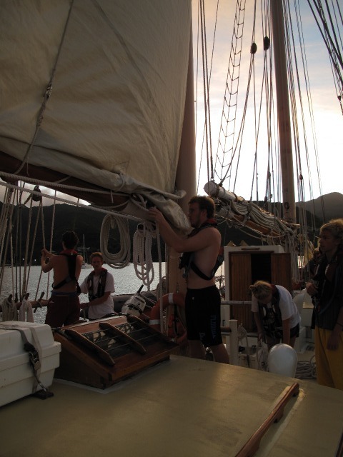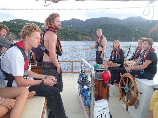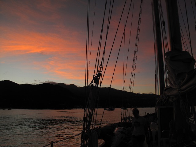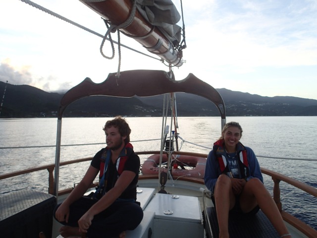 We started the day at 5:15 am. We got up so early so we could see the sunrise while sailing away. We also wanted to start this passage early so that we would make it to Antigua before sunset. Today, instead of anchoring or mooring, as we usually do, we are docking at English Harbour once we get there. Personally for me, it was pretty hard to get up, but everyone was in a good mood. We got the sails and the anchor up in record time! Being the skipper during passage can be somewhat demanding because you have to lead the boat check after passage prep and make sure everything is falling in place. You are also in charge of reminding people what to do. However, this morning, it went smoothly. After we lifted the anchor, it was watch team 3’s turn to start watches during passage. I was team leader, which means I could relieve watch teams 1 and 2 from the deck. They could go back to bed to get some more sleep. Or they could hang around on deck, maybe get some breakfast, or just enjoy the early morning. After ten epic hours of sailing, we managed to arrive at Antigua with more than enough time to dock in the sunlight.