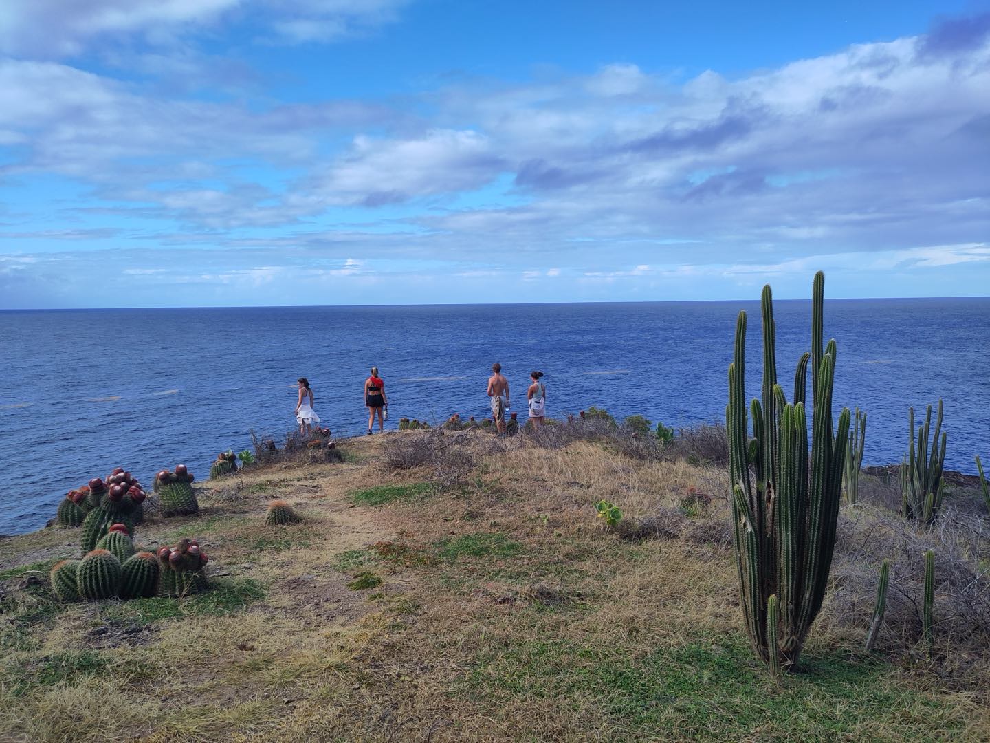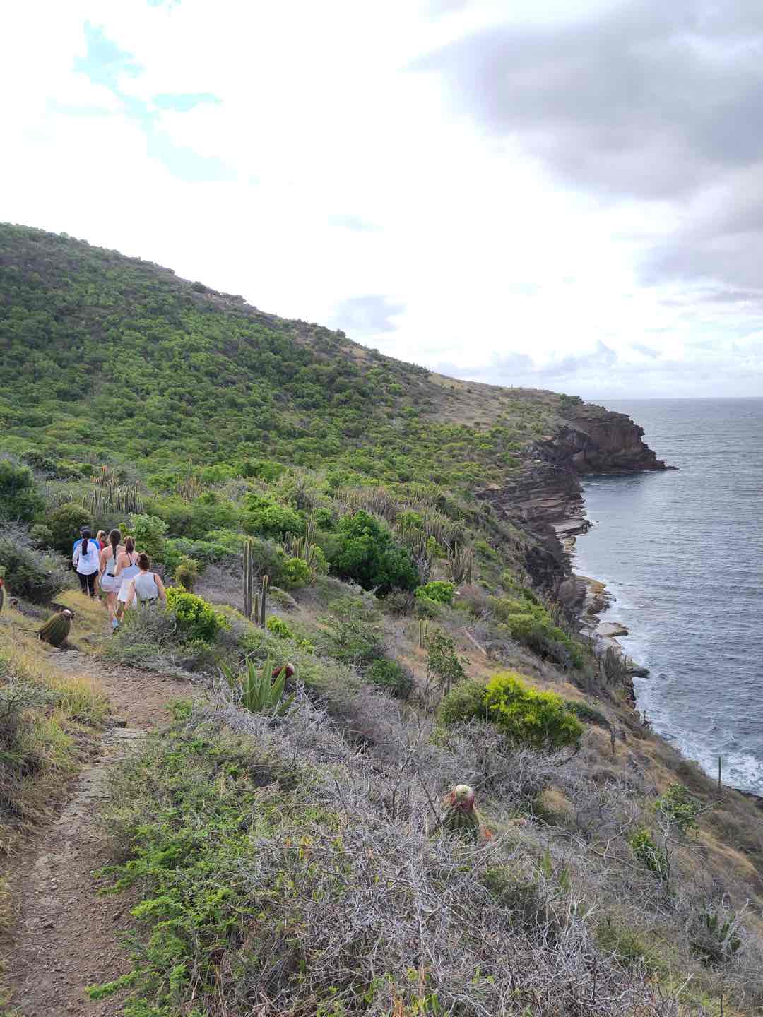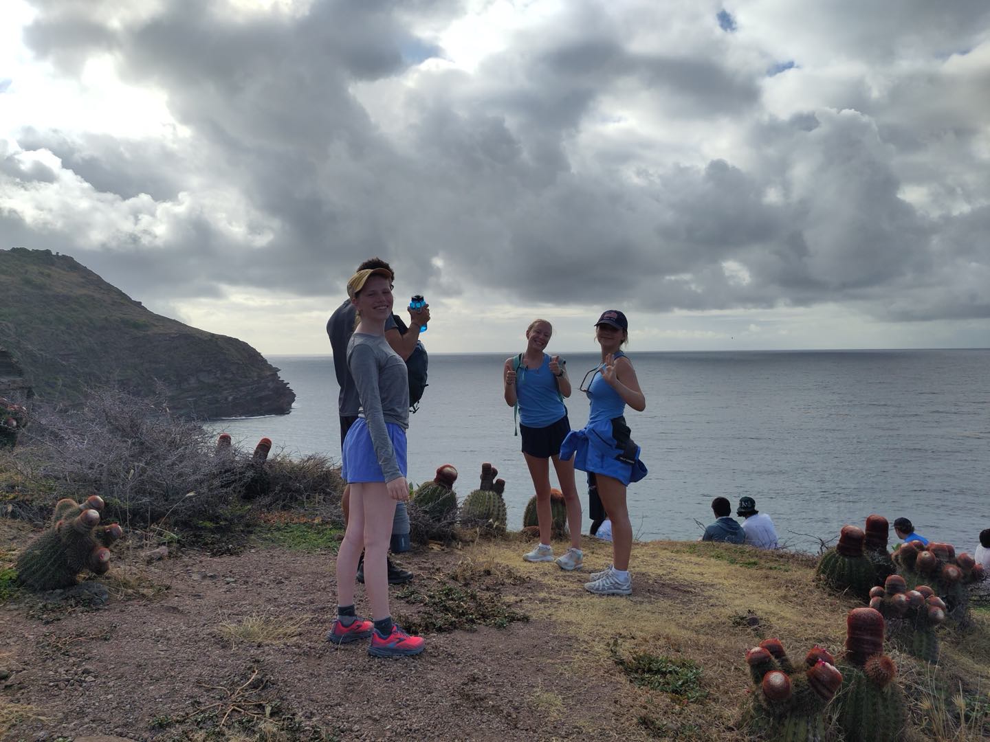 This morning started on a rainy note when my bunkmates voice eased me out of my slumber The hike may be off because of the rain. Fortunately, the forecast lent us some sunshine for a hike on the cliffs of English Harbor, blessing my eyes but also straining my legs. The views were more than enough to make up for it, and the banana bread gave us the fuel to hike up the steep incline, recover from stick-bug scares, and actively participate in our first oceanography lecture at the peak of the cliffs. After we got back, the diving trainees worked on developing their skills by the shore, while the certified divers did whatever their heart desired, whether that be napping after an early morning or swimming to the beach. The rain, however, decided that it had given us enough kindness, with the constantly changing weather comparable to a game night with my family. But, while the on and off rain may have drenched our drying laundry before we could think of the word damp, the rain did not crush our spirits, but instead strengthened them. After our first nautical science lecture in the cockpit, the trainees finally practiced dives in the deep water, escaping the waves and the rain by going underwater. Simultaneously, the certified divers snorkeled, seeing the likes of a sea turtle taking a nap just like me earlier in the day an eagle ray, and a nurse shark. After this, we took our daily ocean showers and shared some of our favorite places over some good soup. The night is still young, of course. We have a dive planning lesson after dinner, and who knows what the evening could bring Goodnight, sleep tight, and dont let the bed bugs bite!