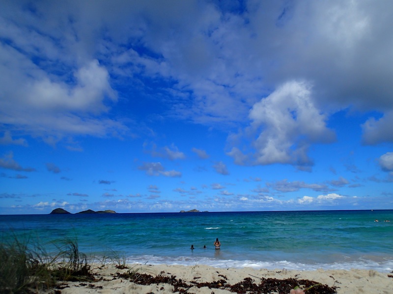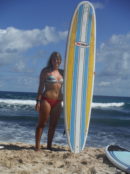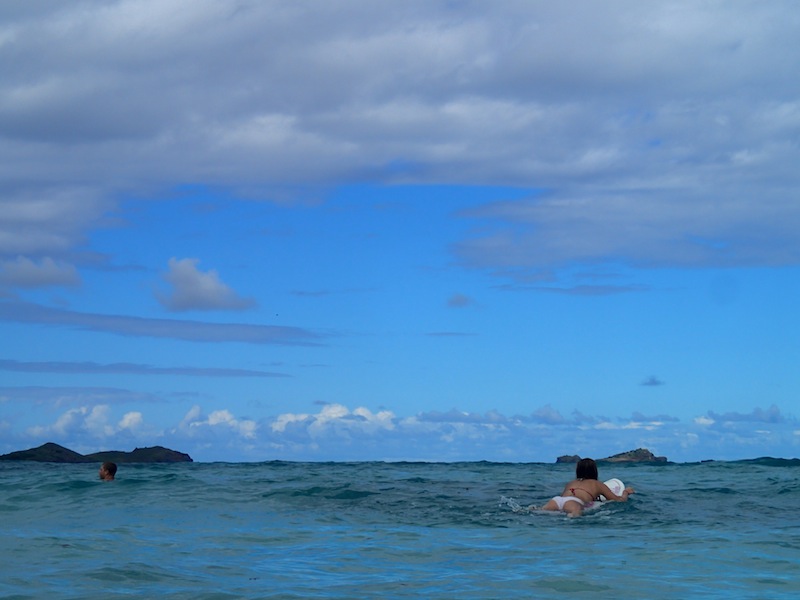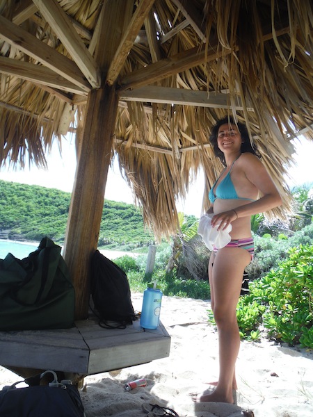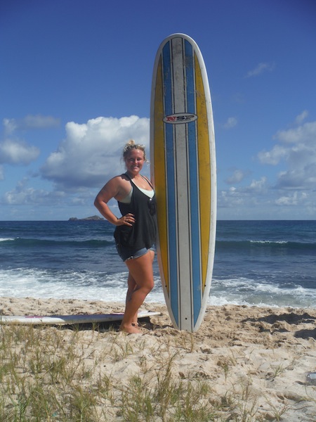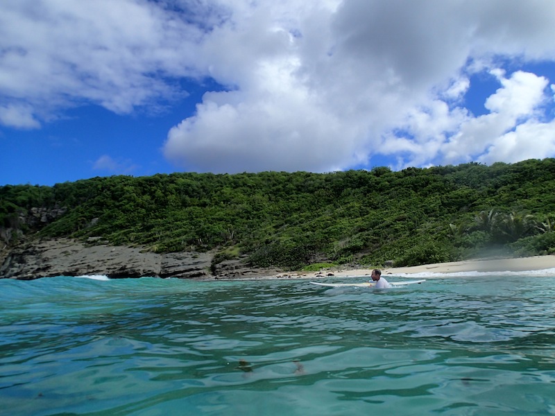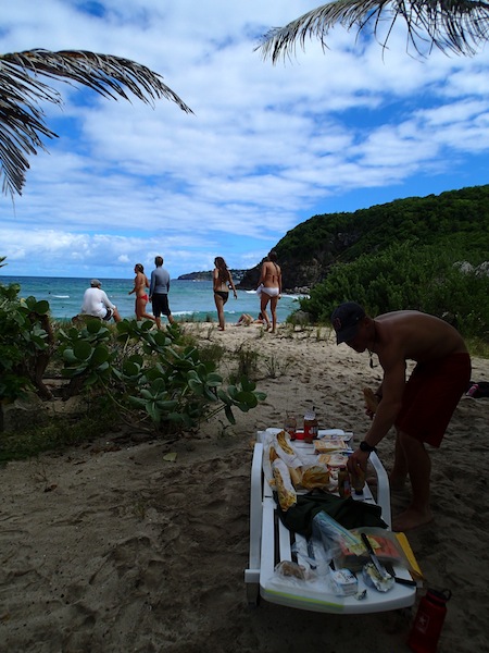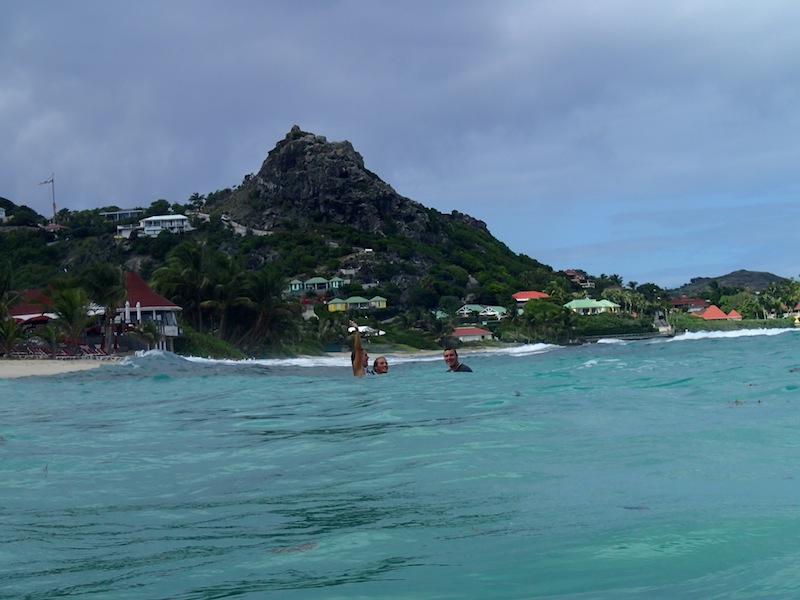 Our day started out with breakfast onboard. We ate with a view of St. Barths and a plan to go surfing. Captain Kris went to rent us a car and some surfboards, and then we loaded up and headed to the beach. After stopping at a store to stock up on French bread for lunch, we got to the beach and evaluated the waves. The beach was beautiful–a steep cliff marked the far end, and palm trees created a shady habitat for us and numerous large green lizards. The waves were quite small.