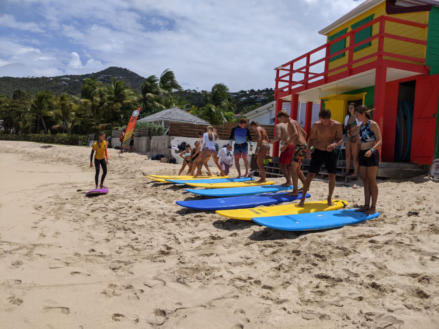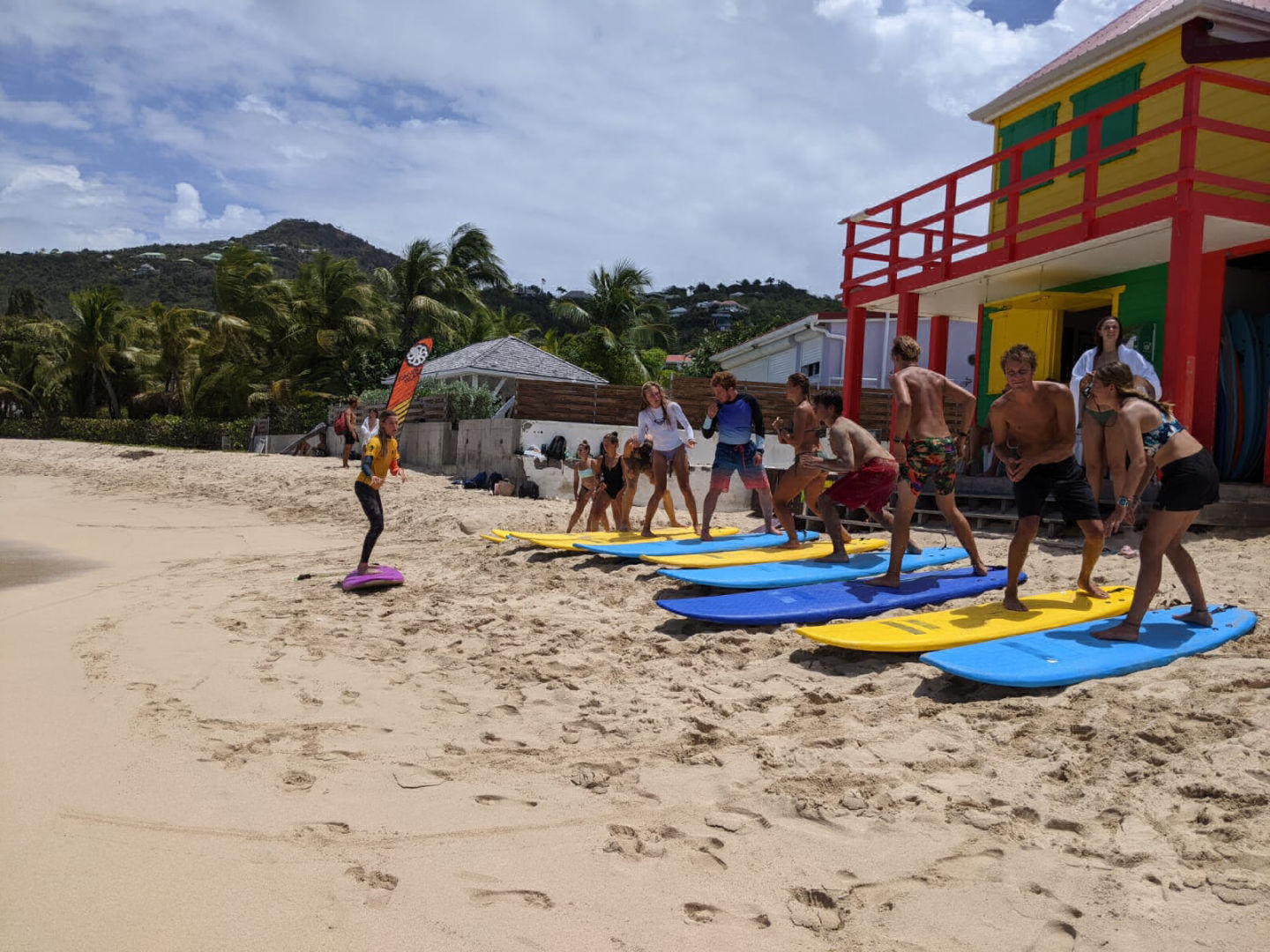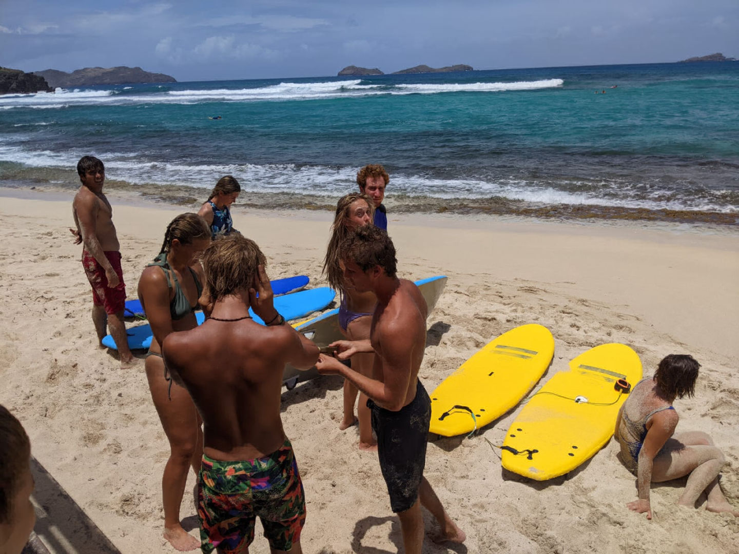 After a night off from watch which means getting a full night of uninterrupted sleep, I was woken up at 7:30 for breakfast by Heather gently waking me up, followed by her placing my exam and fish ID quiz on my bed. We had a normal morning of breakfast cleanup, and then the class, which this morning was oceanography with Sam, where we continued learning about human impacts on the ocean today. We specifically learned about climate change and how we, as humans, are the cause but can also be the solution. After class, we met up on deck for a quick brief before hopping in the dingy and going to shore for some free time exploring Gustavia before meeting at the taxi stand to go to the beach for our surfing lesson. When we got to the beach, we were early, so we enjoyed some time hanging out, and some of us decided to go for a swim before sun screening up and getting a quick land lesson on the boards. Once we all knew how to pop up on the board on land, we picked up our boards and headed for the water, where we paddled out to a bouy while we waited for our turn to catch a wave. After a few tries, I finally was able to actually stand up on the board, which was super exciting! I was able to get up three times before our lesson was over, and we headed back to the beach while it was raining. Thankfully Ash had grabbed all of our bags while we were in the water and moved them from just on the beach to being covered by the surf shack. After the rain passed, we were able to dry off. We hopped back in the taxi and headed back to town for some more shore time before we had to get back for shuttles. When we got back to town, I spent some time just walking around exploring and shopping before running into Doron, Eva, and Jules at this fancy market that was next door to a very yummy and fancy bakery. I got a small thing of blueberries and one of the raspberries, and I will certainly say that those were some of the best blueberries I have ever had. Once back on board Clara, Katie, and I jumped into cooking dinner, which was grilled cheese on homemade bread and tomato soup. While we were in the galley, the rest of the crew was up on deck doing passage prep to get ready for our sail to Saba tomorrow. After passage prep was done, Heather got back with provisions, so the focus shifted to getting all of the cold things in the fridge before dinner. We finished dinner and are now finishing up with cleanup before going back to putting away provisions. After we are done with that, I need to get to work on the fourth and final set of my log book assignment before 11:00 so that after my anchor watch, I can go to bed.
