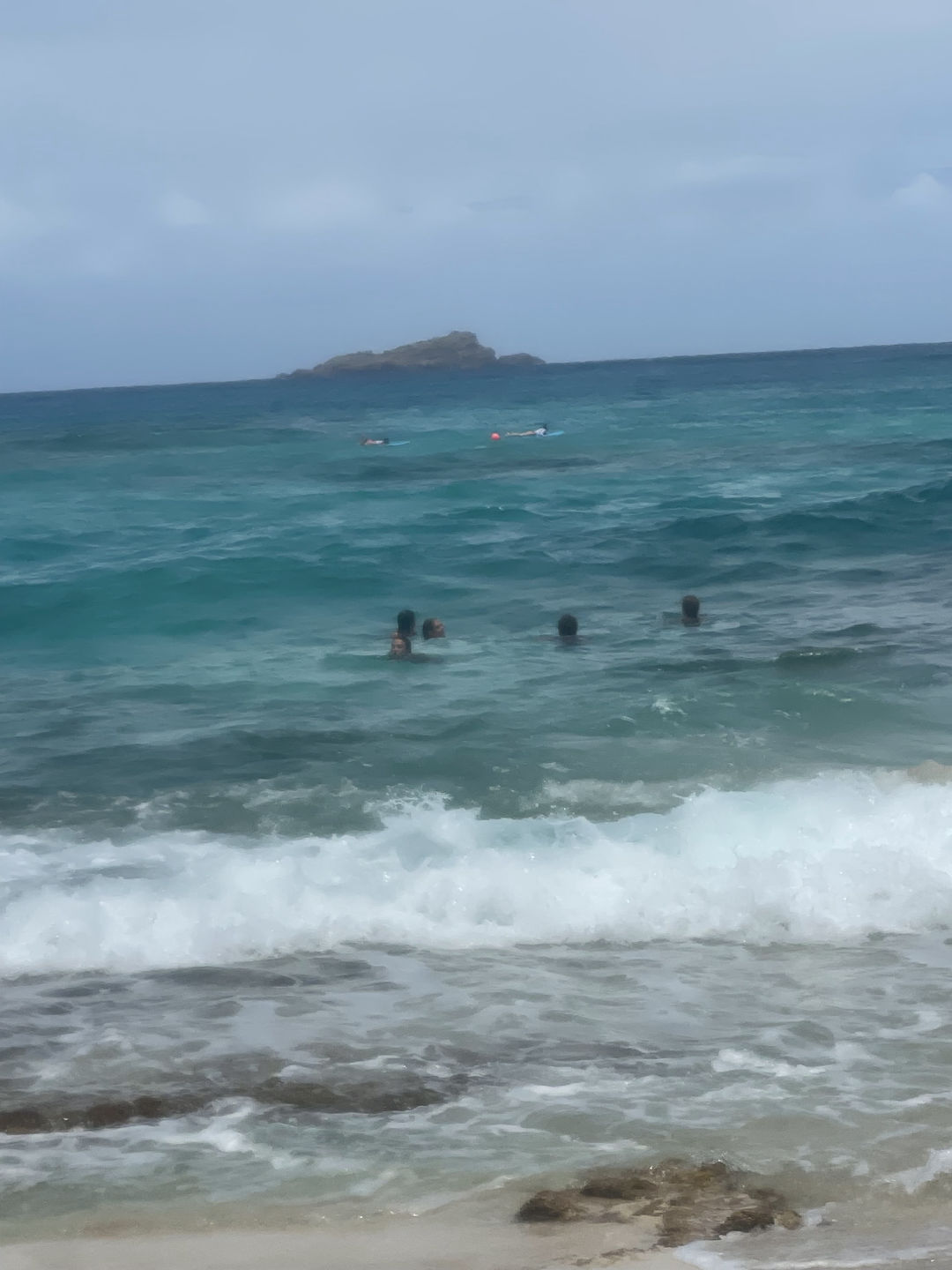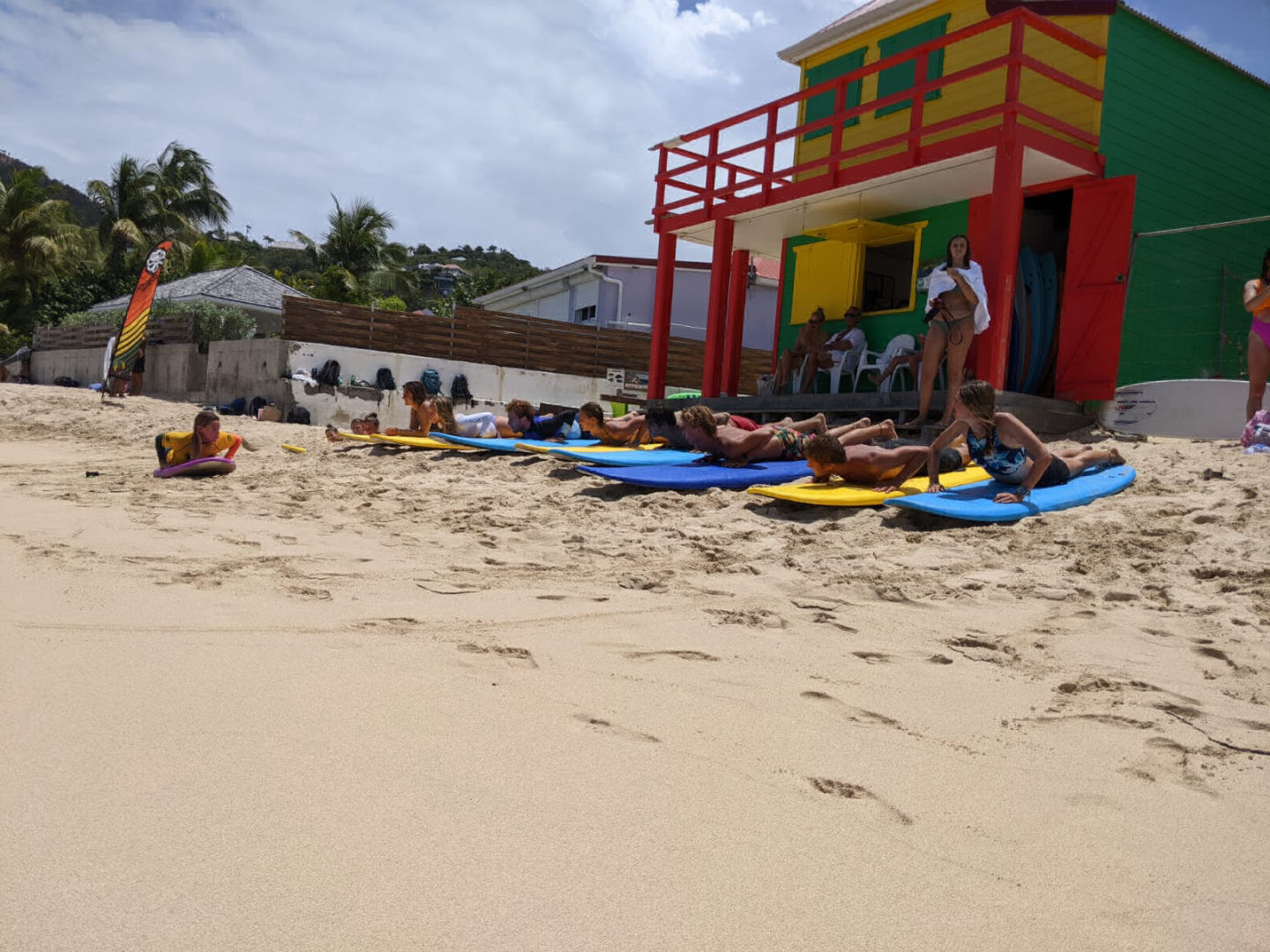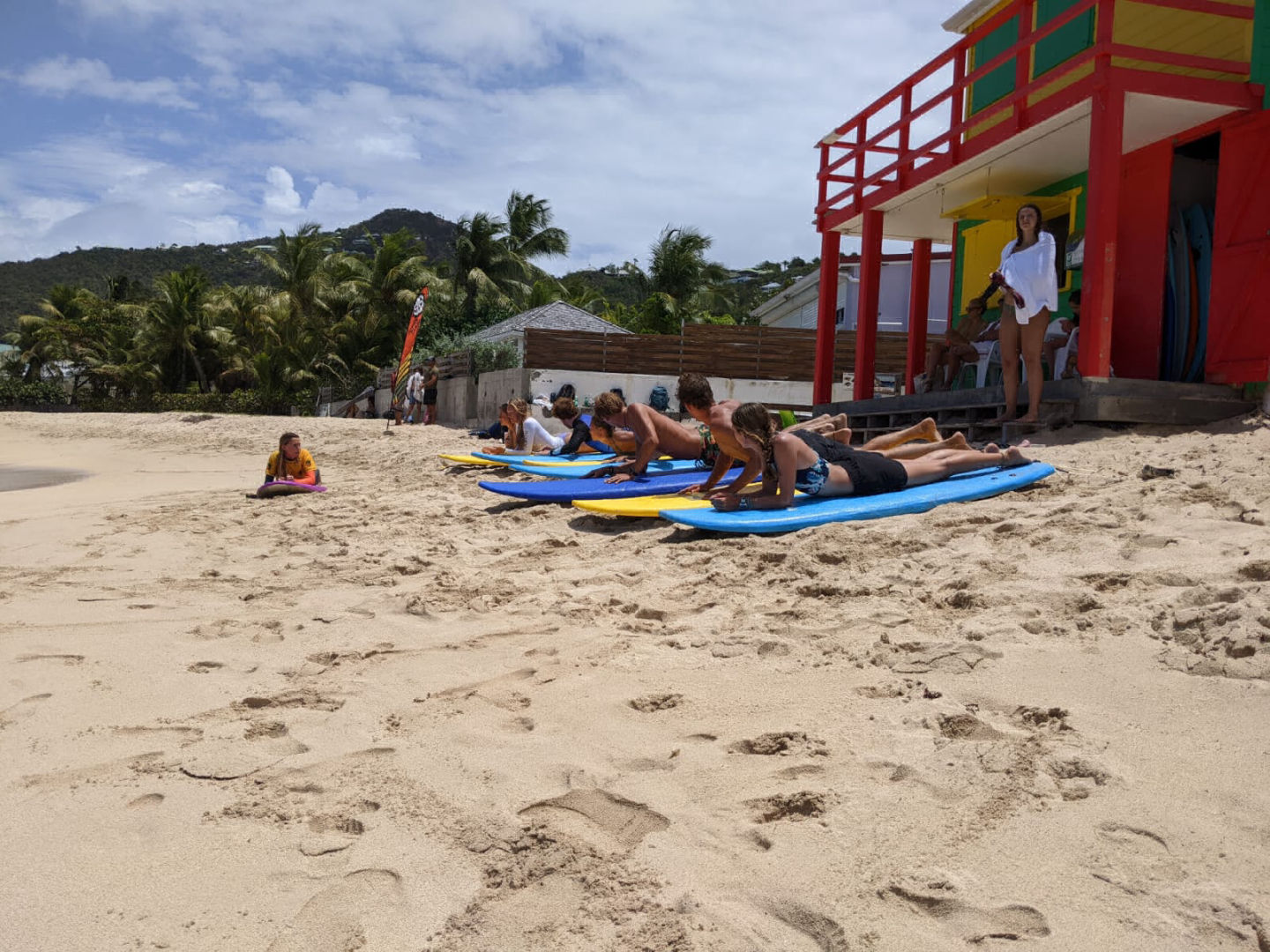After a night off from watch which means getting a full night of uninterrupted sleep, I was woken up at 7:30 for breakfast by Heather gently waking me up, followed by her placing my exam and fish ID quiz on my bed. We had a normal morning of breakfast cleanup, and then the class, which this morning was oceanography with Sam, where we continued learning about human impacts on the ocean today. We specifically learned about climate change and how we, as humans, are the cause but can also be the solution. After class, we met up on deck for a quick brief before hopping in the dingy and going to shore for some free time exploring Gustavia before meeting at the taxi stand to go to the beach for our surfing lesson. When we got to the beach, we were early, so we enjoyed some time hanging out, and some of us decided to go for a swim before sun screening up and getting a quick land lesson on the boards. Once we all knew how to pop up on the board on land, we picked up our boards and headed for the water, where we paddled out to a bouy while we waited for our turn to catch a wave. After a few tries, I finally was able to actually stand up on the board, which was super exciting! I was able to get up three times before our lesson was over, and we headed back to the beach while it was raining. Thankfully Ash had grabbed all of our bags while we were in the water and moved them from just on the beach to being covered by the surf shack. After the rain passed, we were able to dry off. We hopped back in the taxi and headed back to town for some more shore time before we had to get back for shuttles. When we got back to town, I spent some time just walking around exploring and shopping before running into Doron, Eva, and Jules at this fancy market that was next door to a very yummy and fancy bakery. I got a small thing of blueberries and one of the raspberries, and I will certainly say that those were some of the best blueberries I have ever had. Once back on board Clara, Katie, and I jumped into cooking dinner, which was grilled cheese on homemade bread and tomato soup. While we were in the galley, the rest of the crew was up on deck doing passage prep to get ready for our sail to Saba tomorrow. After passage prep was done, Heather got back with provisions, so the focus shifted to getting all of the cold things in the fridge before dinner. We finished dinner and are now finishing up with cleanup before going back to putting away provisions. After we are done with that, I need to get to work on the fourth and final set of my log book assignment before 11:00 so that after my anchor watch, I can go to bed.