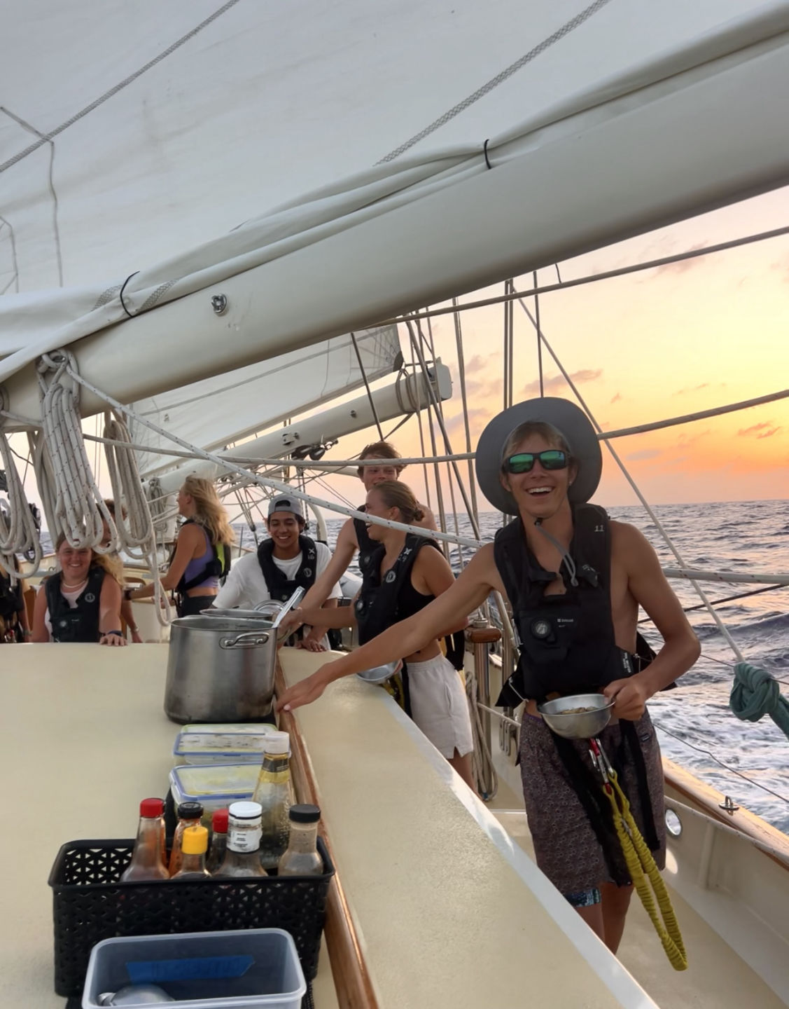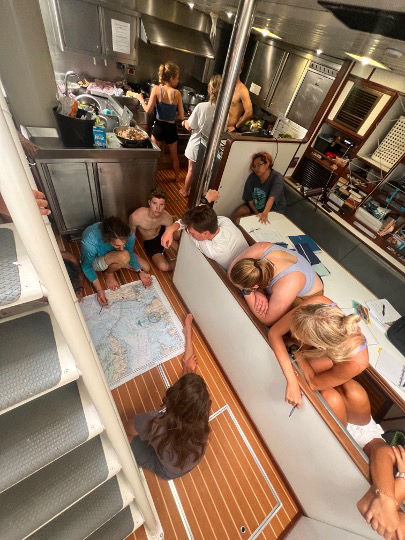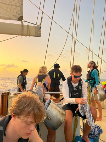Hello, it’s the Norwegian sailor again. Today, we woke up on our third day of sailing to a beautiful sunrise, good wind, and calm sea. The seasickness level is also pretty good today, meaning Micheal only threw up once this morning and has been feeling good the rest of the day. We did not see any dolphins today (Chance claims to have “seen” one this morning), but the flying fish keep impressing. In the salty pit after dinner (Aka the dishes) we all learn the Norwegian word for swamp, which is: Svampebob Firkant (now you also know:)). We also learned how to plot nautical miles and coordinates correctly in our seaman class, which is pretty cool, too. Now we have decided to start the engine and raise all the sails, so we will hopefully arrive in Bonaire tomorrow morning!! Really excited about that. Can’t wait to jump in and do an ocean shower again.