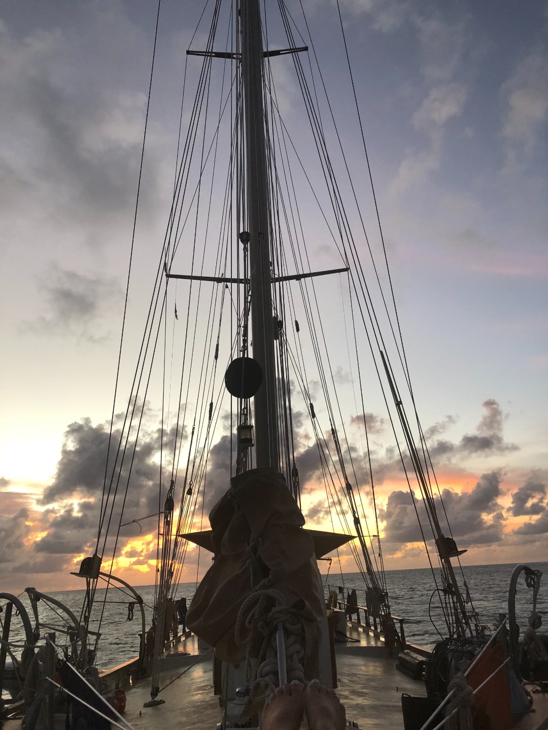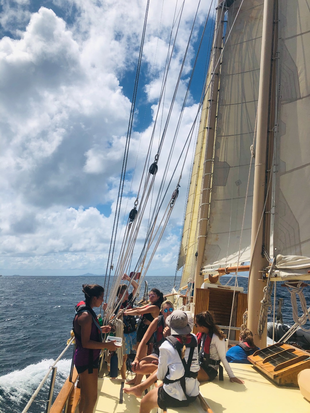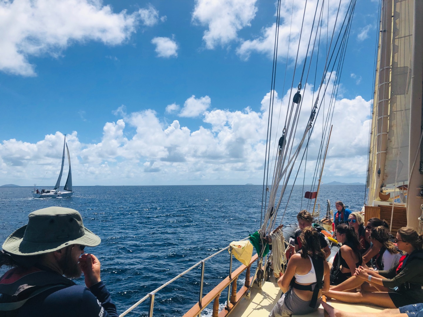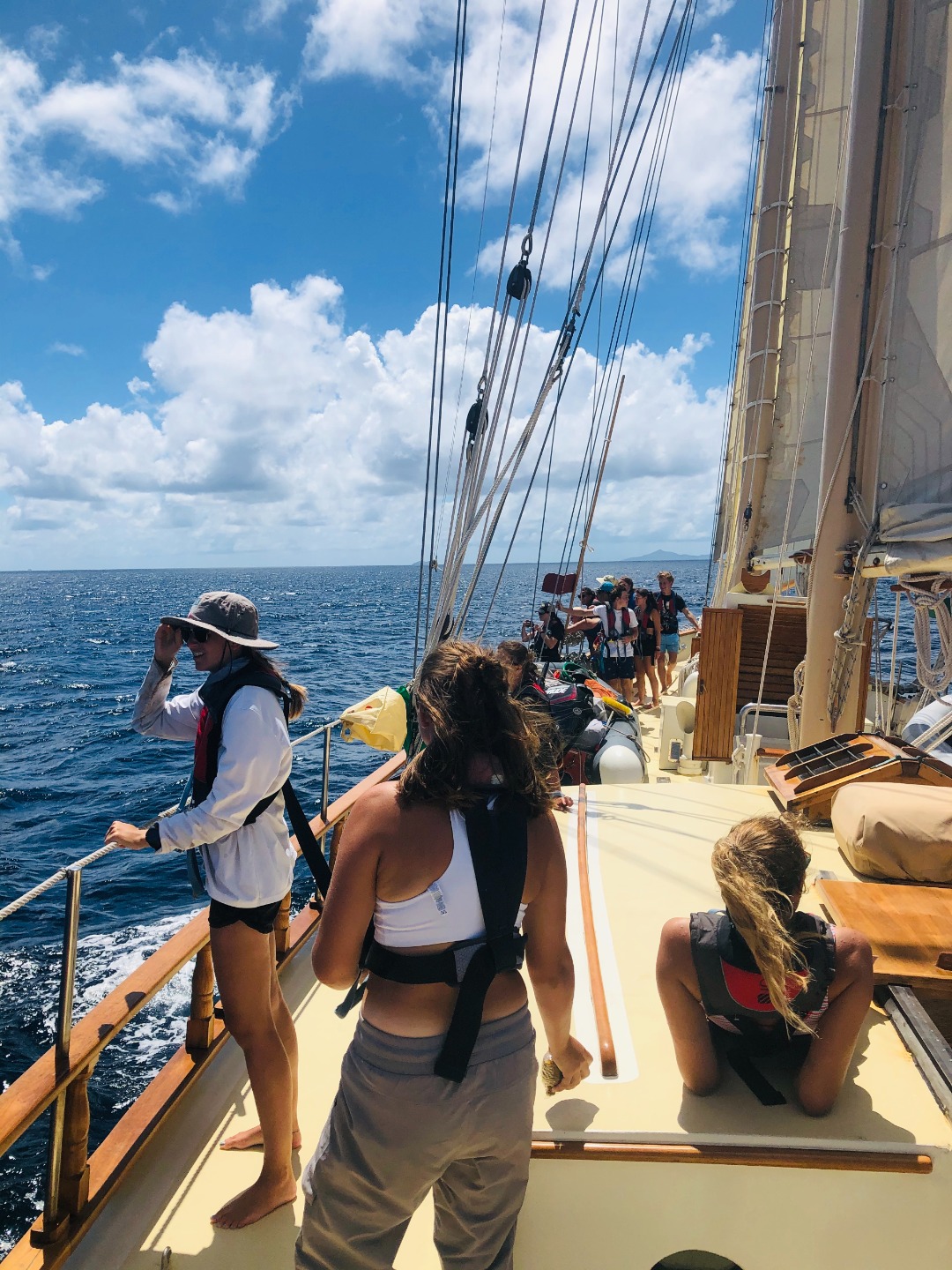 Clean-up was sped through, and the final bits of passage prep were whipped out. Soon, the main engine was rumbling away, and the metallic clinking of the anchor chain rolling in could be heard from across the bay. Margeaux was today’s flaker, neatly stacking the rode (anchor chain) as is piled into the anchor locker, earning herself a coveted spot on the chain flakers wall of fame, placing a rust-grubby thumb-print on the bulkhead above the chain box. Up till now, the setting of sails has been a deliberately slow process, taking the time to show and teach each step in its order of many. But today, the proverbial tides had a-shifted as the crew eagerly and swiftly moved from line to line without much need for instruction or explanation. The sails were set in record time, and we were able to get underway, initially heading west on a dead run before practicing our first gybe. With the new maneuver safely behind us, we set a new course south for Canouan. Twenty knots of consistent Tradewind breeze hushed us along, so we shut down the main engine and were, majestically, sailing. Soon after reaching out of the Bequia wind shadow, a call rang out along deck, “DolphinStarboard bow!” Faces soon peered over the leeward rail, and squeals of excitement peeped from our delighted onlookers. Soon after, the Jib sail was set. This advent always comes with much excitement as the job requires crawling out along the plunging bowsprit at the very head of the vessel. Water rushes past below, and the stem slices through the waves with a sense of important authority. All the while, the sail handlers Riley and Calum are perched delicately on the martingale netting, one hand on the stays while unfurling canvas and losing sail-ties with the other. Finally, the halyard is hauled on, and the sail extends up the jib-stay. On a beam to broad reach, Ocean Star is the happiest sailing. We made a steady 5.5kts for most of the day, making good time to arrive in Canouan mid-afternoon. Again the sails were struck (brought down), and the brave jib handler this time was Will. As we were finishing the jib, however, the staysail was itself just wrapped up and furled. So with a team swiftly onto the foresail (the gaff sail for which we are called a gaff-rigged schooner), we were working efficiently along when all of a sudden another team was onto the main, and down with it in moments. The smoothness of deck operations is impressive, and the crew is undoubtedly settling into the lifestyle of the sailor.