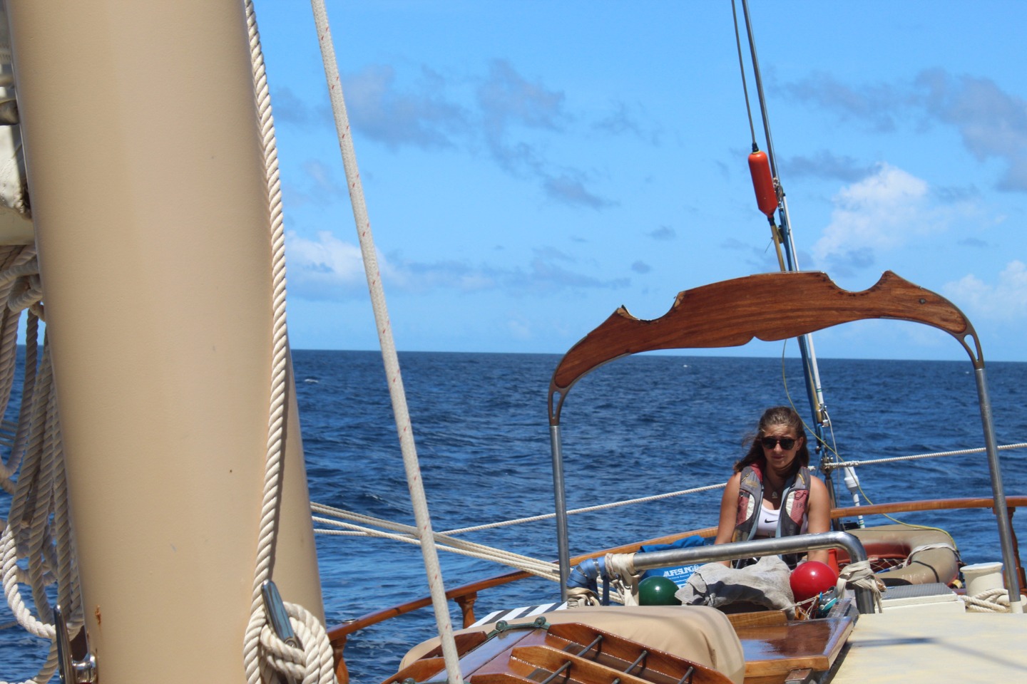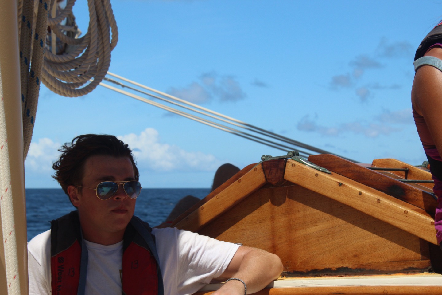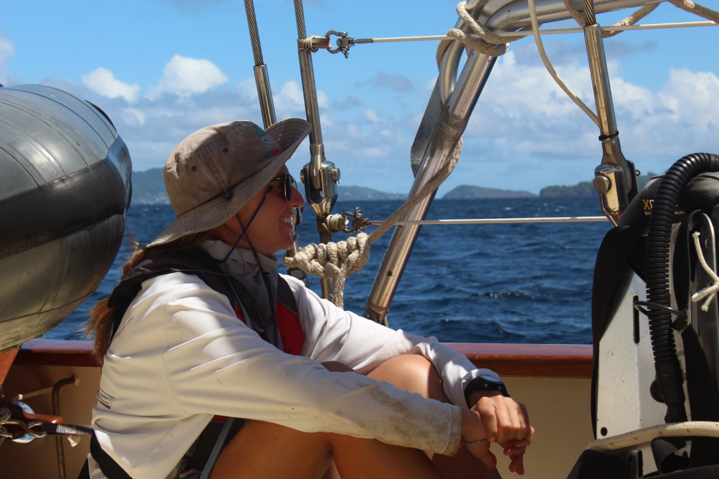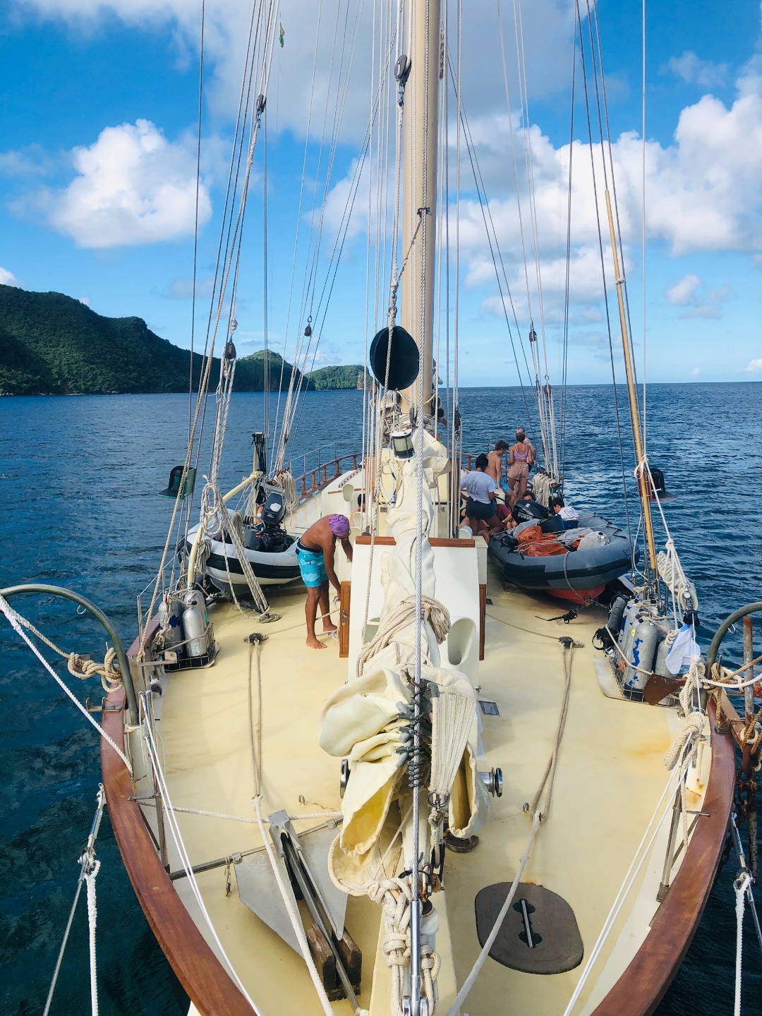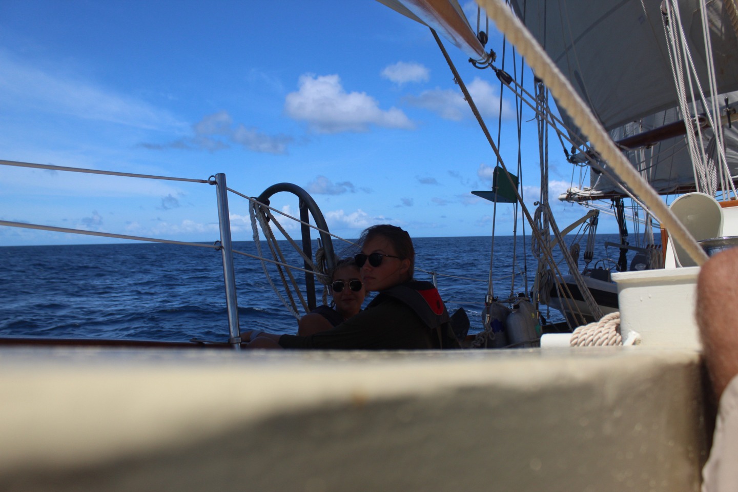 Clean-up was sped through, and the final bits of passage prep were whipped out. Soon, the main engine was rumbling away, and the metallic clinking of the anchor chain rolling in could be heard from across the bay. Margeaux was today’s flaker, neatly stacking the rode (anchor chain) as is piled into the anchor locker, earning herself a coveted spot on the chain flakers wall of fame, placing a rust-grubby thumb-print on the bulkhead above the chain box. Up till now, the setting of sails has been a deliberately slow process, taking the time to show and teach each step in its order of many. But today, the proverbial tides had a-shifted as the crew eagerly and swiftly moved from line to line without much need for instruction or explanation. The sails were set in record time, and we were able to get underway, initially heading west on a dead run before practicing our first gybe. With the new maneuver safely behind us, we set a new course south for Canouan. Twenty knots of consistent Tradewind breeze hushed us along, so we shut down the main engine and were, majestically, sailing. Soon after reaching out of the Bequia wind shadow, a call rang out along deck, “DolphinStarboard bow!” Faces soon peered over the leeward rail, and squeals of excitement peeped from our delighted onlookers. Soon after, the Jib sail was set. This advent always comes with much excitement as the job requires crawling out along the plunging bowsprit at the very head of the vessel. Water rushes past below, and the stem slices through the waves with a sense of important authority. All the while, the sail handlers Riley and Calum are perched delicately on the martingale netting, one hand on the stays while unfurling canvas and losing sail-ties with the other. Finally, the halyard is hauled on, and the sail extends up the jib-stay. On a beam to broad reach, Ocean Star is the happiest sailing. We made a steady 5.5kts for most of the day, making good time to arrive in Canouan mid-afternoon. Again the sails were struck (brought down), and the brave jib handler this time was Will. As we were finishing the jib, however, the staysail was itself just wrapped up and furled. So with a team swiftly onto the foresail (the gaff sail for which we are called a gaff-rigged schooner), we were working efficiently along when all of a sudden another team was onto the main, and down with it in moments. The smoothness of deck operations is impressive, and the crew is undoubtedly settling into the lifestyle of the sailor.