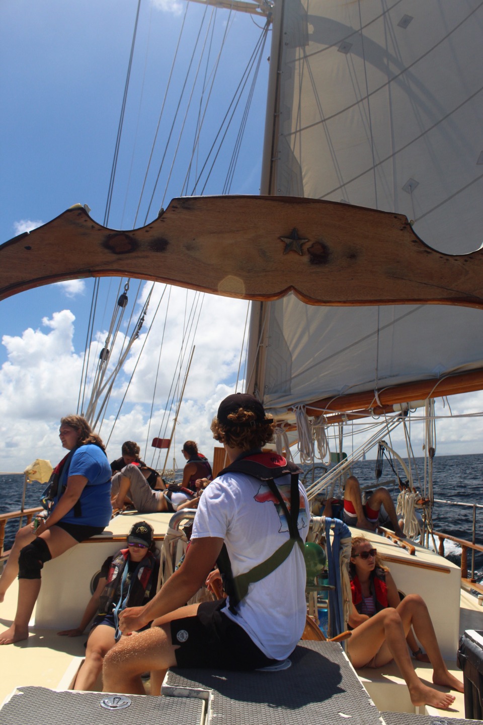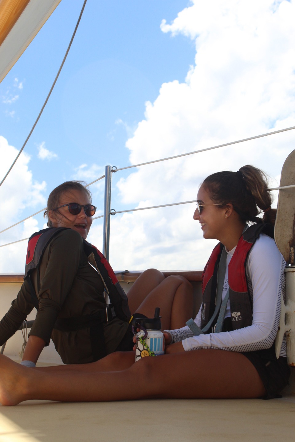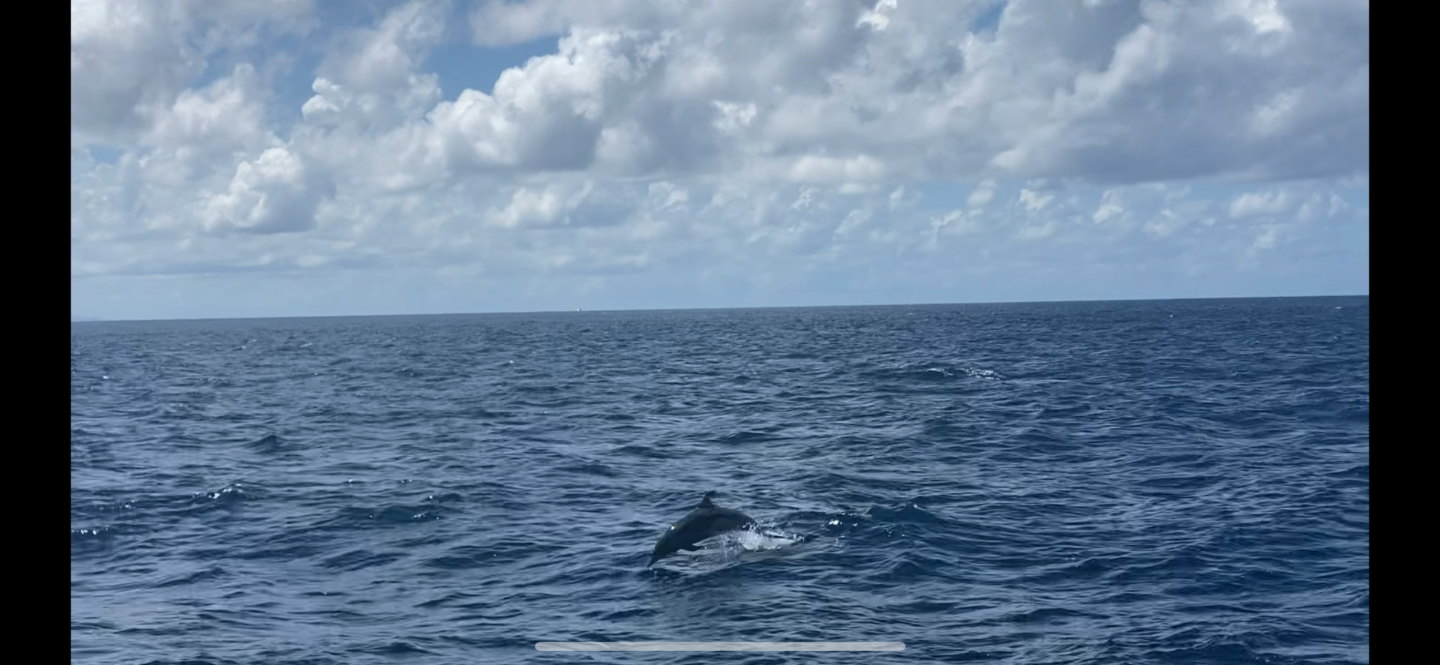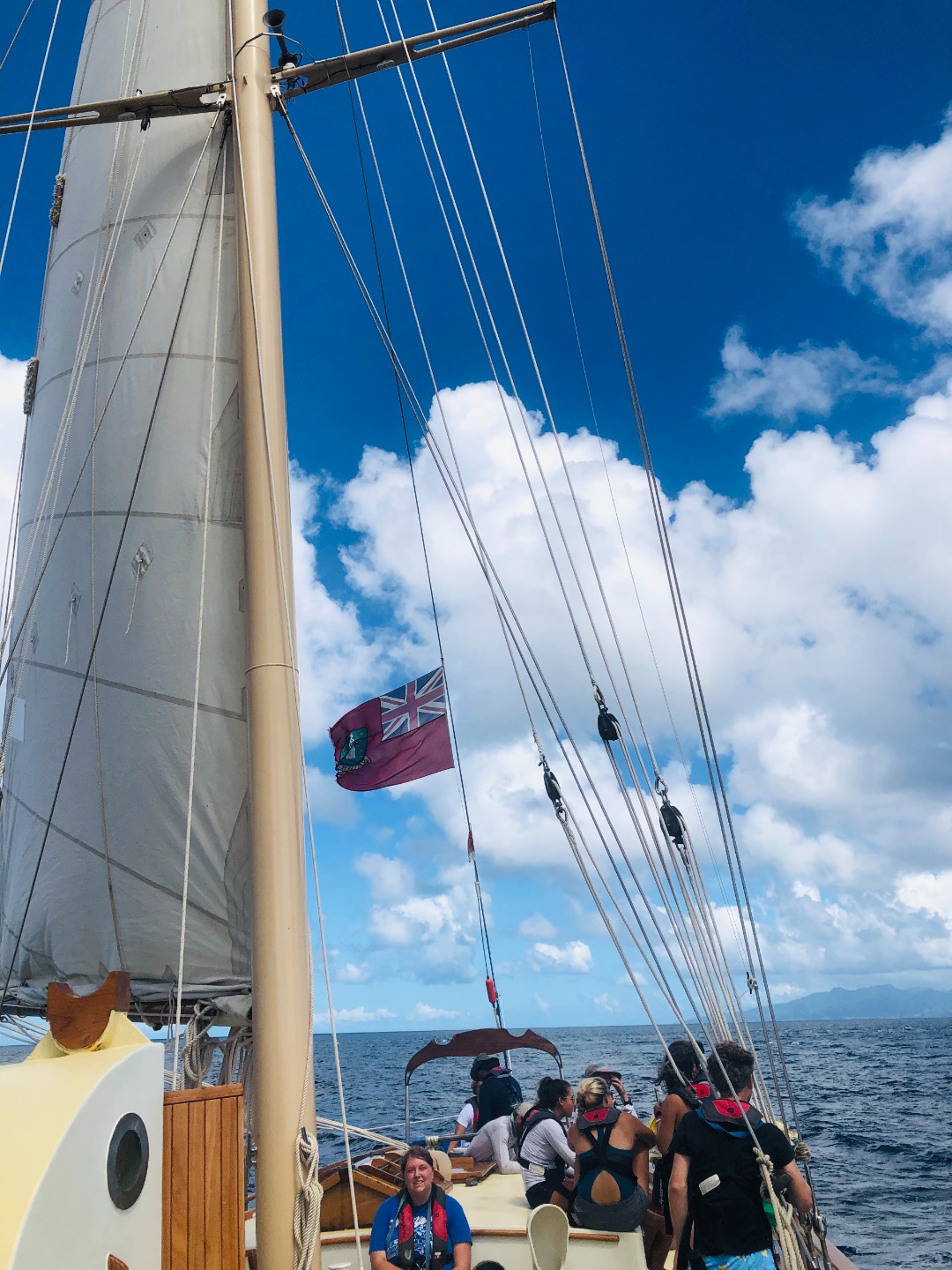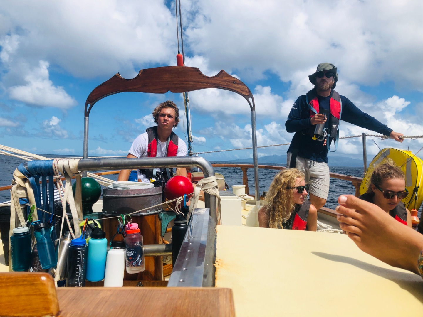 Clean-up was sped through, and the final bits of passage prep were whipped out. Soon, the main engine was rumbling away, and the metallic clinking of the anchor chain rolling in could be heard from across the bay. Margeaux was today’s flaker, neatly stacking the rode (anchor chain) as is piled into the anchor locker, earning herself a coveted spot on the chain flakers wall of fame, placing a rust-grubby thumb-print on the bulkhead above the chain box. Up till now, the setting of sails has been a deliberately slow process, taking the time to show and teach each step in its order of many. But today, the proverbial tides had a-shifted as the crew eagerly and swiftly moved from line to line without much need for instruction or explanation. The sails were set in record time, and we were able to get underway, initially heading west on a dead run before practicing our first gybe. With the new maneuver safely behind us, we set a new course south for Canouan. Twenty knots of consistent Tradewind breeze hushed us along, so we shut down the main engine and were, majestically, sailing. Soon after reaching out of the Bequia wind shadow, a call rang out along deck, “DolphinStarboard bow!” Faces soon peered over the leeward rail, and squeals of excitement peeped from our delighted onlookers. Soon after, the Jib sail was set. This advent always comes with much excitement as the job requires crawling out along the plunging bowsprit at the very head of the vessel. Water rushes past below, and the stem slices through the waves with a sense of important authority. All the while, the sail handlers Riley and Calum are perched delicately on the martingale netting, one hand on the stays while unfurling canvas and losing sail-ties with the other. Finally, the halyard is hauled on, and the sail extends up the jib-stay. On a beam to broad reach, Ocean Star is the happiest sailing. We made a steady 5.5kts for most of the day, making good time to arrive in Canouan mid-afternoon. Again the sails were struck (brought down), and the brave jib handler this time was Will. As we were finishing the jib, however, the staysail was itself just wrapped up and furled. So with a team swiftly onto the foresail (the gaff sail for which we are called a gaff-rigged schooner), we were working efficiently along when all of a sudden another team was onto the main, and down with it in moments. The smoothness of deck operations is impressive, and the crew is undoubtedly settling into the lifestyle of the sailor.