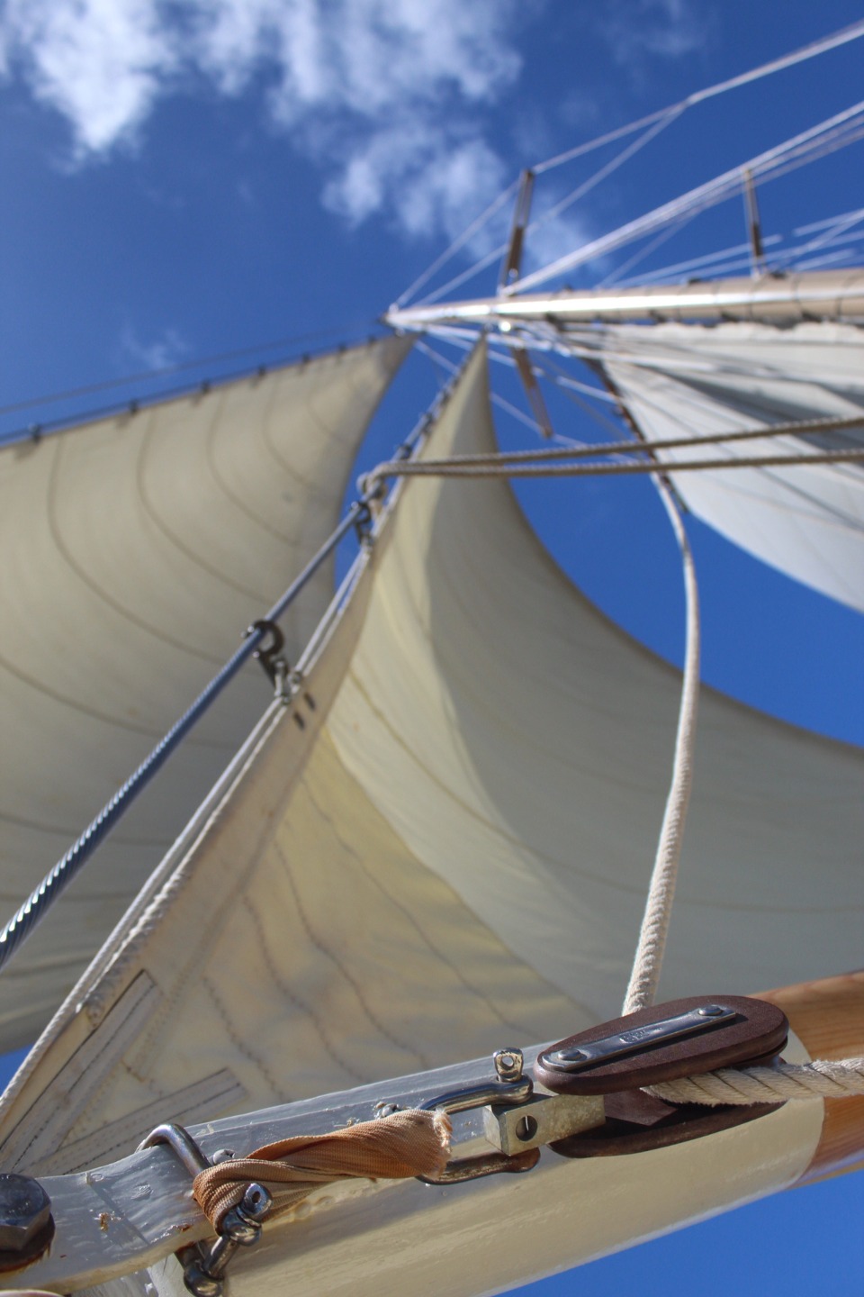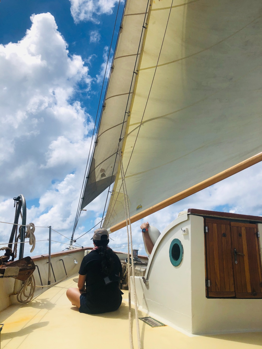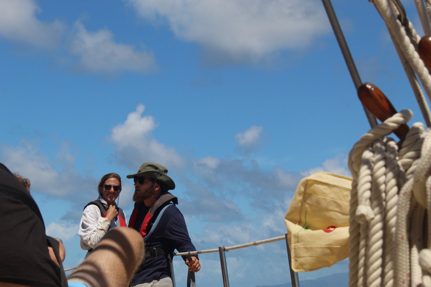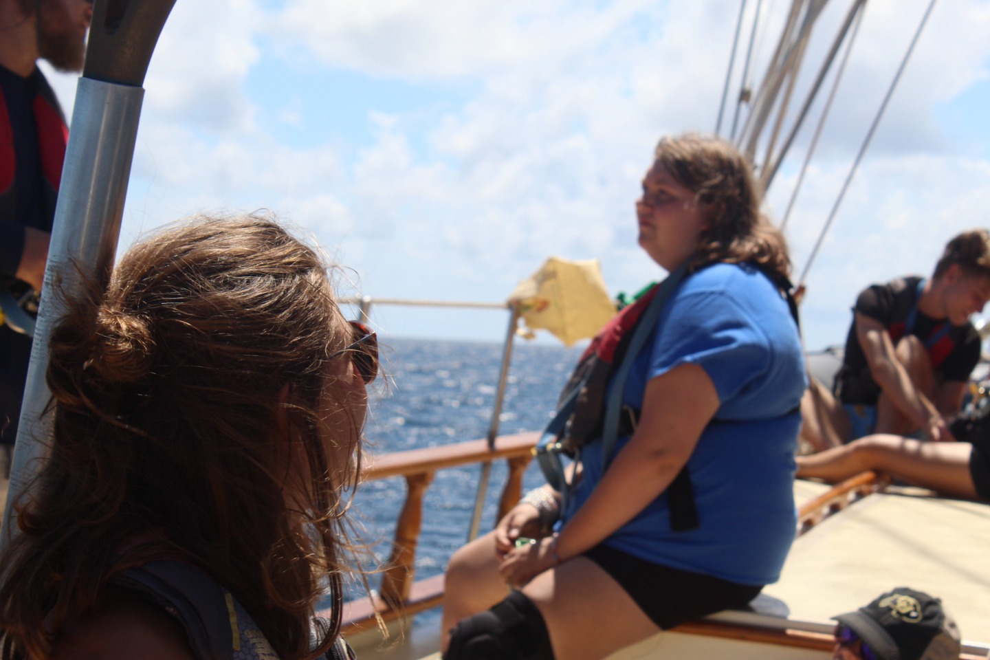 Clean-up was sped through, and the final bits of passage prep were whipped out. Soon, the main engine was rumbling away, and the metallic clinking of the anchor chain rolling in could be heard from across the bay. Margeaux was today’s flaker, neatly stacking the rode (anchor chain) as is piled into the anchor locker, earning herself a coveted spot on the chain flakers wall of fame, placing a rust-grubby thumb-print on the bulkhead above the chain box. Up till now, the setting of sails has been a deliberately slow process, taking the time to show and teach each step in its order of many. But today, the proverbial tides had a-shifted as the crew eagerly and swiftly moved from line to line without much need for instruction or explanation. The sails were set in record time, and we were able to get underway, initially heading west on a dead run before practicing our first gybe. With the new maneuver safely behind us, we set a new course south for Canouan. Twenty knots of consistent Tradewind breeze hushed us along, so we shut down the main engine and were, majestically, sailing. Soon after reaching out of the Bequia wind shadow, a call rang out along deck, “DolphinStarboard bow!” Faces soon peered over the leeward rail, and squeals of excitement peeped from our delighted onlookers. Soon after, the Jib sail was set. This advent always comes with much excitement as the job requires crawling out along the plunging bowsprit at the very head of the vessel. Water rushes past below, and the stem slices through the waves with a sense of important authority. All the while, the sail handlers Riley and Calum are perched delicately on the martingale netting, one hand on the stays while unfurling canvas and losing sail-ties with the other. Finally, the halyard is hauled on, and the sail extends up the jib-stay. On a beam to broad reach, Ocean Star is the happiest sailing. We made a steady 5.5kts for most of the day, making good time to arrive in Canouan mid-afternoon. Again the sails were struck (brought down), and the brave jib handler this time was Will. As we were finishing the jib, however, the staysail was itself just wrapped up and furled. So with a team swiftly onto the foresail (the gaff sail for which we are called a gaff-rigged schooner), we were working efficiently along when all of a sudden another team was onto the main, and down with it in moments. The smoothness of deck operations is impressive, and the crew is undoubtedly settling into the lifestyle of the sailor.