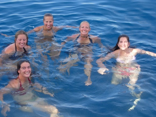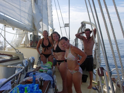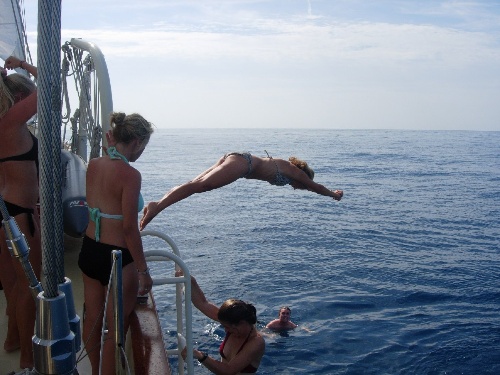 Our fantastic wind from yesterday slowly faded away. Boat speed fell, and we started motor-sailing on a flat glassy sea. Engine trouble gave the crew lots of excitement as we hove-to for our first swim in the clear blue water. Boomer soon had Argo up and running again with the get-home motor.