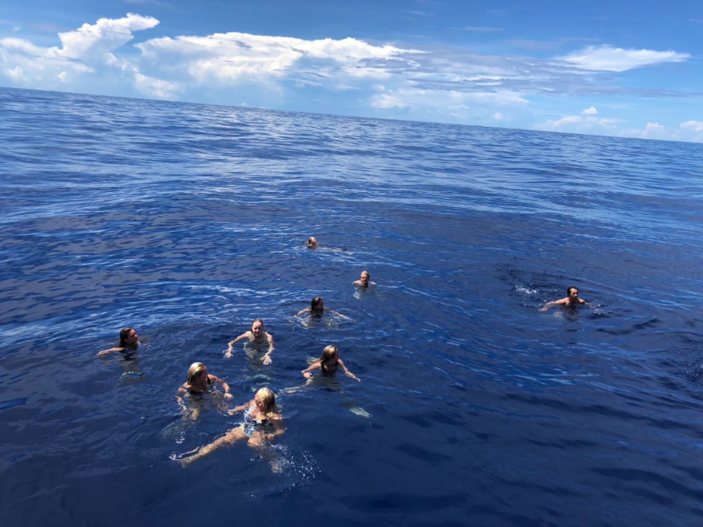 Today was a very, very chill day on passage. The seas were calm, and the sun was blazing, making for a good day to go swimming. Swimming knowing that there is three miles of water below you is a scary yet exciting feeling. Also, having ocean swells that raise you up and down make for a once-in-a-lifetime experience. While swimming, we also found some fishing line that was caught on the bottom of Vela and has turned it into bracelets. After an afternoon swim, we had lunch then a team meeting about passage and how it will be extended. With the engine off, we have had a couple of slow days sailing, and now we have added an extra 800 Nm to the passage, choosing to cut under Great Chagos for more favorable weather. With that comes some adjustments to daily life, but the crew doesn’t mind. Captain Tom says that it will be an extra 13 days approx from when we hit the trade winds, which will be most likely in the next 1-2 days. After our meeting, we had classes canceled for the day, and we had a lot of free time to do whatever we wanted ( I caught up on some much-needed sleep ). Most people hung out in the saloon with the AC on or were up on deck catching some sun. We ended the day with a great sunset and raised the mainsail to catch some expected wind tonight. I’m feeling great, and the crew is feeling great, and we are all just taking things one day at a time and making the most of them. Night watches have been uneventful but nice because it gives people a lot of time to talk. Also, the other day we caught out first fish. It was a flying fish that had blown onto the deck. We discovered him on deck at 4 am, and the crew named him Jeff. Jeff was then put in the freezer to be studied at some other time.