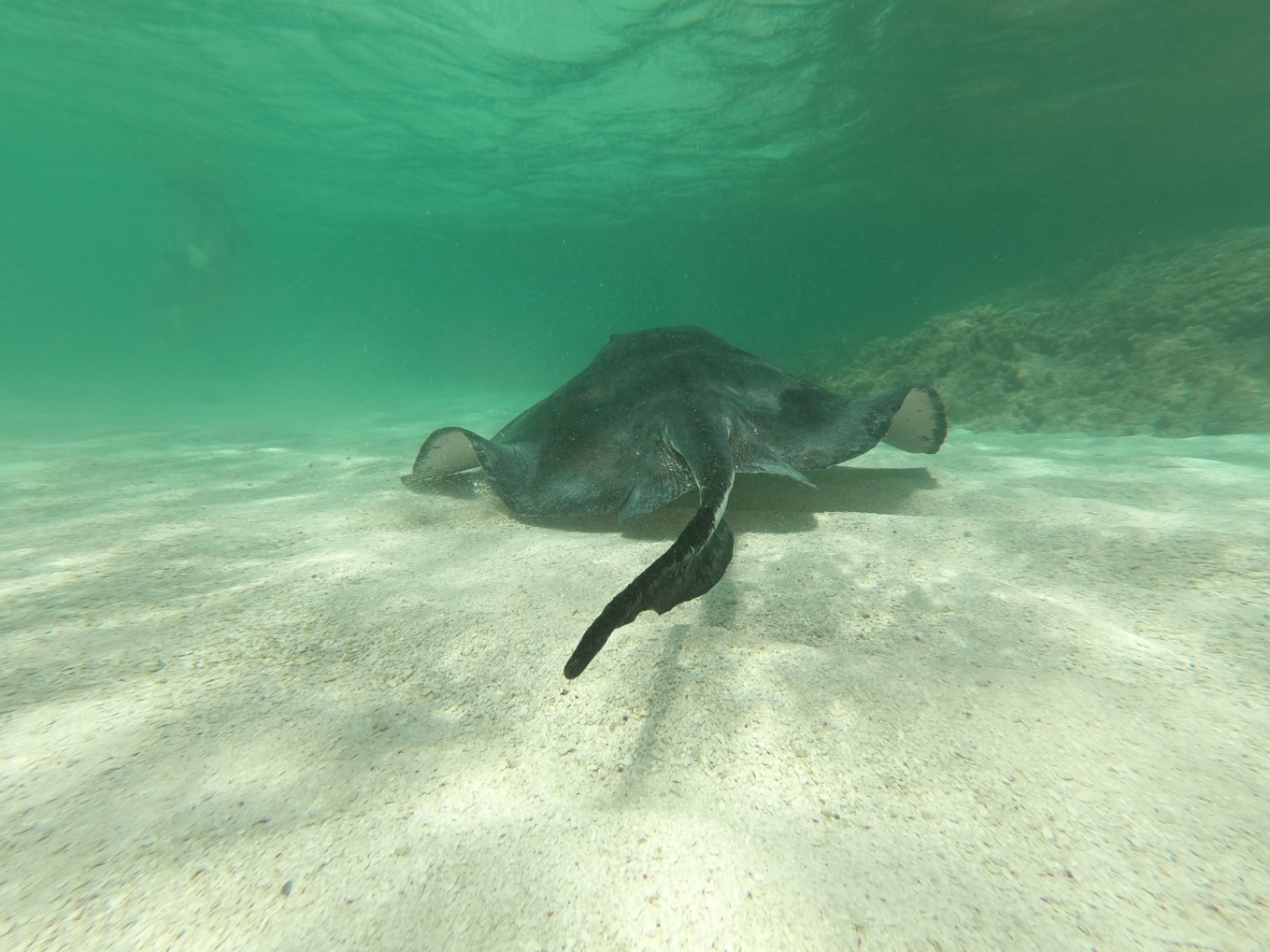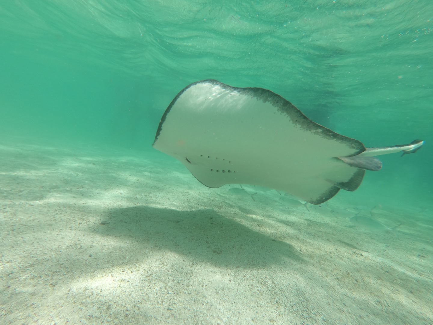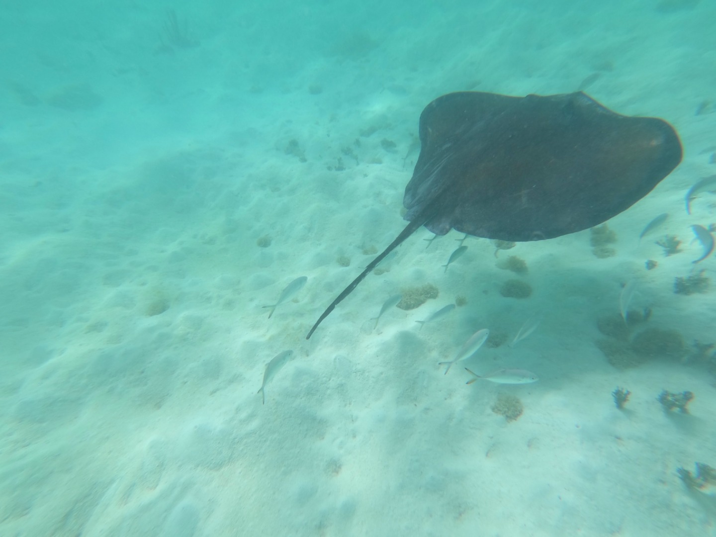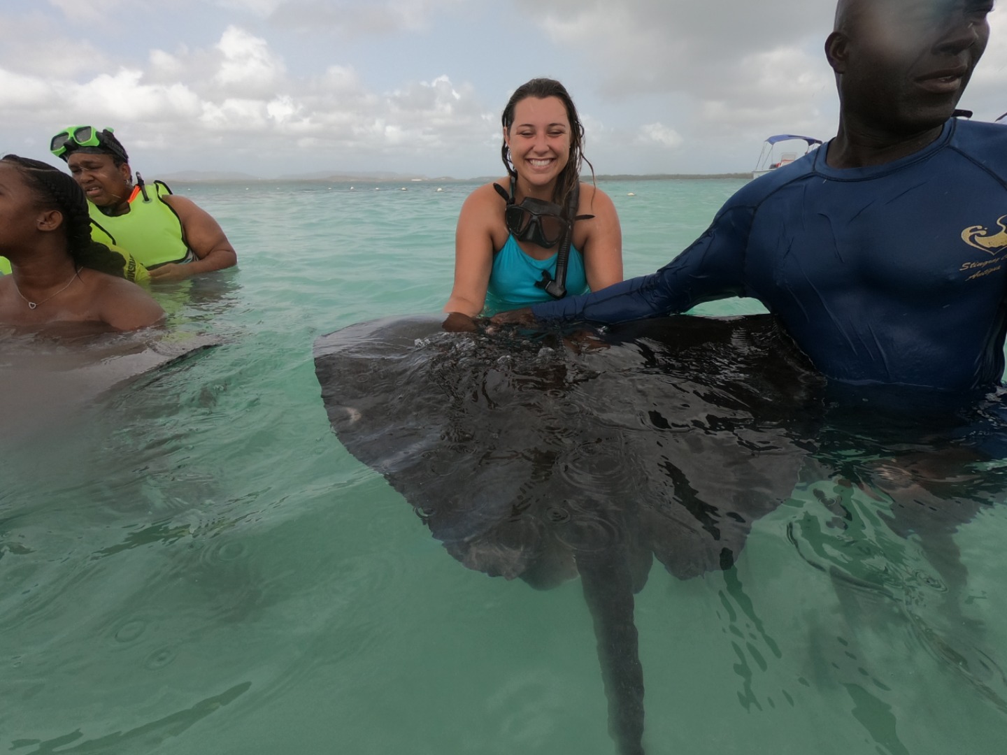 This morning was a test in crew efficiency, as we had to be packed and ready to go to Stingray City by 8:15. We almost made it, but were grateful for our taxi driver, Eric, and his patience while we scrambled to get ready for our next adventure. By 9:30, we were in the ocean, swimming with stingrays. Although we get to do amazing things every day on this trip, there doesn’t seem to be a limit to our awe. We discovered that stingrays are surprisingly friendly when you’re holding a squid in your hand and surprisingly soft, for lack of a better word, when they brush past you in the water.