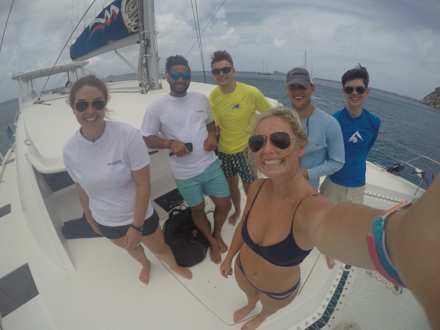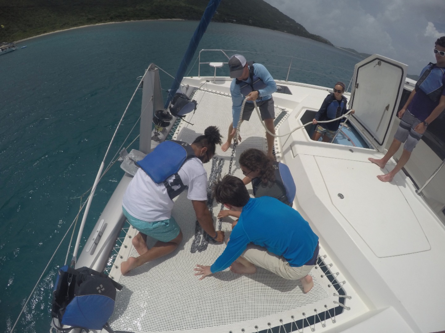 Day four of the trip (and day number 3 out on the water) began in the idyllic Savannah Bay, surrounded by an Armada of yachts flying the bright orange flag of ActionQuest, a Global Expeditions Group summer sail training program for high school age students. The associated radio chatter between said yachts made for a prompt and reliable wake-up call for the crew of Firebolt. After a quick breakfast, the group sat down to chat through the procedures and responsibilities indicated in the ship’s Station Bill. This chart on the walls throughout the boat directs staff and students to an appropriate course of action in the event of a Fire, Man Overboard, or an Abandon Ship situation. However unlikely they may be, a prudent mariner will never pass on an opportunity to conduct a drill of each and all of the above scenarios.