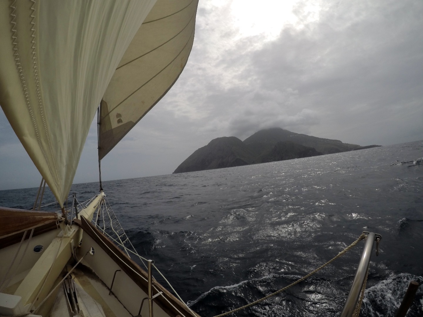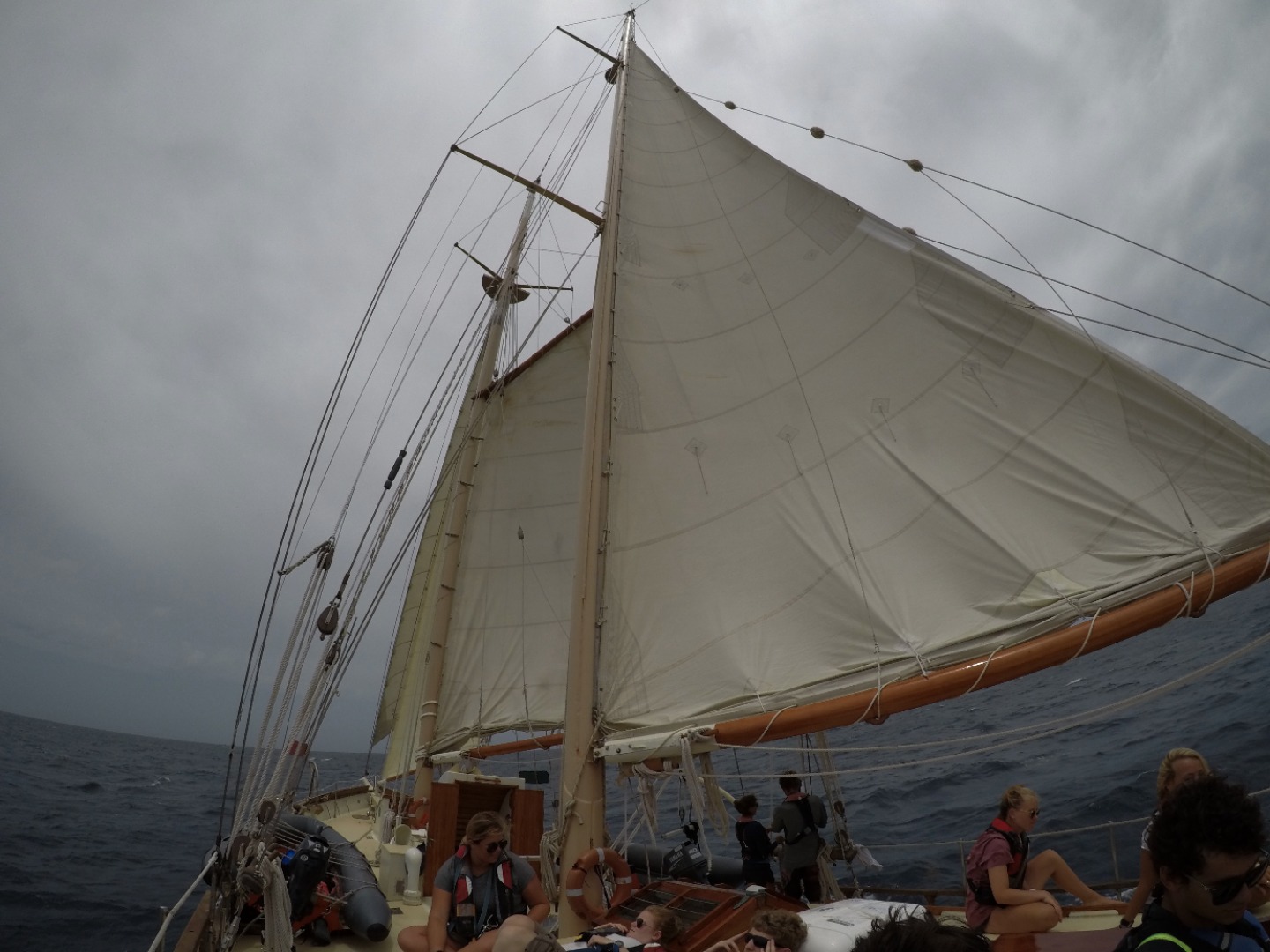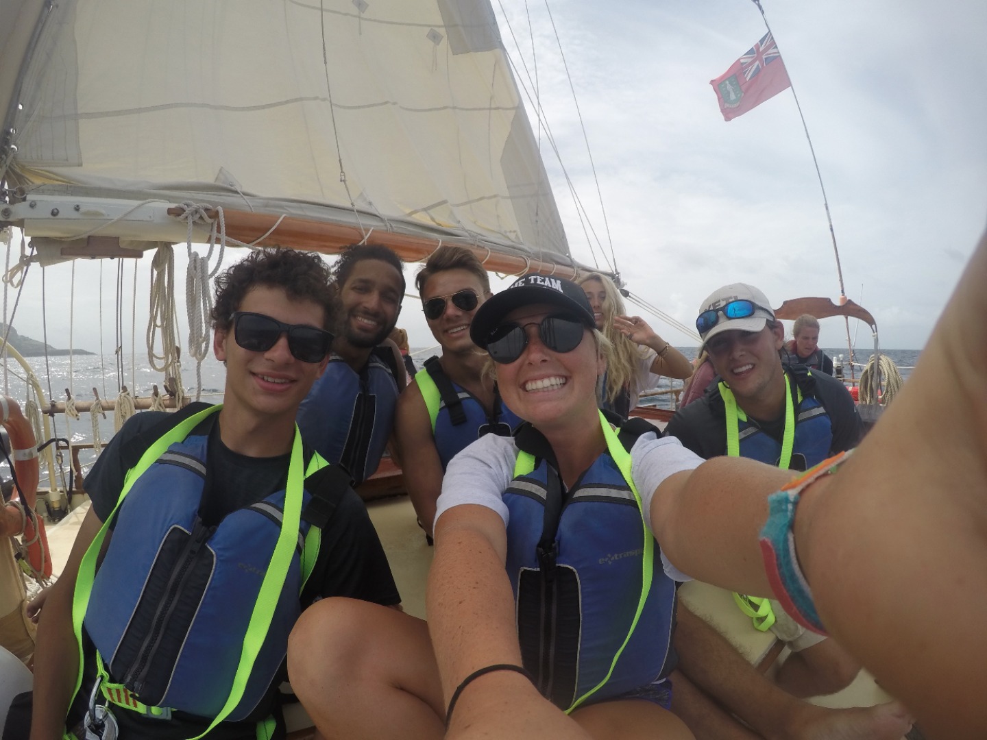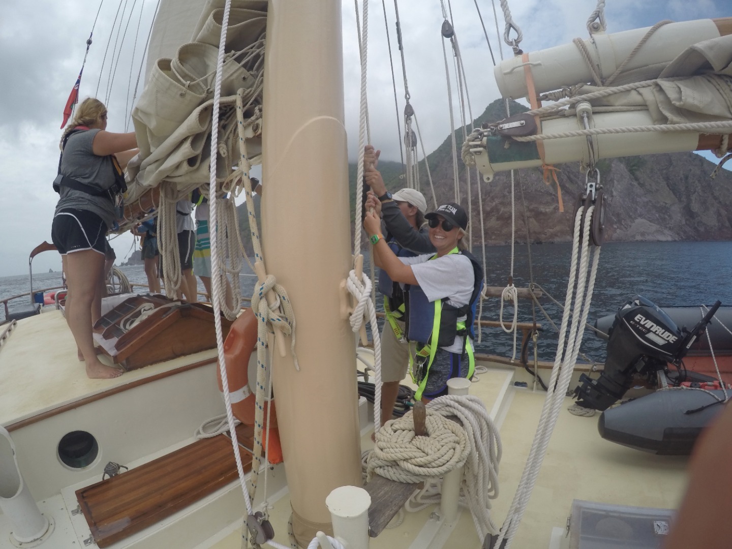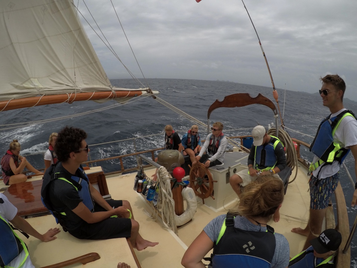 This morning we woke up to our final breakfast at St. Barth’s, cereal and fresh-cut fruit…YUM! Cleanup was swift, and then it was off to OceanStar for a final review before departing. Upon finishing our review, we swapped our homey cat, Firebolt, for the relentless classic yacht, OceanStar. Looking forward to a 6-hour passage from St. Barth’s to Saba on our new ship for the day, we quickly got our passage prep finished, got off the dock, and out of the harbor. Quickly picking up on all the new lines on O-star, we got four of the six sails up, and we were cruising towards Saba. Since we were sailing with the wind, the passage was beautifully pleasant and calm, with the exception of a few swells. For lunch, our hosts at OceanStar made us a delicious tortilla and white bean soup. The same soup, which we spilled across the deck, was due to the inconvenience of such a delicate meal combined with the motion of the ocean, but nonetheless, it was delicious. After arriving in Saba, we noticed a luxurious yacht that had run aground on the rocks; we were thankful we had our training to keep us out of that situation. It was quite a sight watching the salvage crew do what they could to piece together the once functional ship. Once we were settled and our anchor tight, we were shuttled back to our Firebolt and had a mouthwatering meal of tortellini and fresh salad. Cleaning the dishes was quick since there was nothing left of our meal. Post-cleanup, we had taken our seamanship exam. Of course, we all passed! It is getting dark, and we are watching the sunset just above the light blue water that surrounds us: Goodnight, readers of the Seamester blog. See you soon.