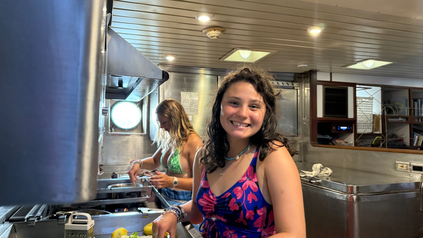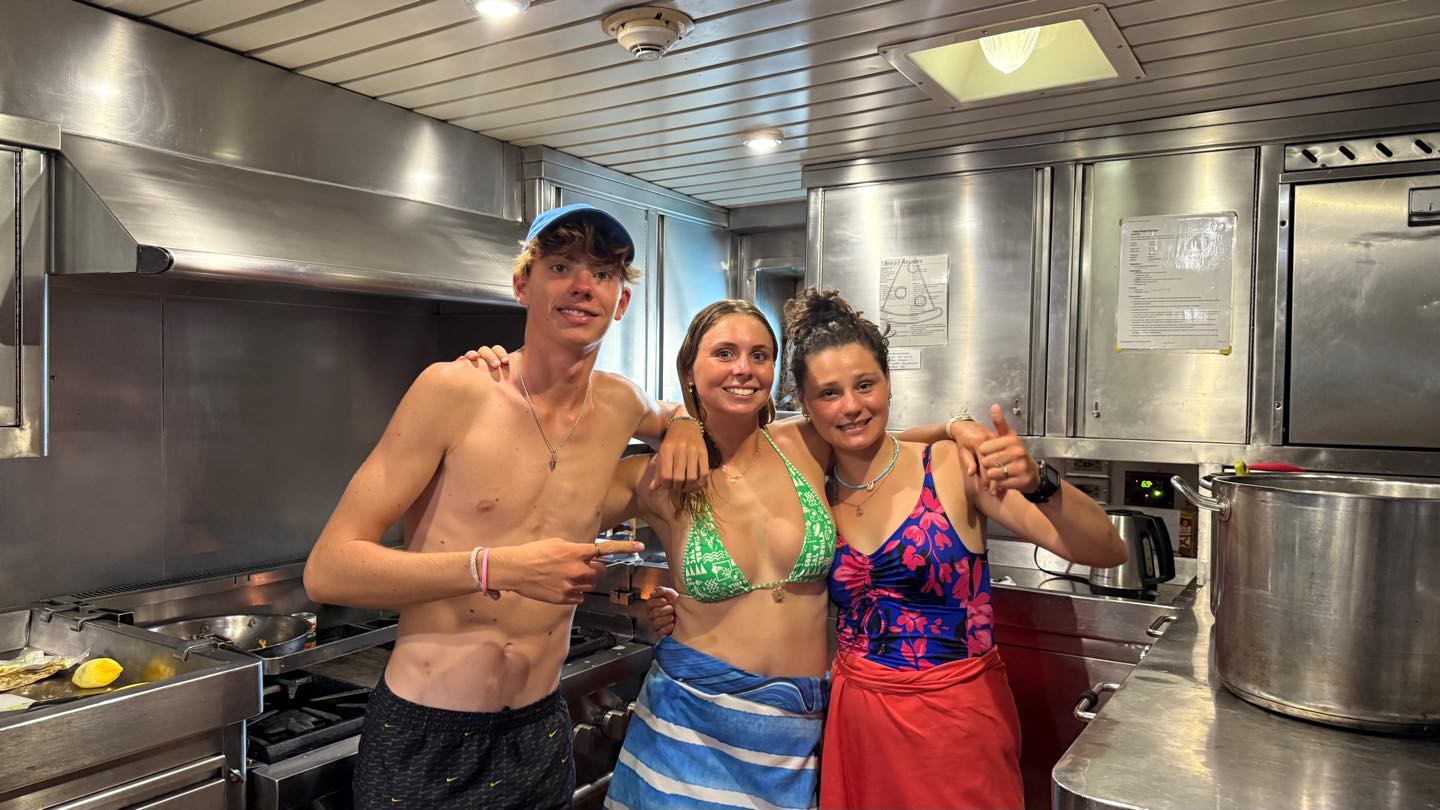 Nini, Zac, and Talia were cheffing up breakfast in the galley; Some might think that they have learned a lesson from their hot oil fried chicken session during the last revolution of the job wheel, as today’s breakfast is fresh from the freezer: Smoothie Bowls! No drying cloth or oil armor required.